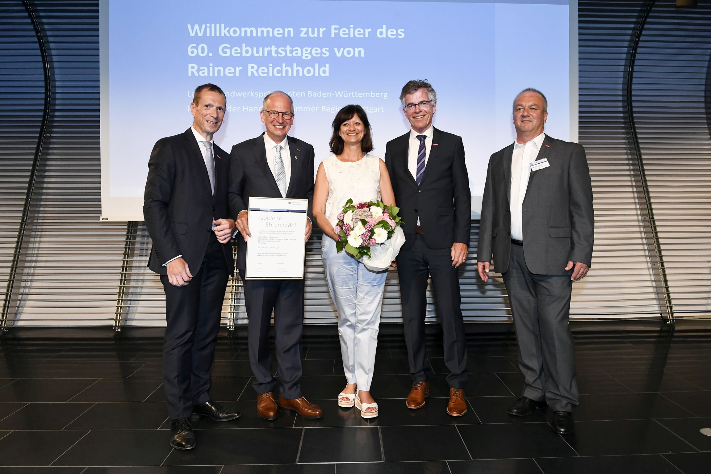 Rainer Reichhold (l.), Präsident der Handwerkskammer Region Stuttgart, überreichte zusammen mit Jan Deike (m.), Geschäftsführer Berufliche Bildung, die Ehrenurkunde an die geehrten Prüferinnen und Prüfer. / Foto: HWK / Katrin Spannblöchl