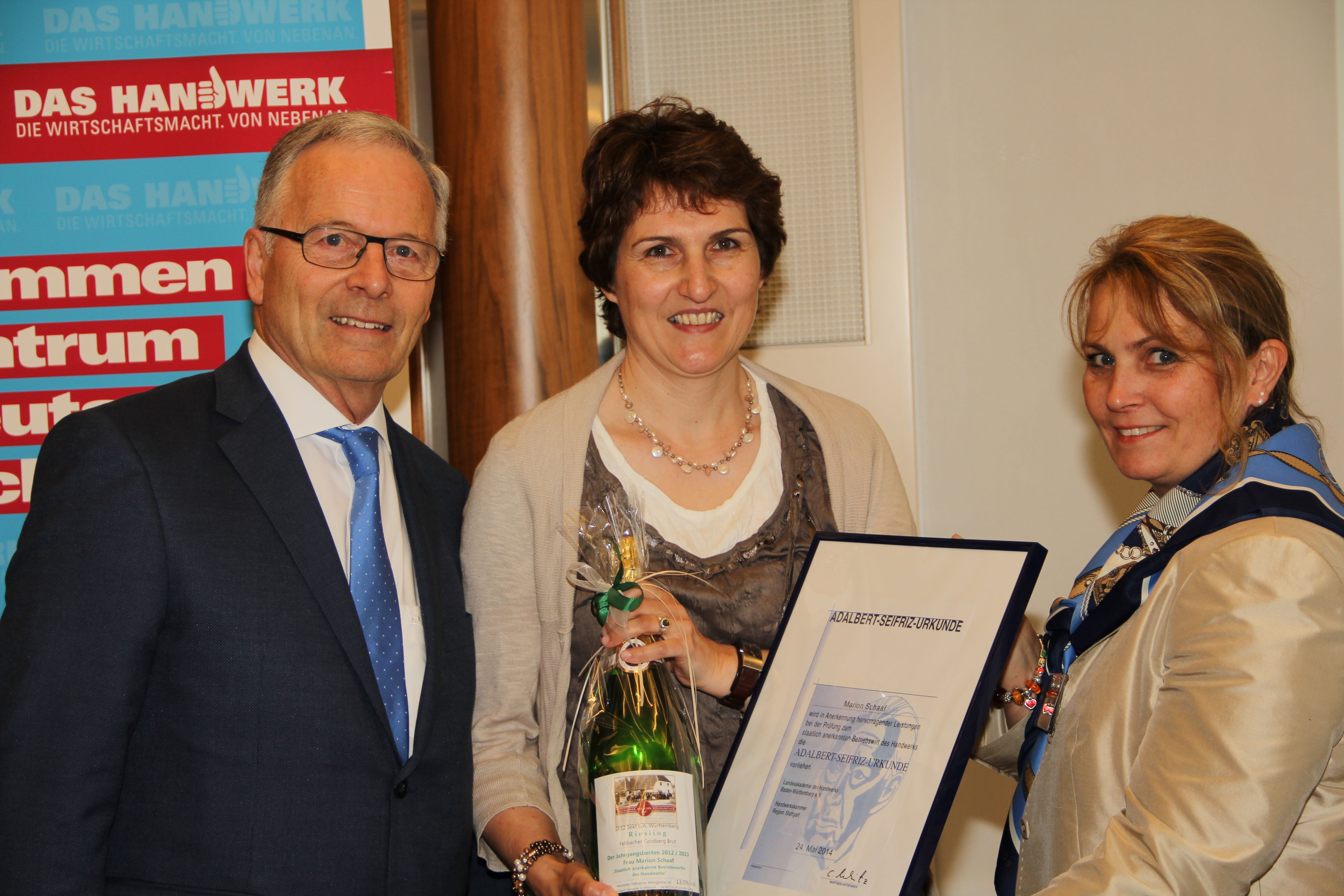 Als beste Betriebswirtin wurde Marion Schaaf (mi.) mit dem Seifriz-Preis ausgezeichnet. Die Urkunde überreichten Studienleiter Prof. Dr. Werner Rössle und Marion Grigo von der Bildungsakademie der Handwerkskammer. Foto: Pelkmann/HWK