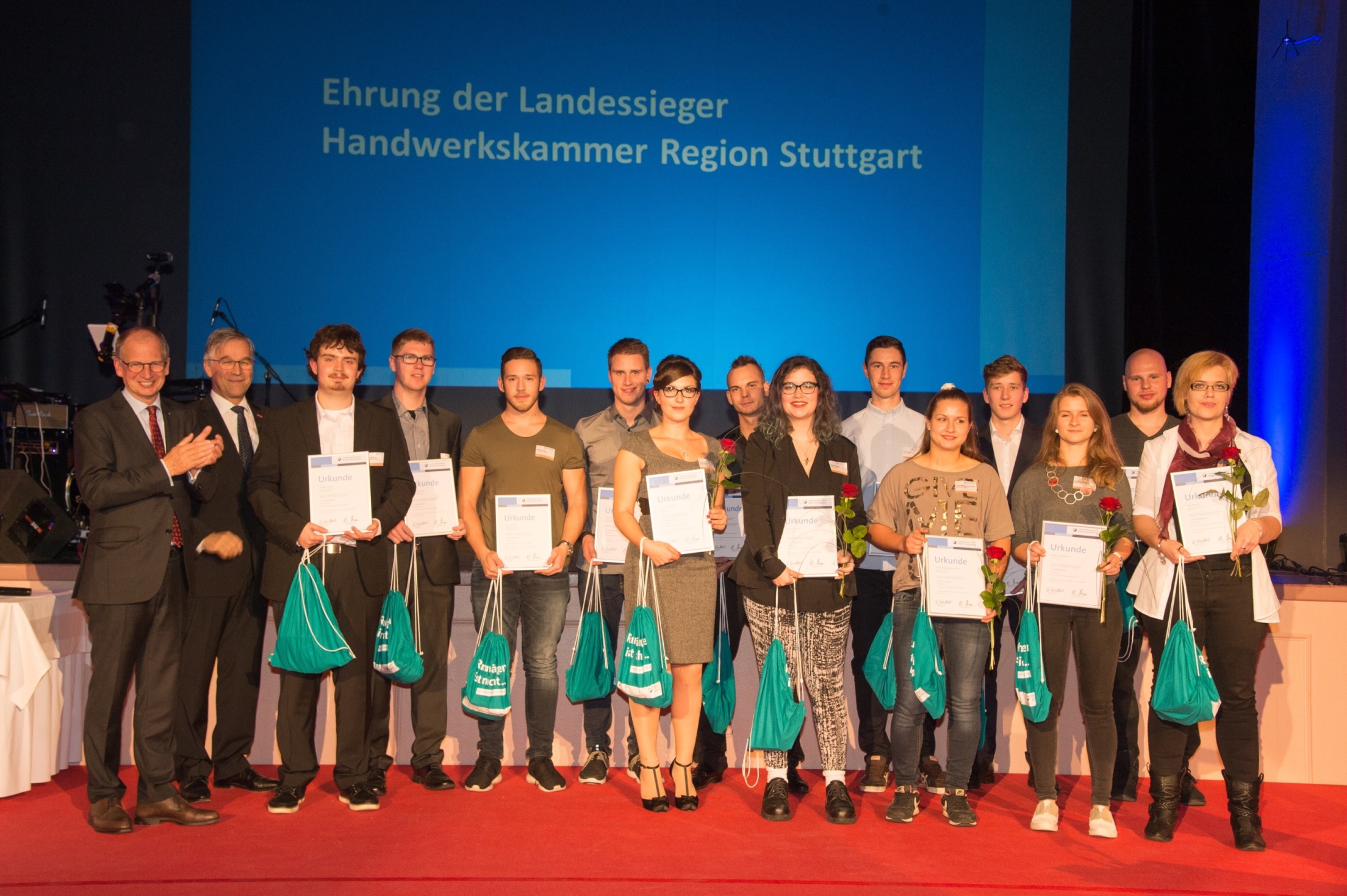 Kammersieger und Kammersiegerinnen mit Peter Friedrich (l.) und Alexander Kotz (r.) / Quelle: HWK / Harald Brendel