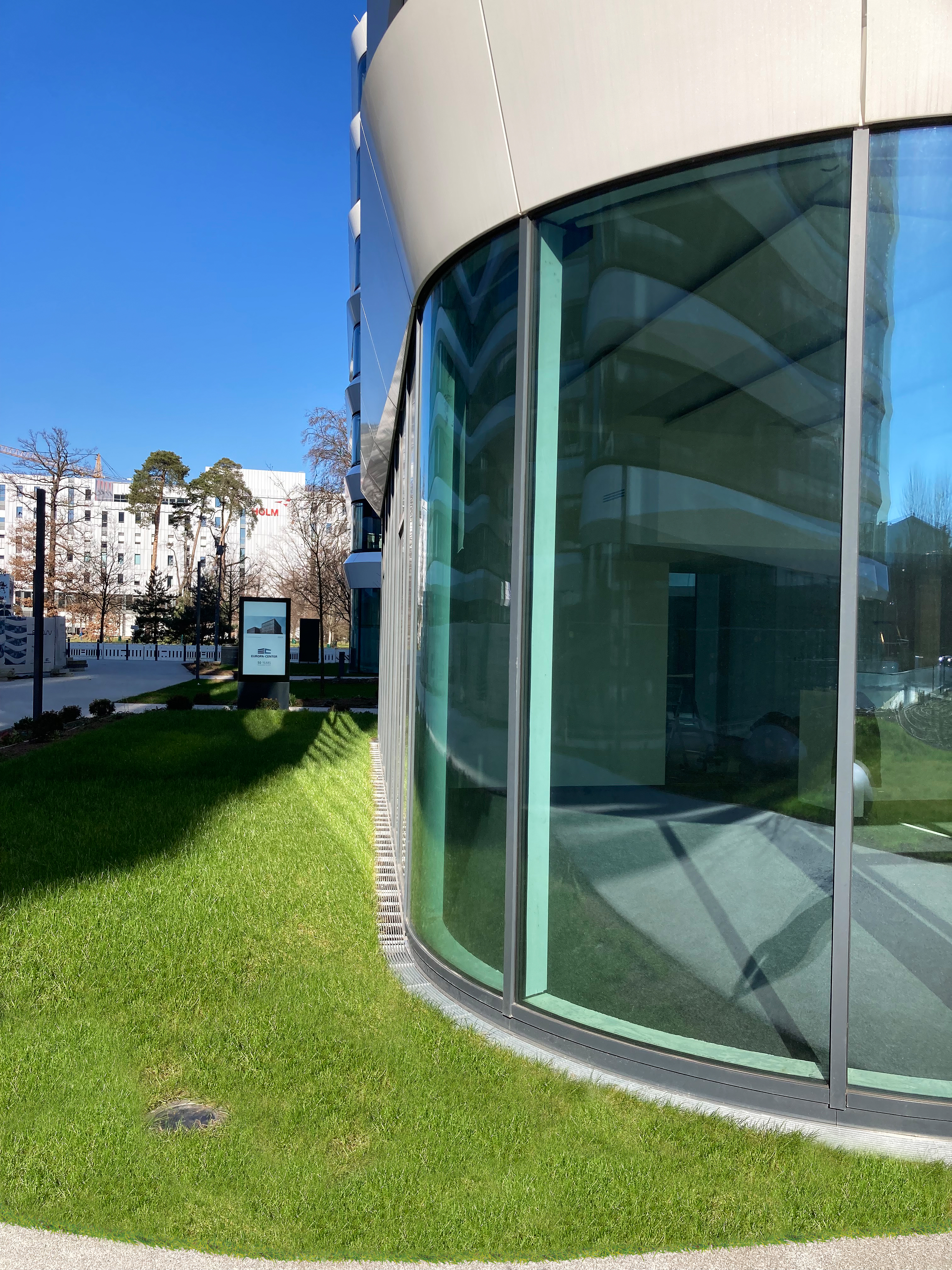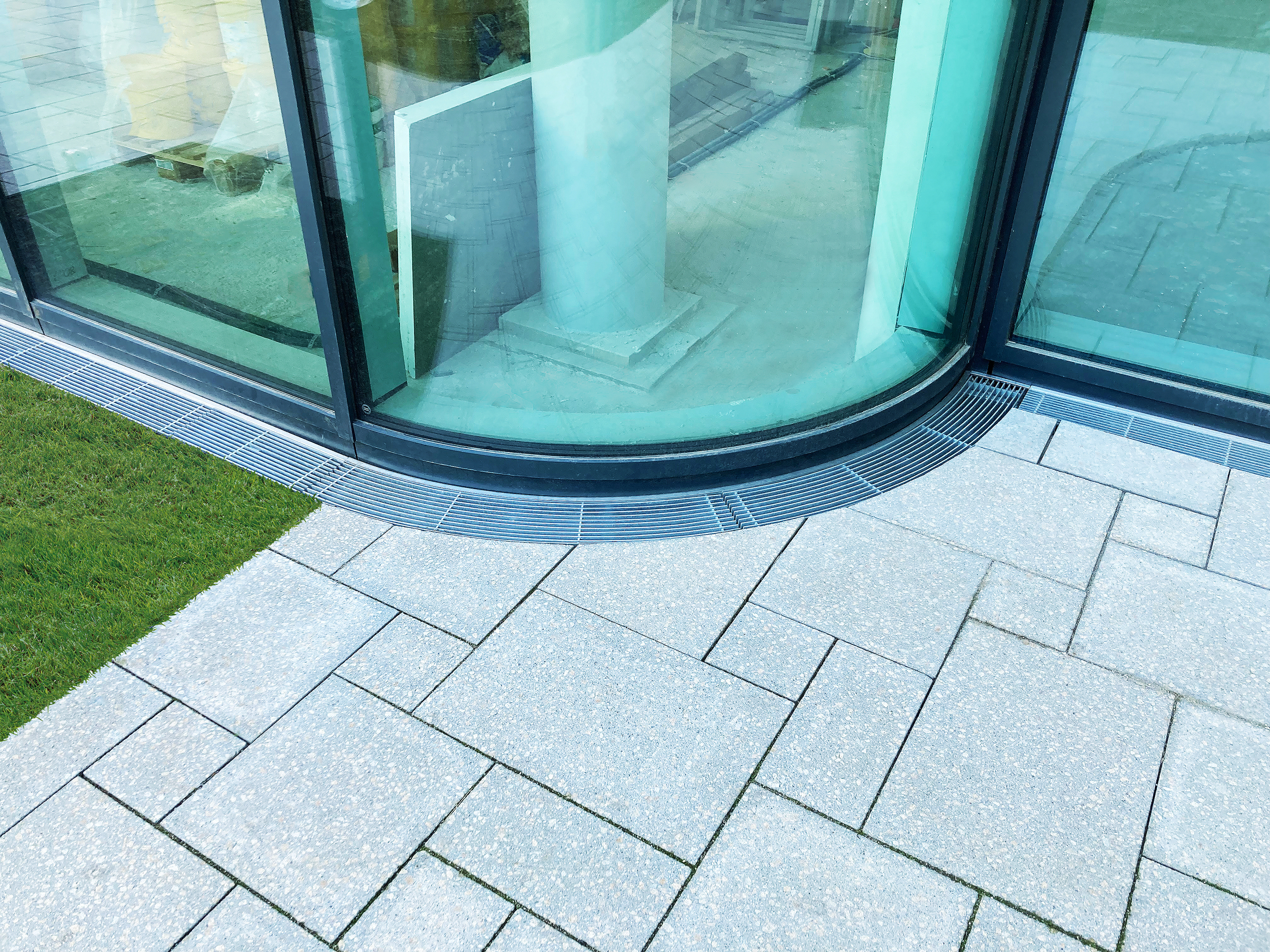 Die Rinnen wurden dabei entlang der Glasfassade geführt. Sie wurden maßgenau an die unterschiedlichen Radien der Fassadengeometrie angepasst und zeichnen das harmonische Bild der Fassade weiter. Die Übergänge zur jeweils angrenzenden Fläche führen die Charakteristik der Architektur in den Außenbereich fort. Für Hauraton bedeutete dies: Sowohl Rinnenunterteile als auch die Abdeckungen wurden speziell mit den erforderlichen Radien und Schwüngen gefertigt und eingebaut.