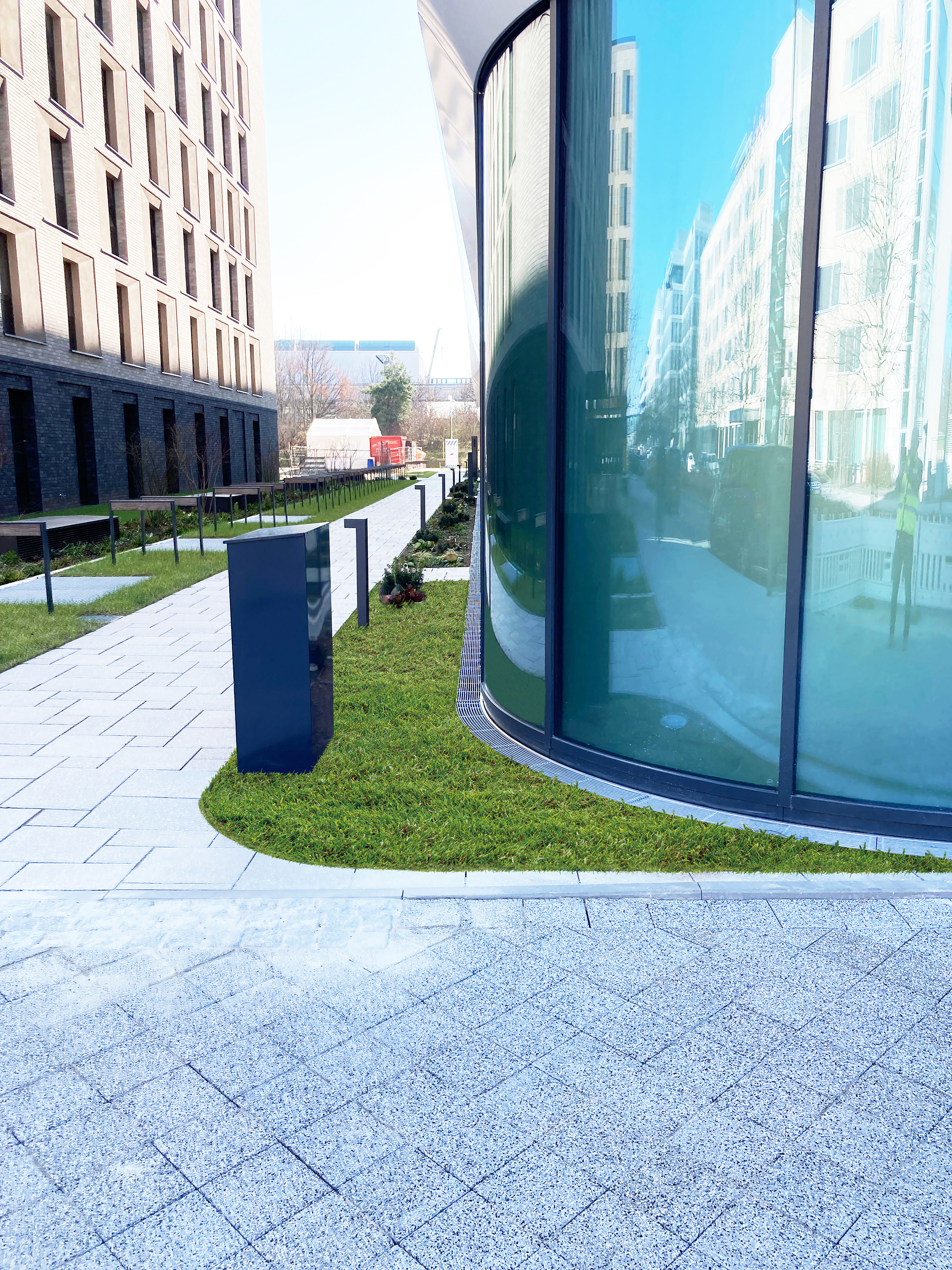 Sowohl die Standard- als auch die Sonderbaurinnen sind entlang der Fassade eingebaut worden. Sie leiten das Fassadenwasser zu den Ablaufpunkten. Die geschwungene Architektursprache des Flow-Objekts stellt nicht nur besondere Anforderungen an die Gebäudehülle. Auch die Übergänge zu den Außenanlagen – in dem Fall die untere Fassadenkante mit dem Entwässerungssystem – muss der Formgebung exakt folgen.