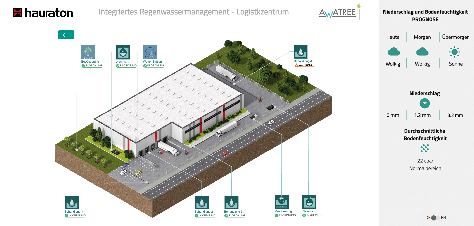 Auf der Umweltleitmesse IFAT in München hat das international tätige Unternehmen jetzt erstmalig digitale Datenströme für die gezielte Nutzung von Wasserressourcen in den Mittelpunkt gestellt. Mit dem Kooperationspartner Awatree entwickelt Hauraton gemeinsam Lösungen für zukunftsfähige Nutzung und Lenkung von Wasserströmen in allen Bereichen der Regenwasserbewirtschaftung. Der Einsatz von Sensoren allein bringt nicht die erwünschten Effekte. Viel wichtiger ist es, Daten über Quantität und Qualität entsprechend zu sammeln, zu verarbeiten und daraus Handlungsempfehlungen zu geben. Zusätzlich können über Aktoren auch automatische Aktionen ausgelöst werden, z. B. die präventive Leerung eines Regenwassertanks. Um dies sinnvoll umzusetzen, ist ein umfassender Überblick über den Zustand von Anlagen in Verbindung mit diversen Wetterdaten erforderlich.