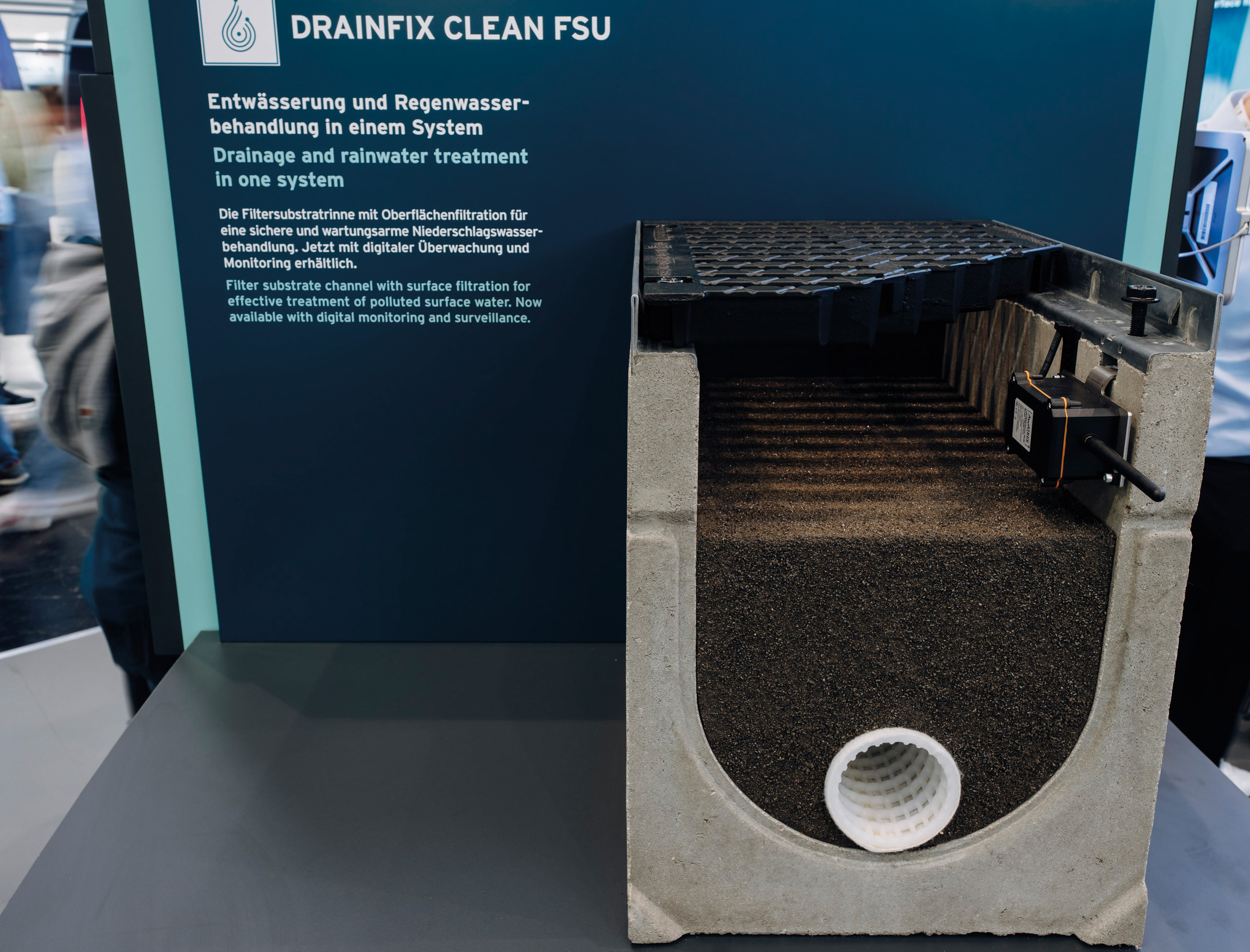 Systeme für Flächen und Fassaden ermöglichen das Ableiten von Niederschlag. Darüber hinaus gibt es Produkte zur Regenwasserbehandlung und Versickerung sowie dezentrale Anlagen wie das Drainfix Clean Filterrinnensystem oder das technische Filtersubstrat Carbotec. Damit wird Grundwasser vor Mikroplastik, Schwermetallen etc. geschützt. Rigolen sorgen für das Versickern sauberen Wassers. Außerdem stellt Hauraton Rinnensysteme bereit, die Wassermengen zurückhalten und nach und nach abgeben können.