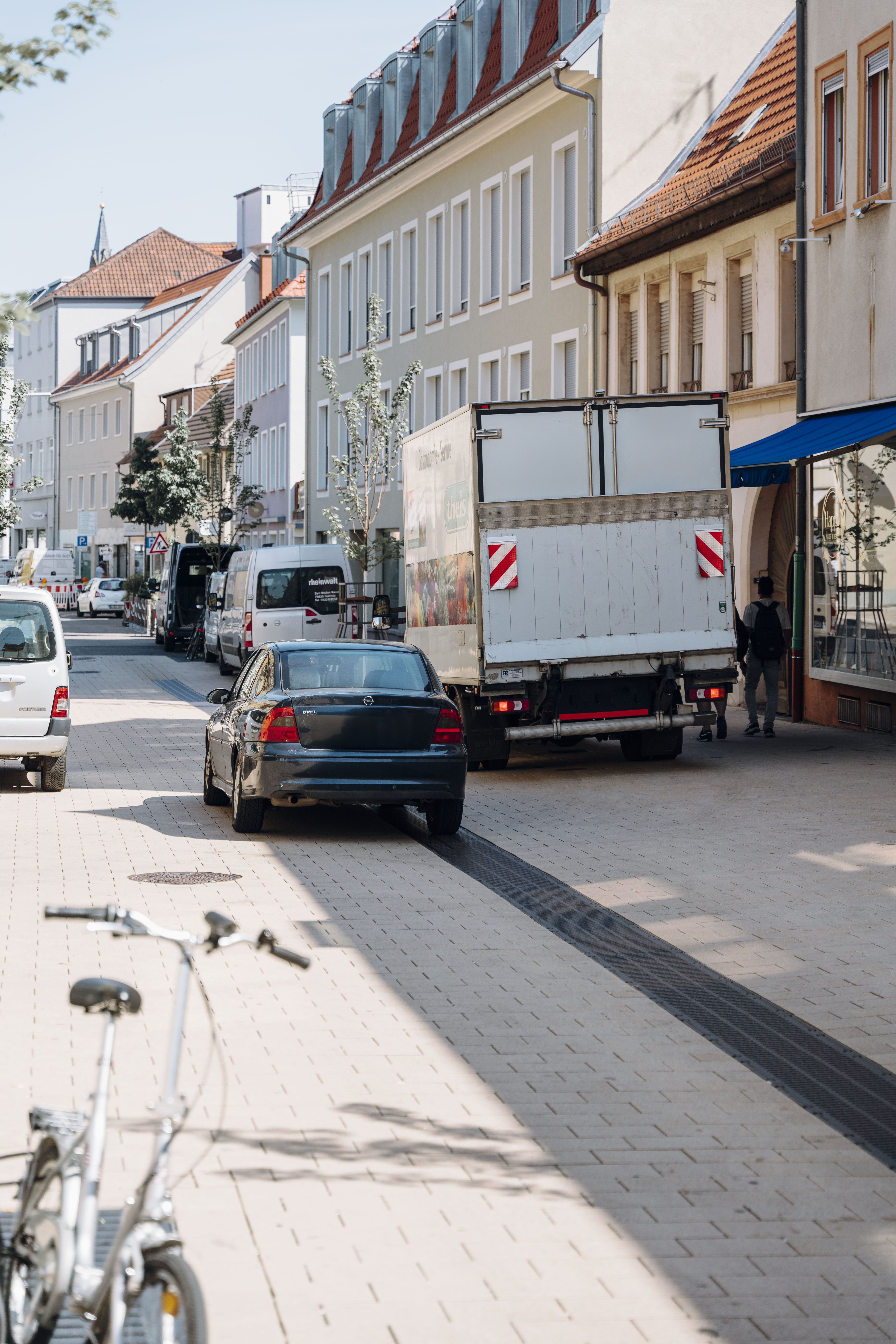 Eine beispielgebende Planung für die Sanierung eines städtischen Straßenzuges zeigt Landau. Die südpfälzische Stadt in der Metropolregion Rhein-Neckar hat ab 2023 umfangreiche Straßensanierungen in Angriff genommen und jetzt große Teile davon fertig gestellt. Rund um die Königstraße – eine zentrale Achse in der Innenstadt – wurde die komplette Straßeninfrastruktur neugestaltet. „Dabei wurde vorausschauend und langfristig gedacht“, betont Riewe. „Ziel war es, den innerstädtischen Straßenzug für ein modernes Stadtleben der nächsten 40 bis 60 Jahre fit zu machen.“ Neben Straßenabschnitten mit klassischen Fahrbahnen für Autos und Fahrräder sowie Gehwegen gibt es eine Multifunktionsfläche, auf der alle Verkehrsarten vereint werden.