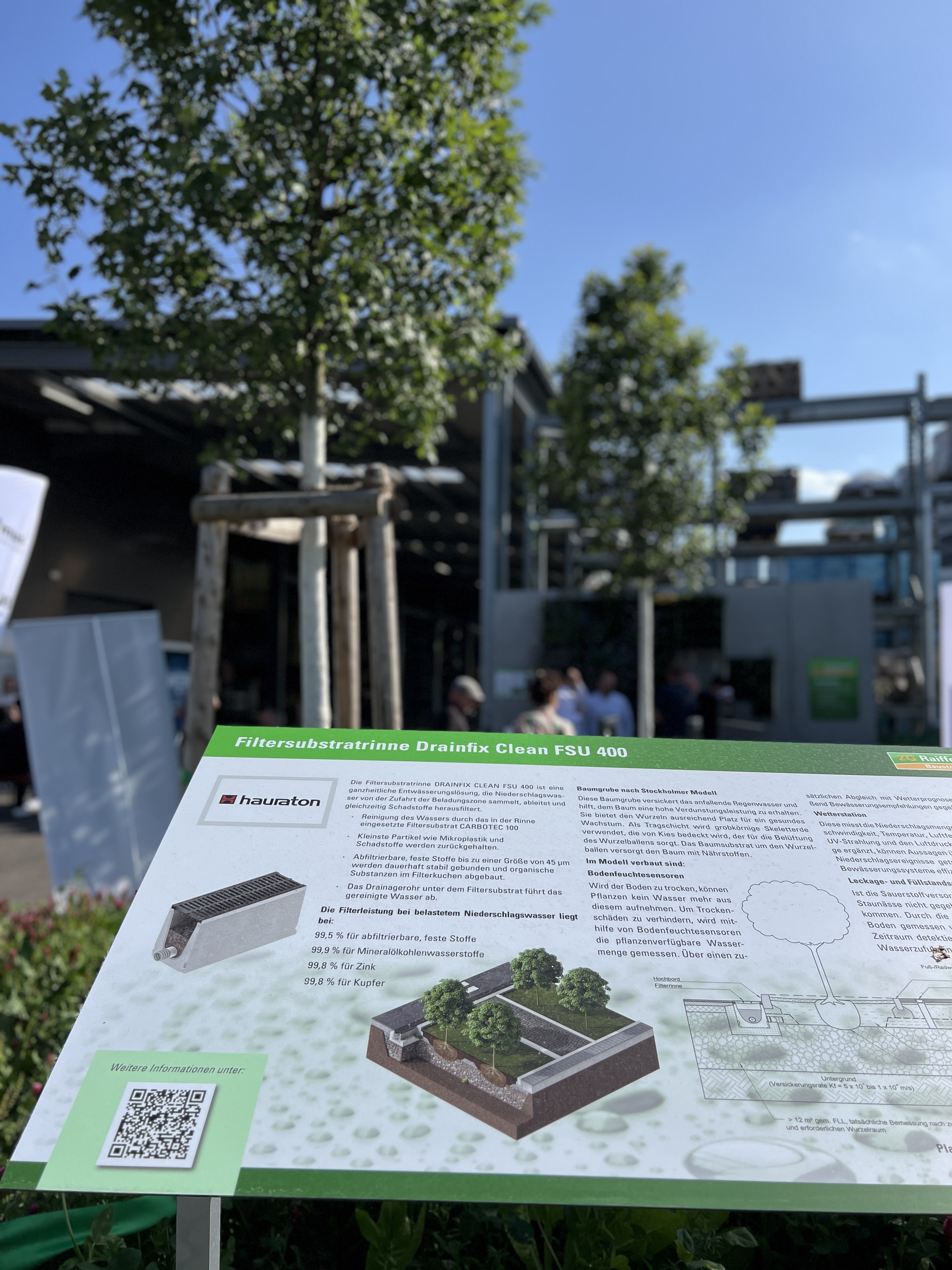 Thorin Oesterle: Unsere Hauptaufgabe hierbei ist es, wertvolles Trinkwasser durch kostenfreies Regenwasser zu ersetzen. Auch ein Baumstandort ist eine Variante der Versickerung, daher gelten die Anforderungen der Gewässerschutzgüte bzw. Bodenschutzverordnung. Gleichermaßen hat auch ein Baum gewisse Ansprüche an die Wasserqualität. Regenwasser ist naturgemäß sehr weich und eignet sich hervorragend als Gießwasser. Vermischt es sich aber mit belasteten Abflüssen von Verkehrsflächen, gelangen ungewünschte Begleitstoffe wie Reifenabrieb oder Schwermetalle hinein. Mit der Filtersubstratrinne Drainfix Clean, die neben anderen Lösungen im Regenwasser-Park zum Einsatz kommt, werden diese Schadstoffe dauerhaft zurückgehalten. So kann das Niederschlagswasser nach Aufnahme, Reinigung und Nutzung zur Baumbewässerung – und damit unbelastet – wieder dem natürlichen Kreislauf zugeführt werden bzw. versickern.