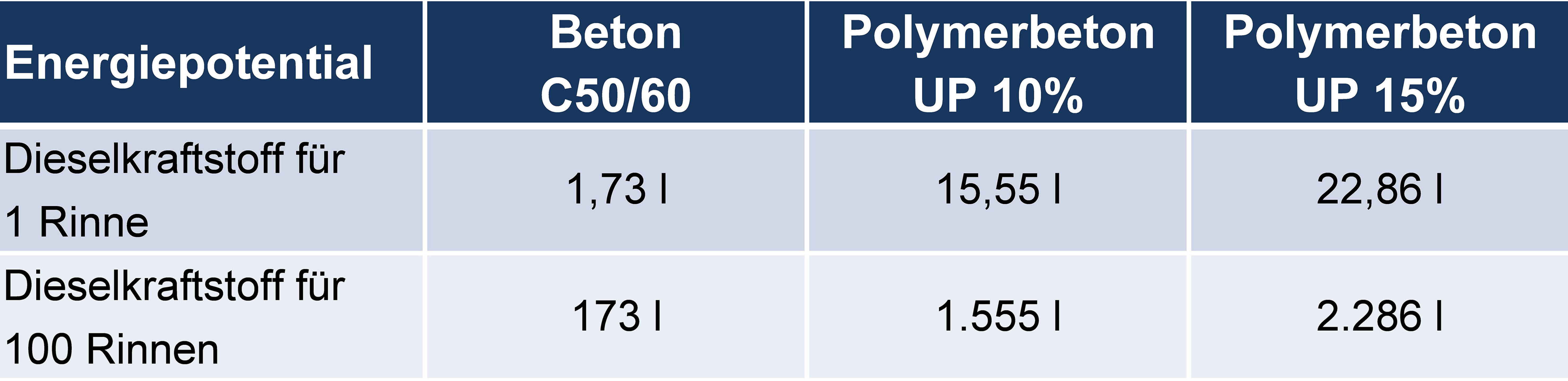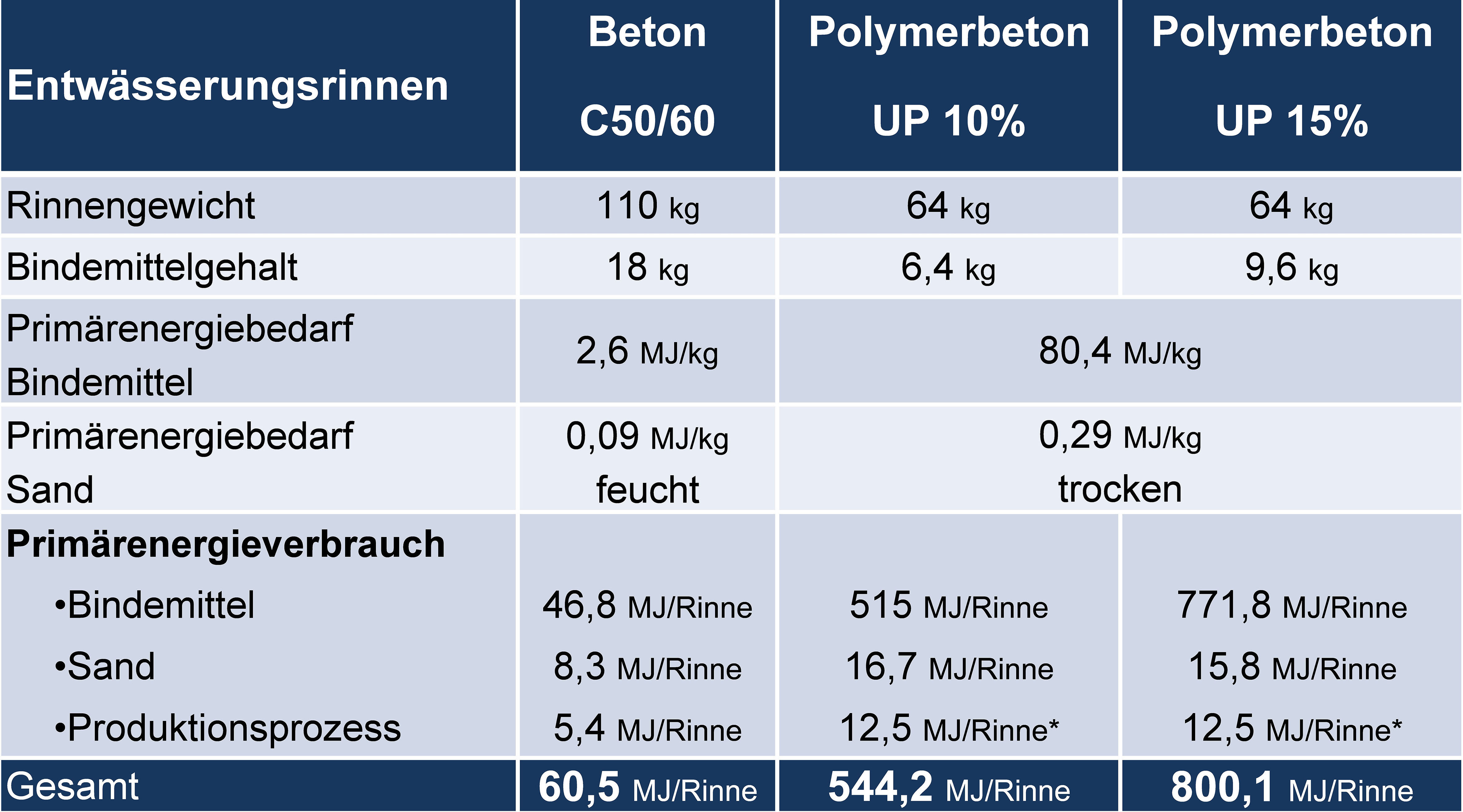 Für die folgende Bewertung werden vorhandene Bilanzen vom VDZ (Verein Deutscher Zementwerke) für den Primärenergiegehalt von Zement und von der ACMA (American Composites Manufacturers Association) für den Primärenergiegehalt des Harzes verwendet. Die Bindemittelanteile des Polymerbeton liegen unter optimalen Produktionsbedingungen bei 10 Prozent pro Rinne; prozess- und rohstoffbedingt können die Bindemittelanteile bis zu 15 Prozent betragen.