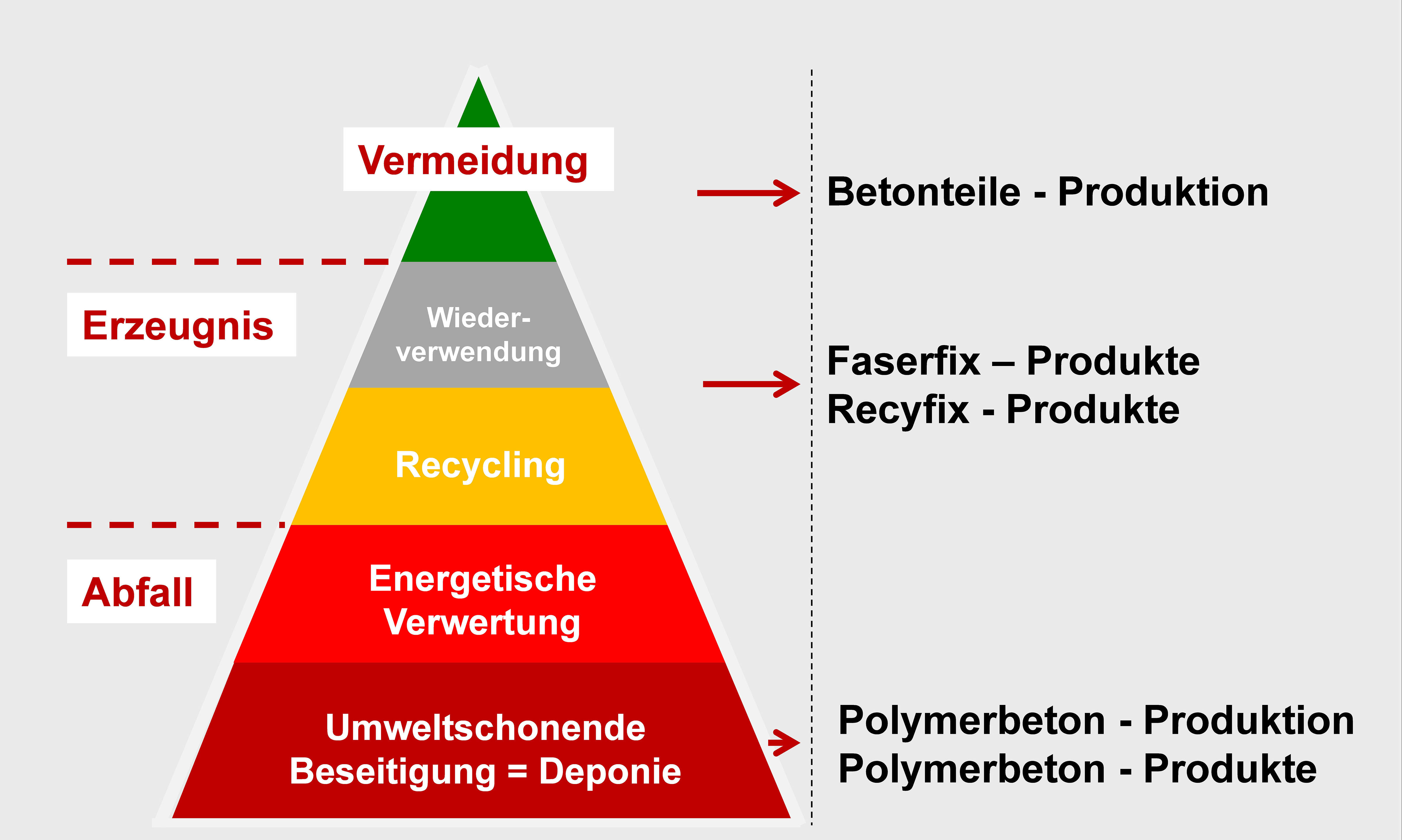 Polymerbeton dagegen lässt sich nur auf Deponien entsorgen, oder unter bestimmten Voraussetzungen als Unterbau im Straßenverkehr. Er kann in keiner Weise mehr verwertet oder in einen Produktlebenszyklus zurückgeführt werden.