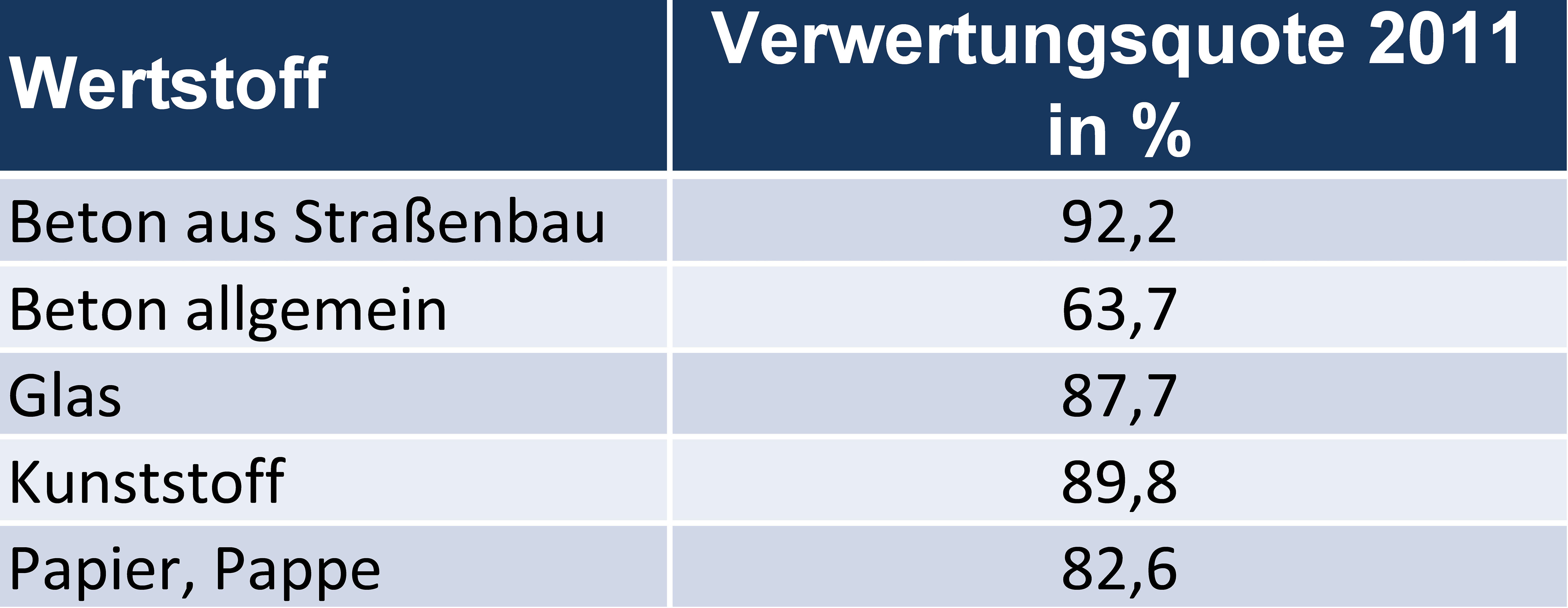 In der Ökobilanz schlägt sich die Vermeidung von Abfall positiv nieder, denn Ressourcen und Umwelt werden so optimal geschont (Abbildung 2). Beton hat einen höheren Aufbereitungsfaktor als z. B. Altglas oder Kunststoff und bleibt auch nach der Nutzungsphase ein Wertstoff (Tabelle 3). Betonabbruch kann vielseitig wiederverwendet werden.