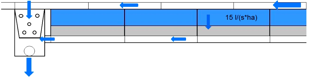 Das Retentionsfiltersystem Drainfix Clean bietet beispielsweise ein Einstauvolumen von 60 m³ je Hektar undurchlässigen Entwässerungsflächenanteils, bei einem Anschlussflächenverhältnis Filterfläche/Entwässerungsfläche) von 2%. Bei Dimensionierung für eine Regenspende von 15 l/(s*ha) unter Anwendung des Trennerlasses in NRW ergibt sich selbst bei einem reduzierten Filterflächenverhältnis mit 0,6% noch ein Retentionsvolumen von 18 m³. Bei diesem Bemessungsverfahren wird ein Überlauf benötigt. Dabei kann ein (bestehender) Straßenablauf mit Schlammfang am tiefsten Punkt des Retentionsfilterrinnenstranges zur Aufnahme überlaufenden Wassers dienen (Abb. 3).