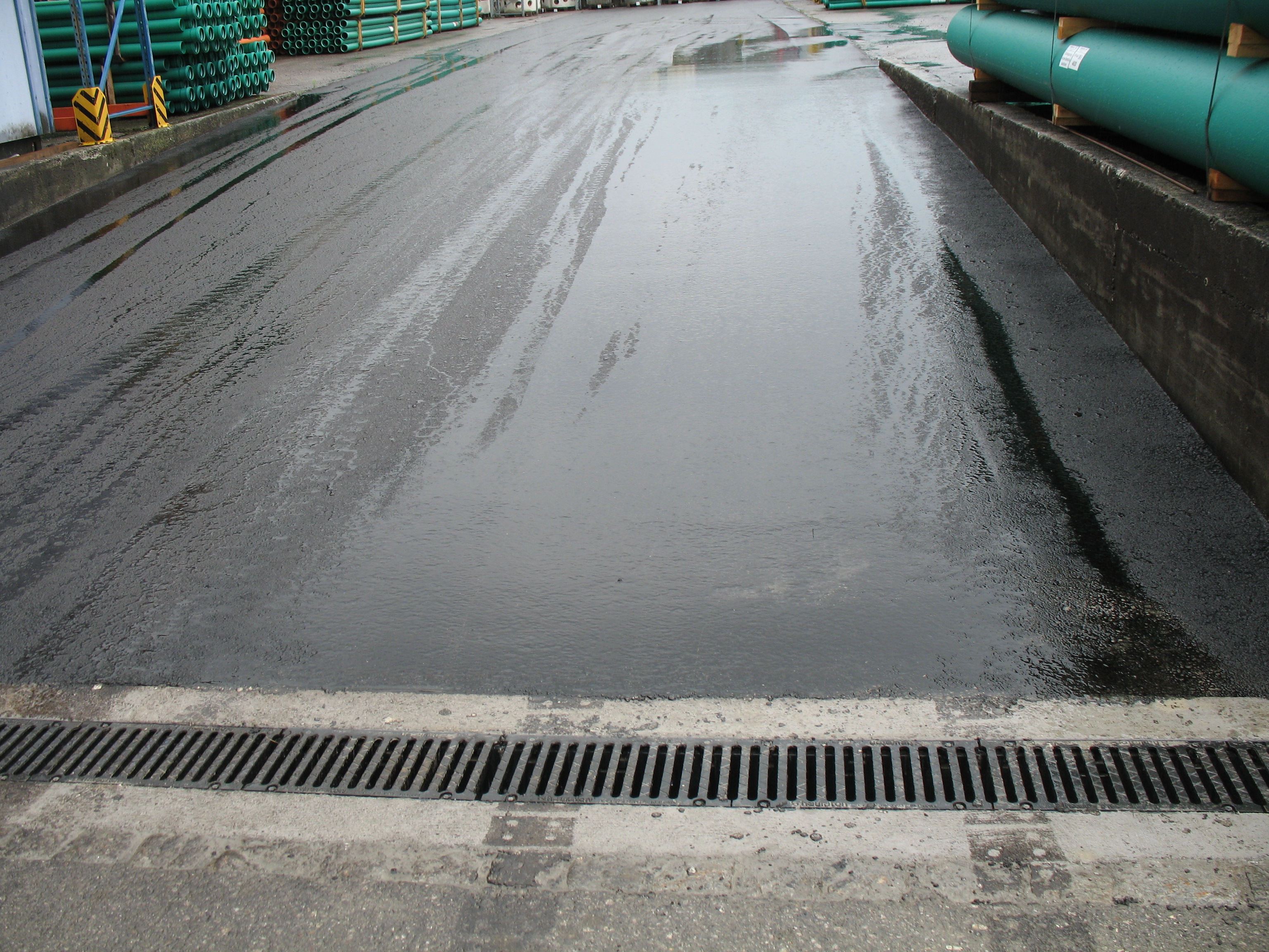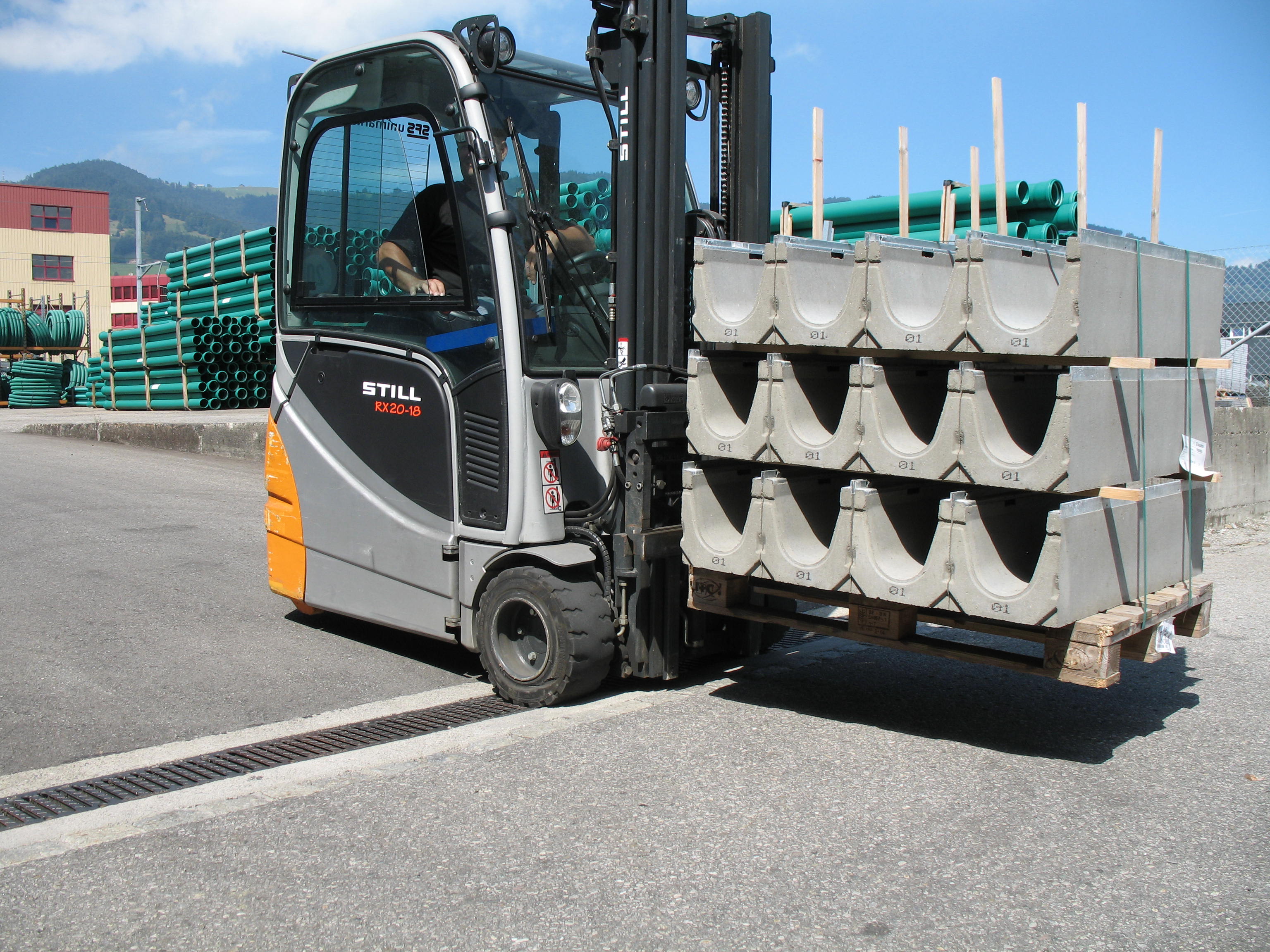 Die Entwässerung des Geländes wurde aufgrund der örtlichen Gegebenheiten und der hydraulischen Bedingungen am unteren Ende einer Rampe platziert. Das heißt für die zum Einsatz kommende Rinne: sie wird hohen Schubkräften und damit starken, seitlich auf das Rinnensystem auftreffenden Belastungen ausgesetzt sein. Die weitere Anforderung: Die Rinne wird täglich mit einer hohen Frequenz und mit großen Lasten befahren. Der in dem Areal vorherrschende Verkehr durch Gabelstapler bringt nicht nur eine hohe Gewichtsbelastung mit sich. Es werden außerdem durch häufige, Lenkvorgänge in kleinen Radien starke Scherkräfte auf die Rinne abtragen. Für diesen Einsatz war also ein robustes und widerstandsfähiges Entwässerungssystem erforderlich, das auch dynamischen Belastungen standhält.