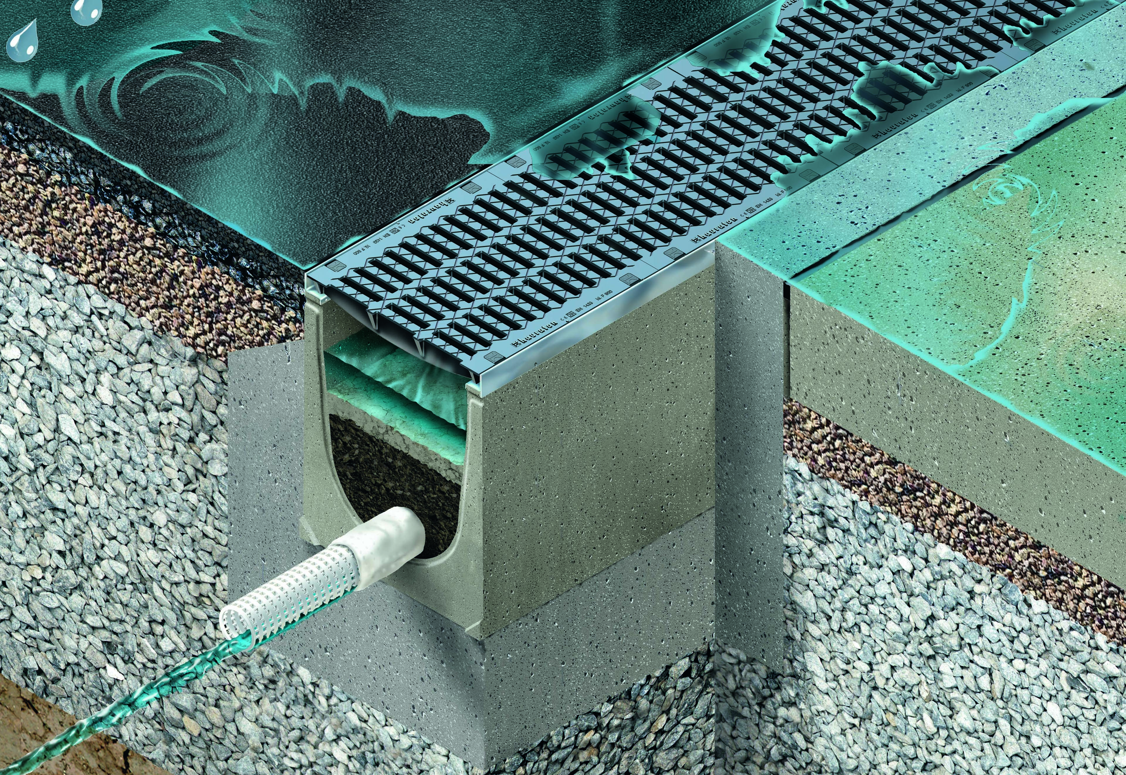 Das Retentionsrinnenfiltersystem Drainfix Clean erlaubt durch eine oberflächennahe Behandlung von schadstoffbelasteten Abflüssen nachgeschaltete oberflächennahe Versickerungssysteme. Dadurch ist Versickerung auch bei hohem Grundwasserspiegel möglich.