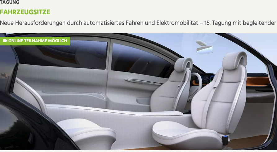 Die 15. Fachtagung Fahrzeugsitze bietet neueste Informationen in Form von Fachvorträgen und zahlreiche Kontaktmöglichkeiten für Sitzentwickler, Manager, Einkäufer und Verkäufer. Die Fachvorträge von OEMs und Komponentenentwicklern behandeln die Bereiche Seat Components, Car Seats, Automotive Seats. Es besteht Diskussionsmöglichkeiten im Plenum, in den Pausen und während der Ausstellung (alles am ersten Tag). Der zweite Tag findet komplett online statt.