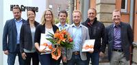 HFO-Vorstandsvorsitzender Achim Hager lud anlässlich der Ehrung der beiden langjährigen Mitarbeiter zu einer kleinen Feierstunde ein. Als Dank überreichte er Nicole Scharf und Christoph Beck gemeinsam mit Finanzvorstand Jörg Böckel, den Geschäftsführern Peter Schwinn und Andreas Hampel sowie Teamleiterin Steffi Hohmann ein kleines Präsent.