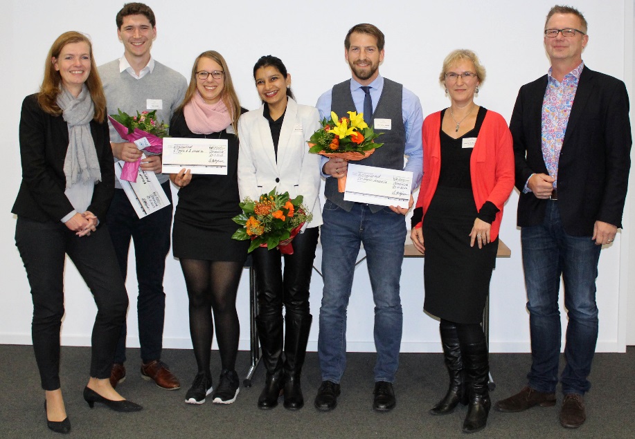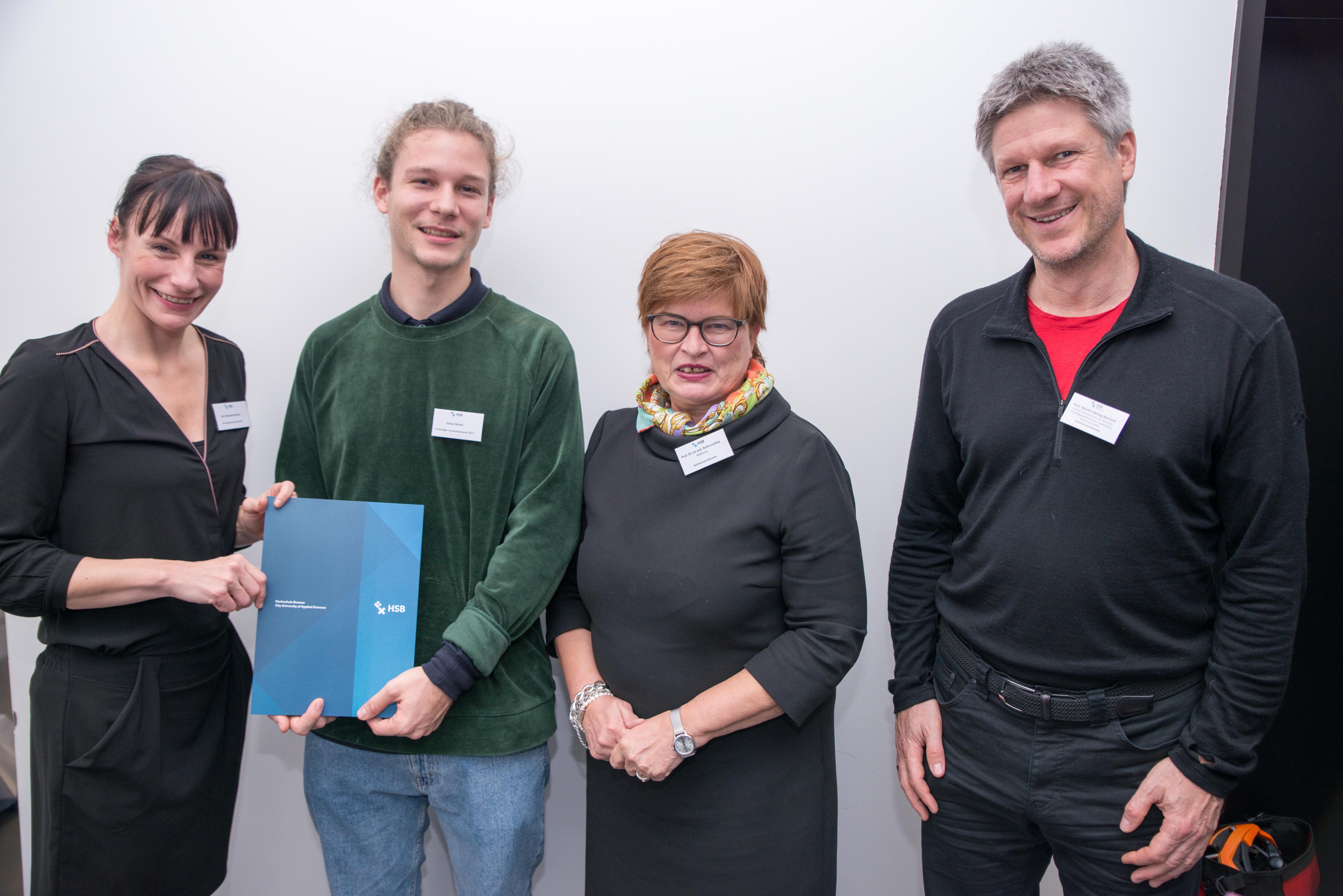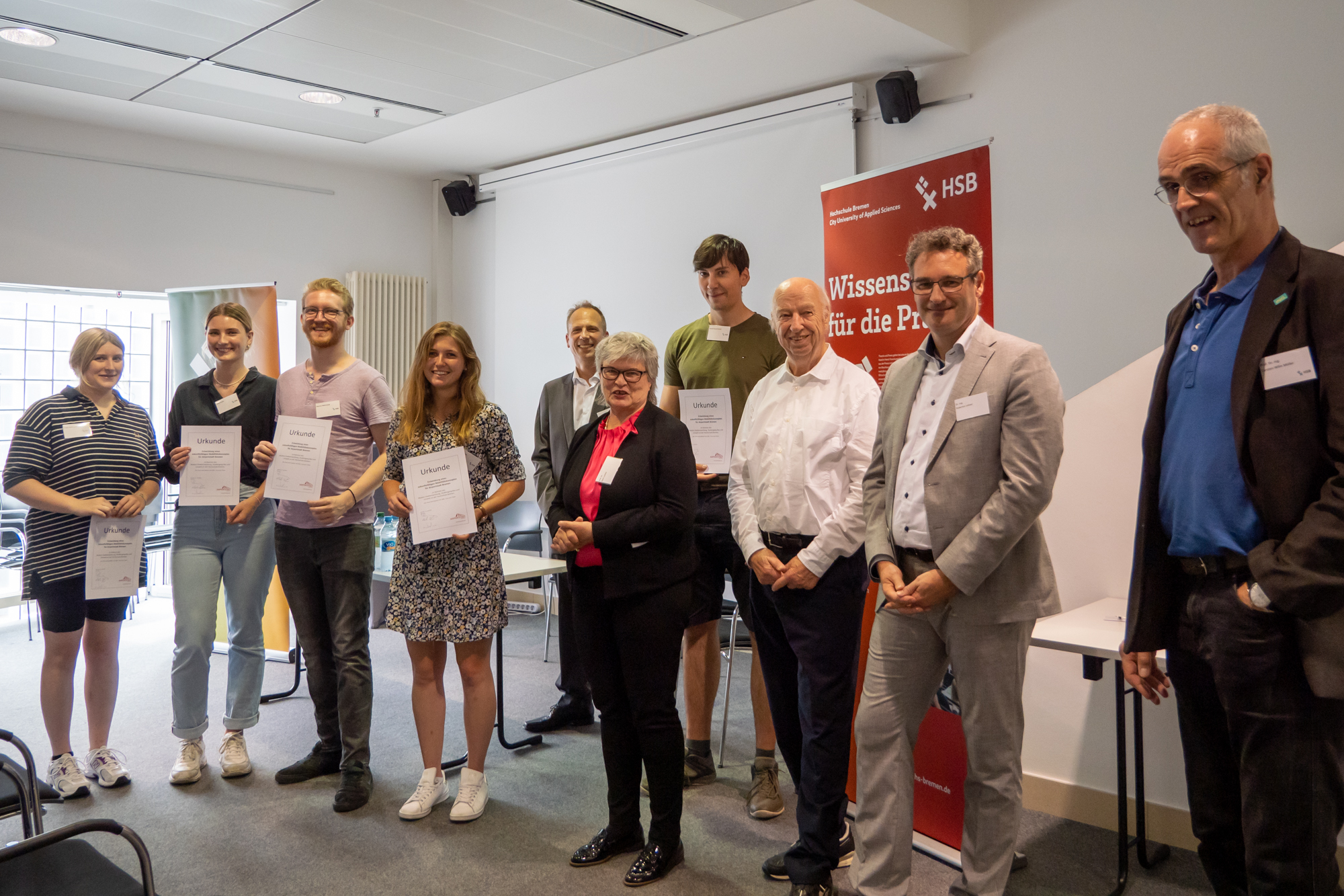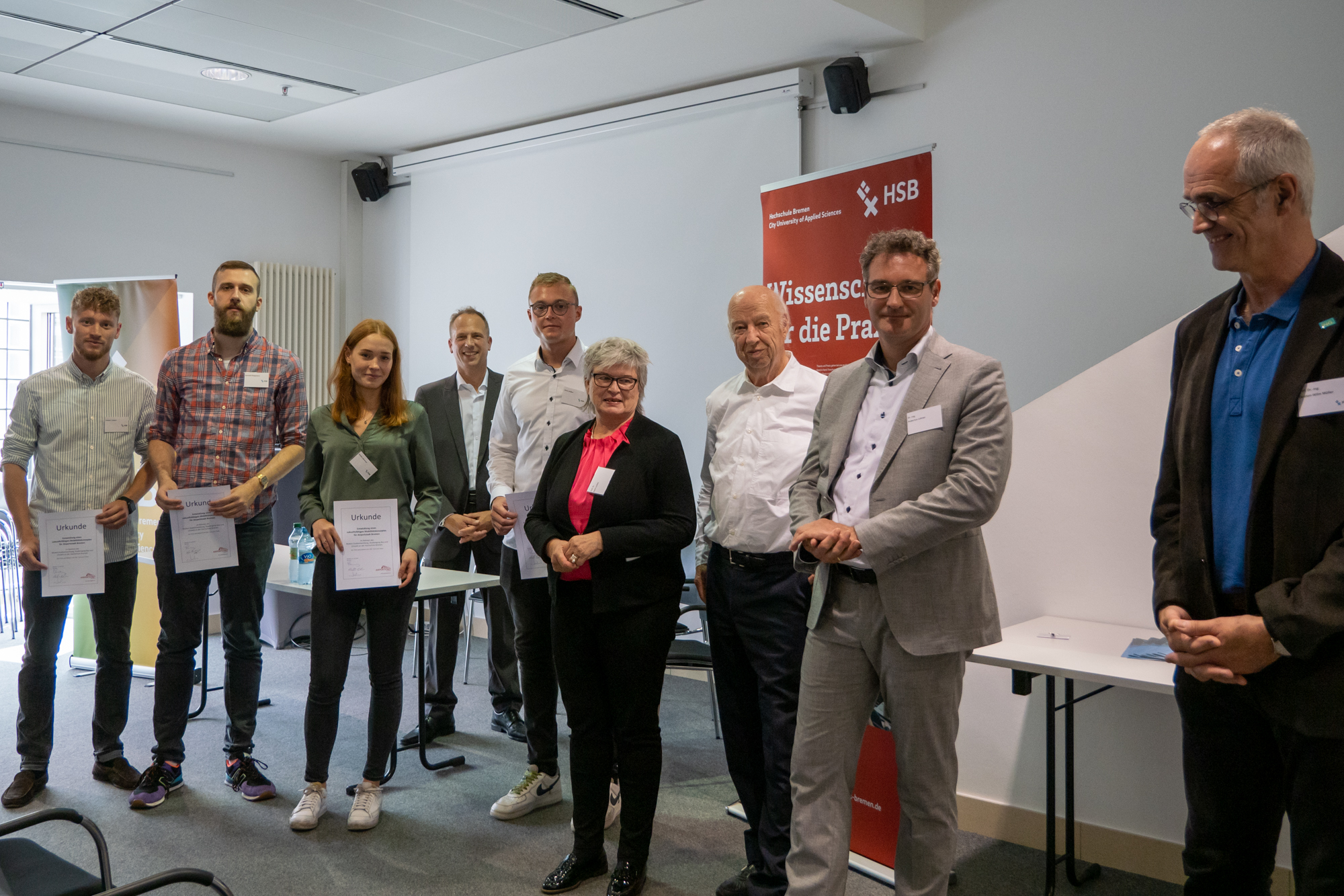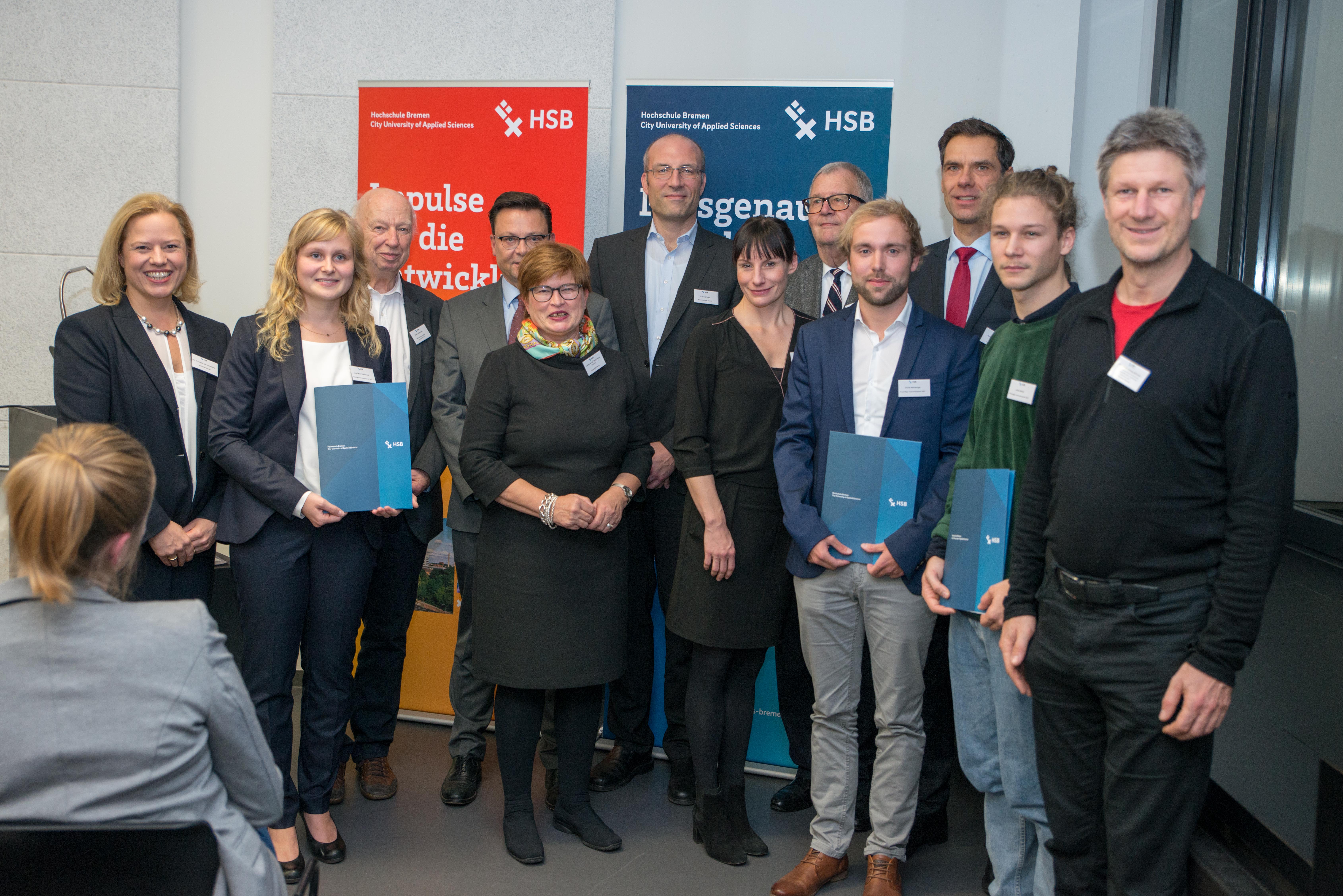 v.l.n.r.: Prof. Dr. Wiebke Scharff Rethfeldt (Betreuerin), Anna-Maria Kuttenreich (Preisträgerin), Uwe Nullmeyer (Initiativkreis), Tim Reiners (Initiativkreis; halb verdeckt), Rektorin Prof. Dr. Karin Luckey, Dr. Frank Thoss (Initiativkreis), Julia Maxwitat-Balzer (Sparkassen-Stiftung), David Hamburger (Preisträger), Prof. Dr. Ulrich Kuron (Betreuer), Julius Hetzel (Preisträger) und Prof. Dr. Martin Hering-Bertram (Betreuer) (Fotograf: Shuvo Sarkar, Hochschule Bremen)