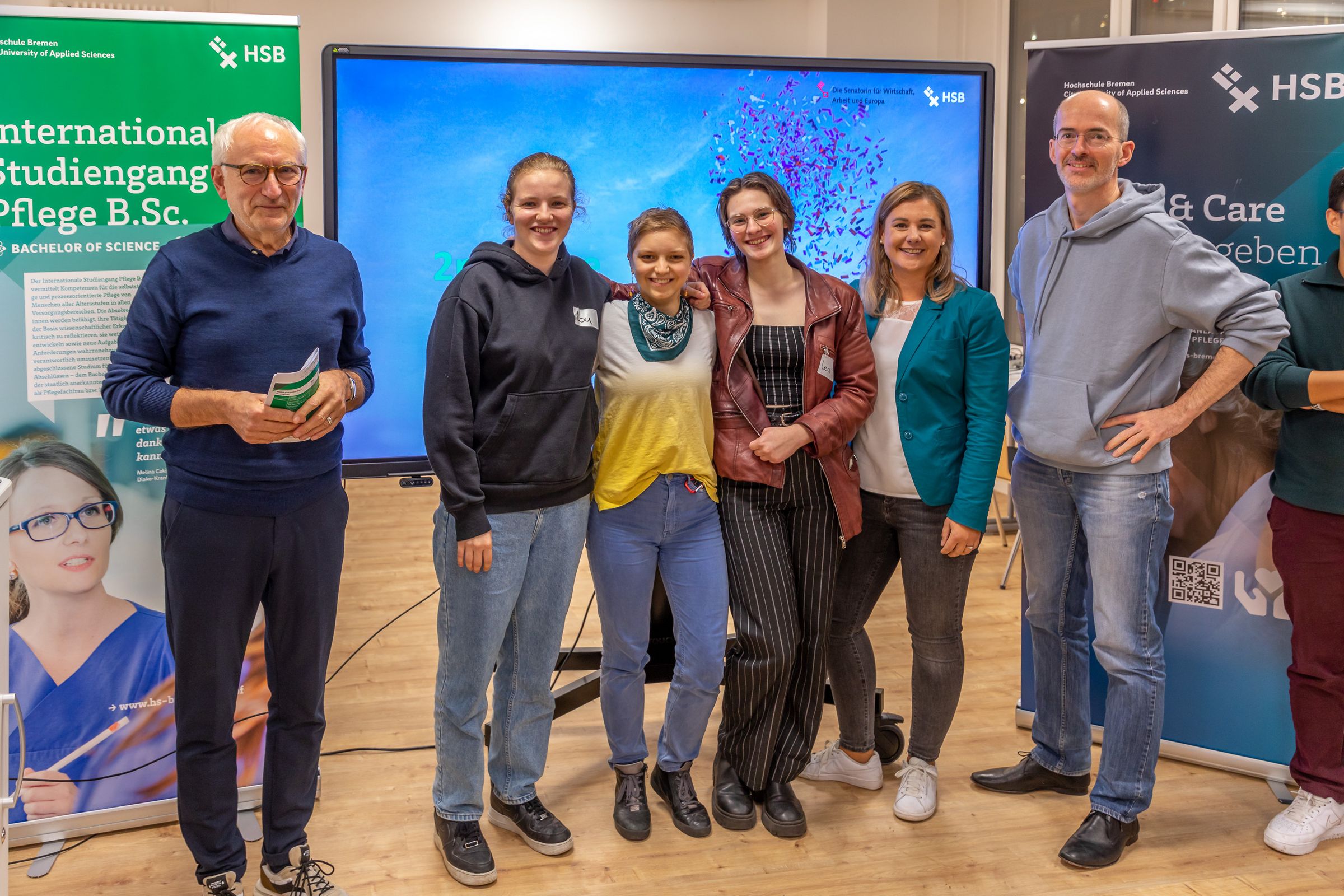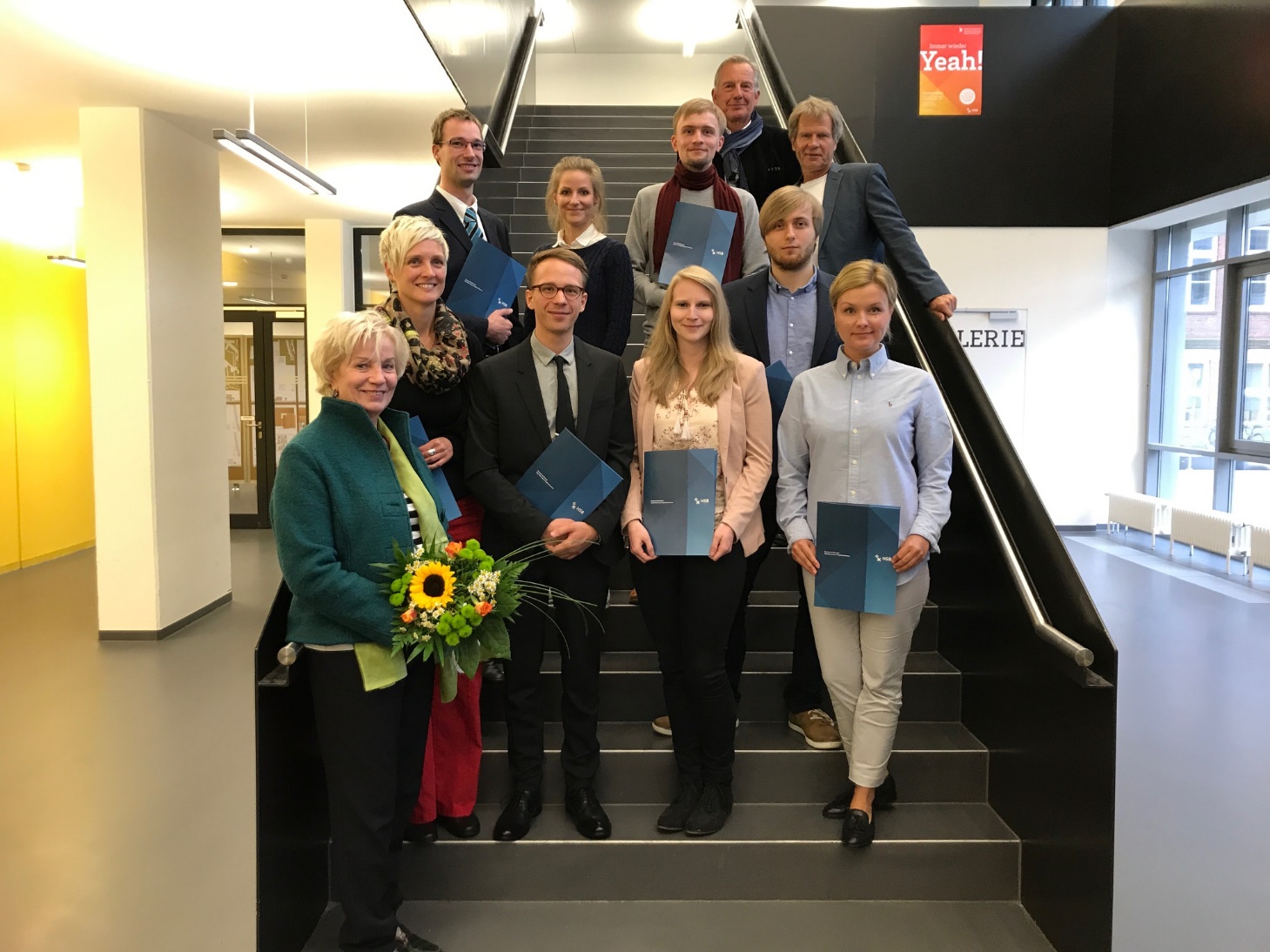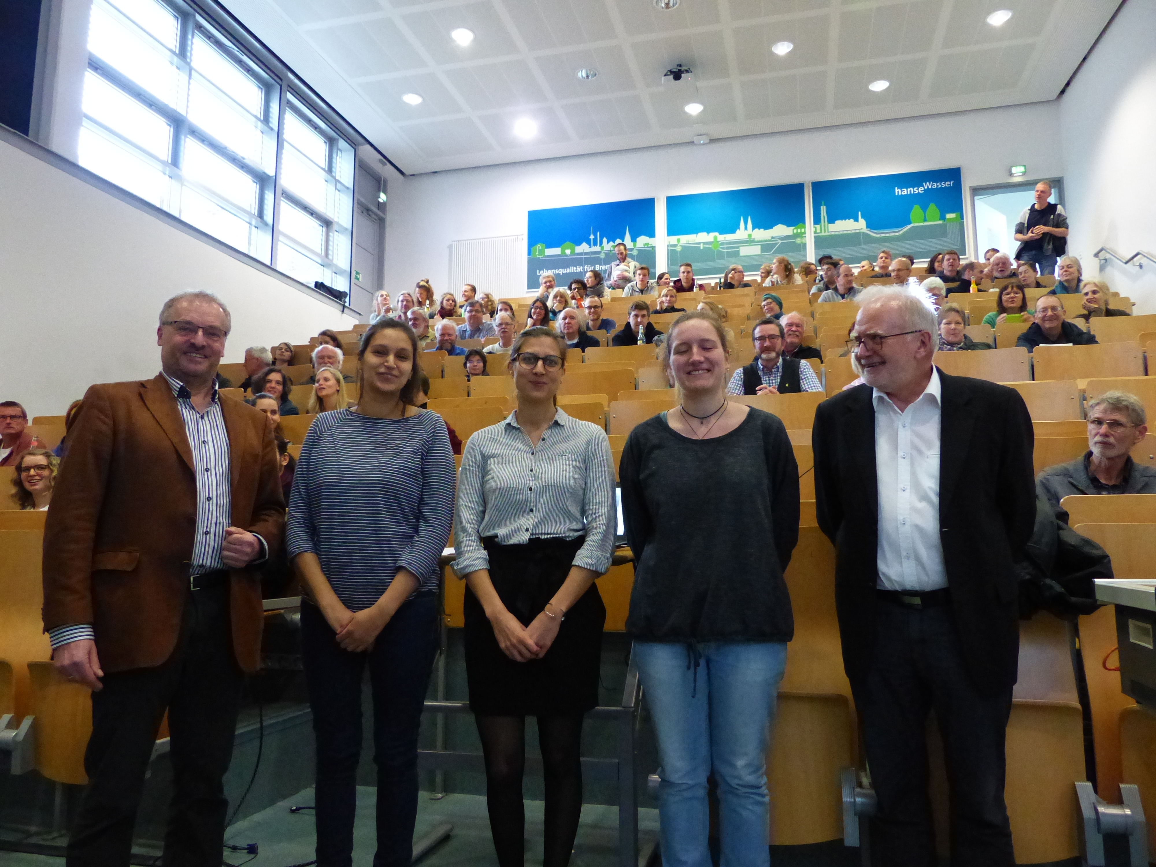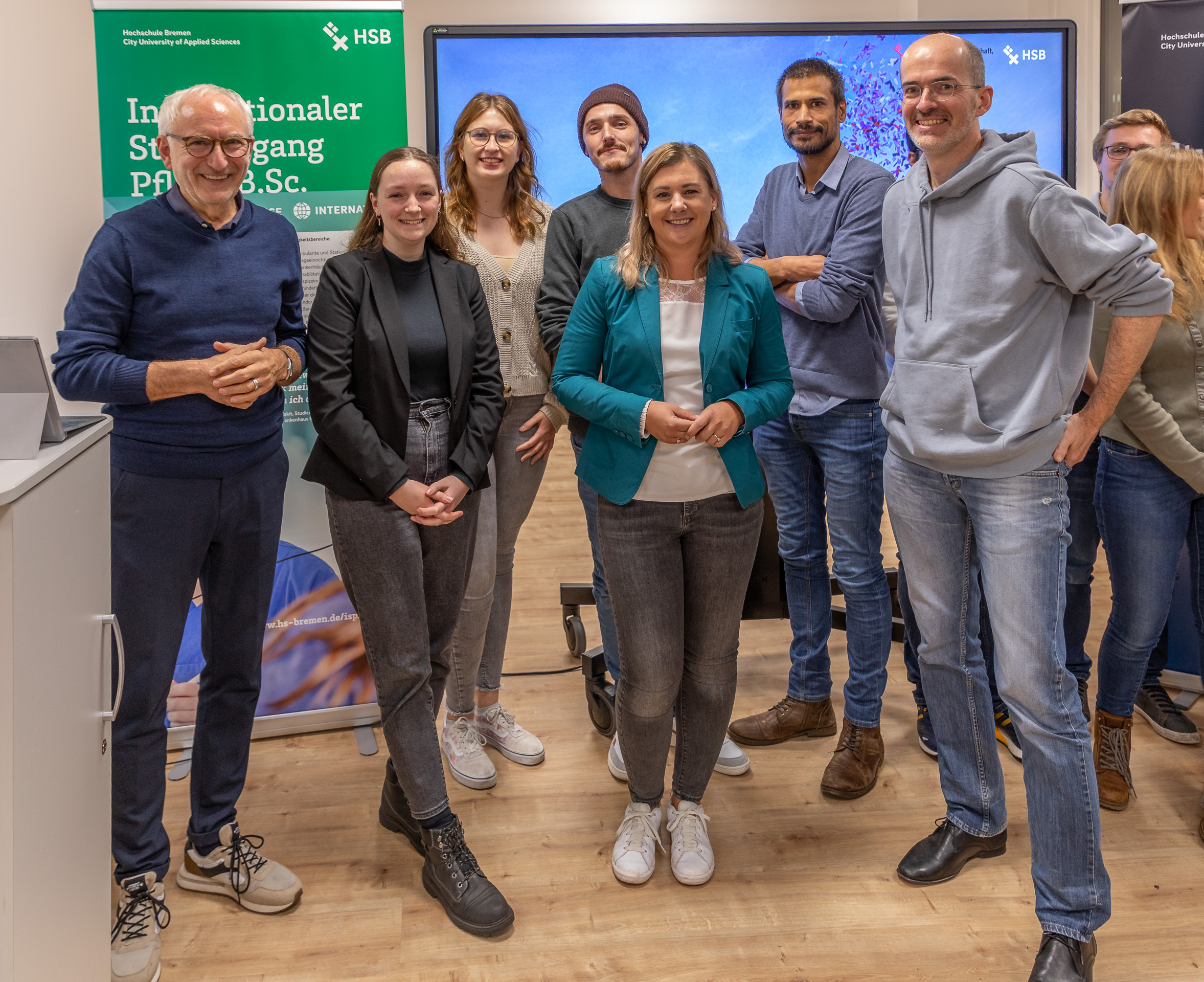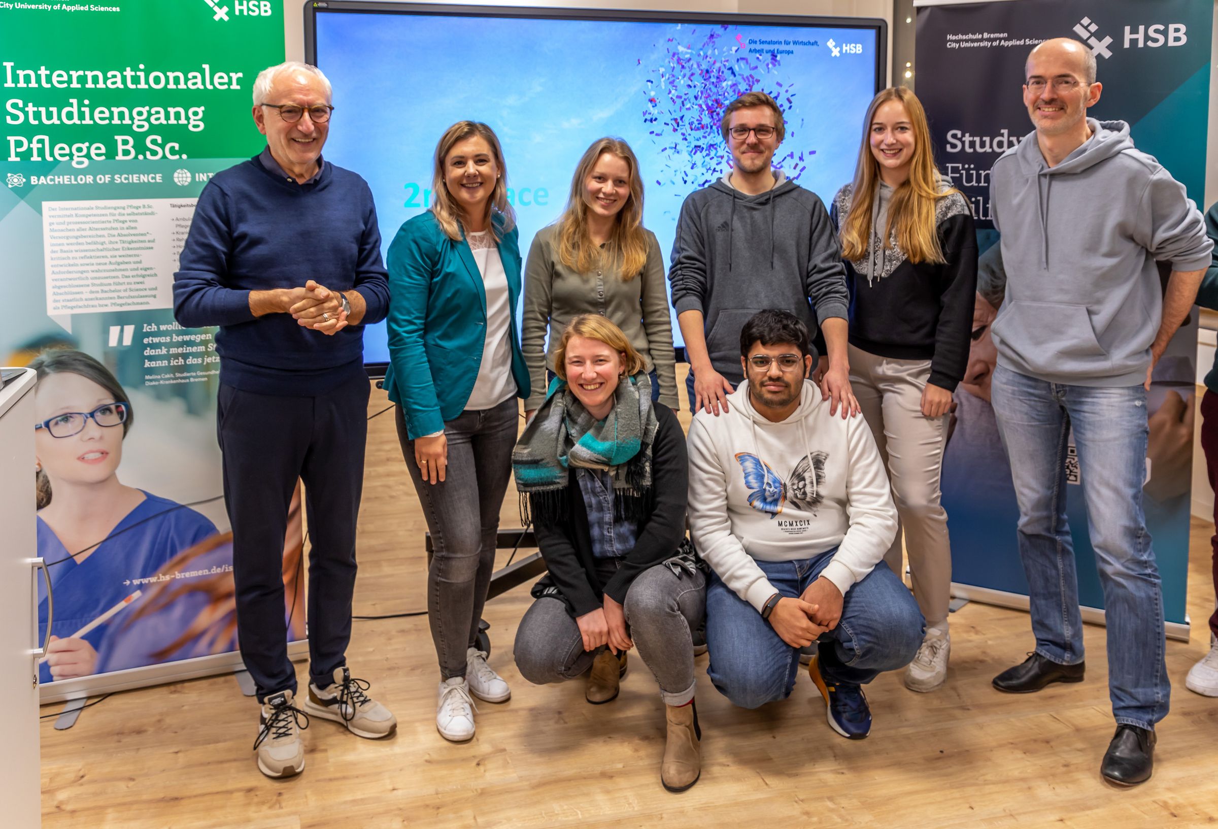 v.l.n.r.: Prof. Dr. Wiebke Scharff Rethfeldt (Betreuerin), Anna-Maria Kuttenreich (Preisträgerin), Uwe Nullmeyer (Initiativkreis), Tim Reiners (Initiativkreis; halb verdeckt), Rektorin Prof. Dr. Karin Luckey, Dr. Frank Thoss (Initiativkreis), Julia Maxwitat-Balzer (Sparkassen-Stiftung), David Hamburger (Preisträger), Prof. Dr. Ulrich Kuron (Betreuer), Julius Hetzel (Preisträger) und Prof. Dr. Martin Hering-Bertram (Betreuer) (Fotograf: Shuvo Sarkar, Hochschule Bremen)