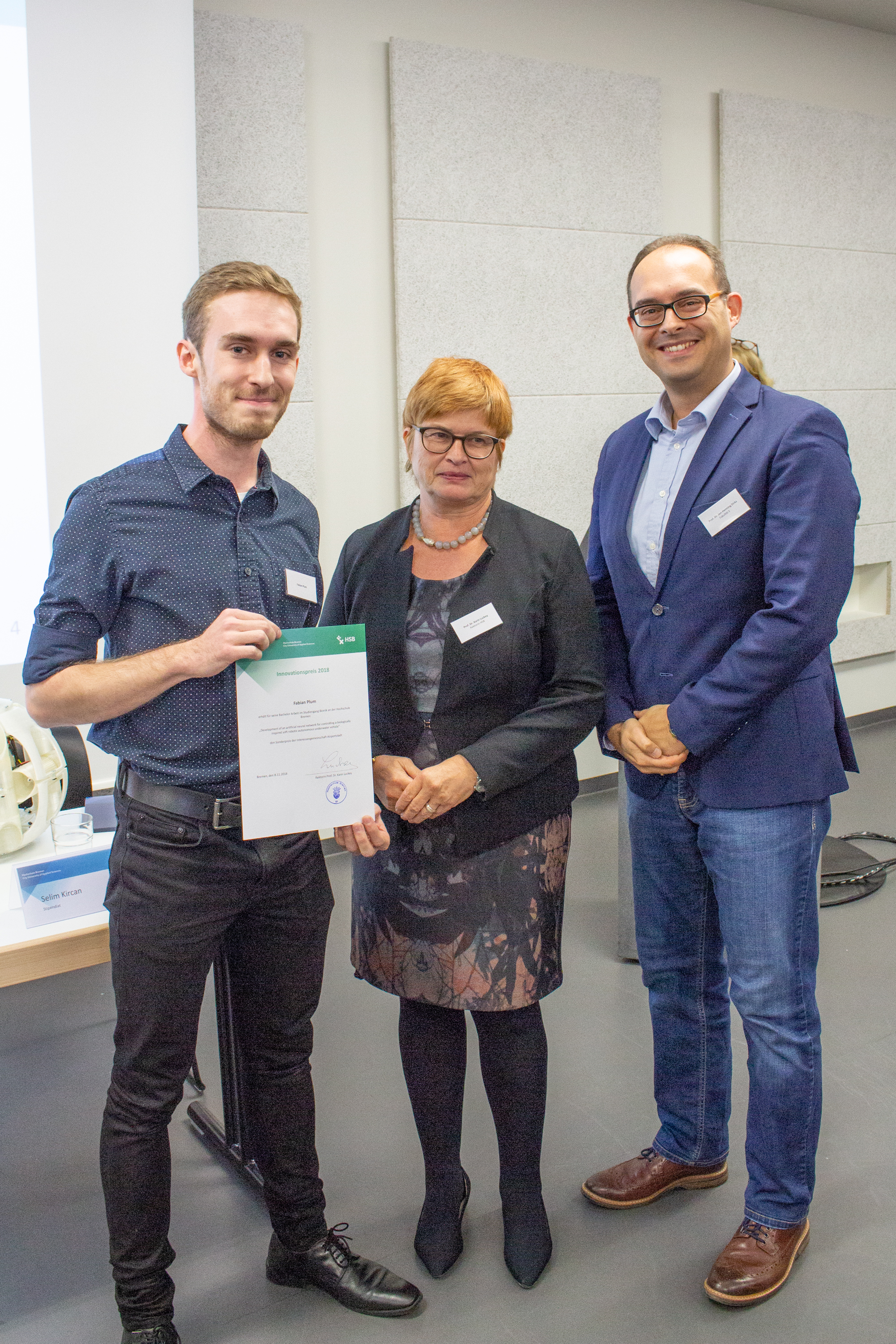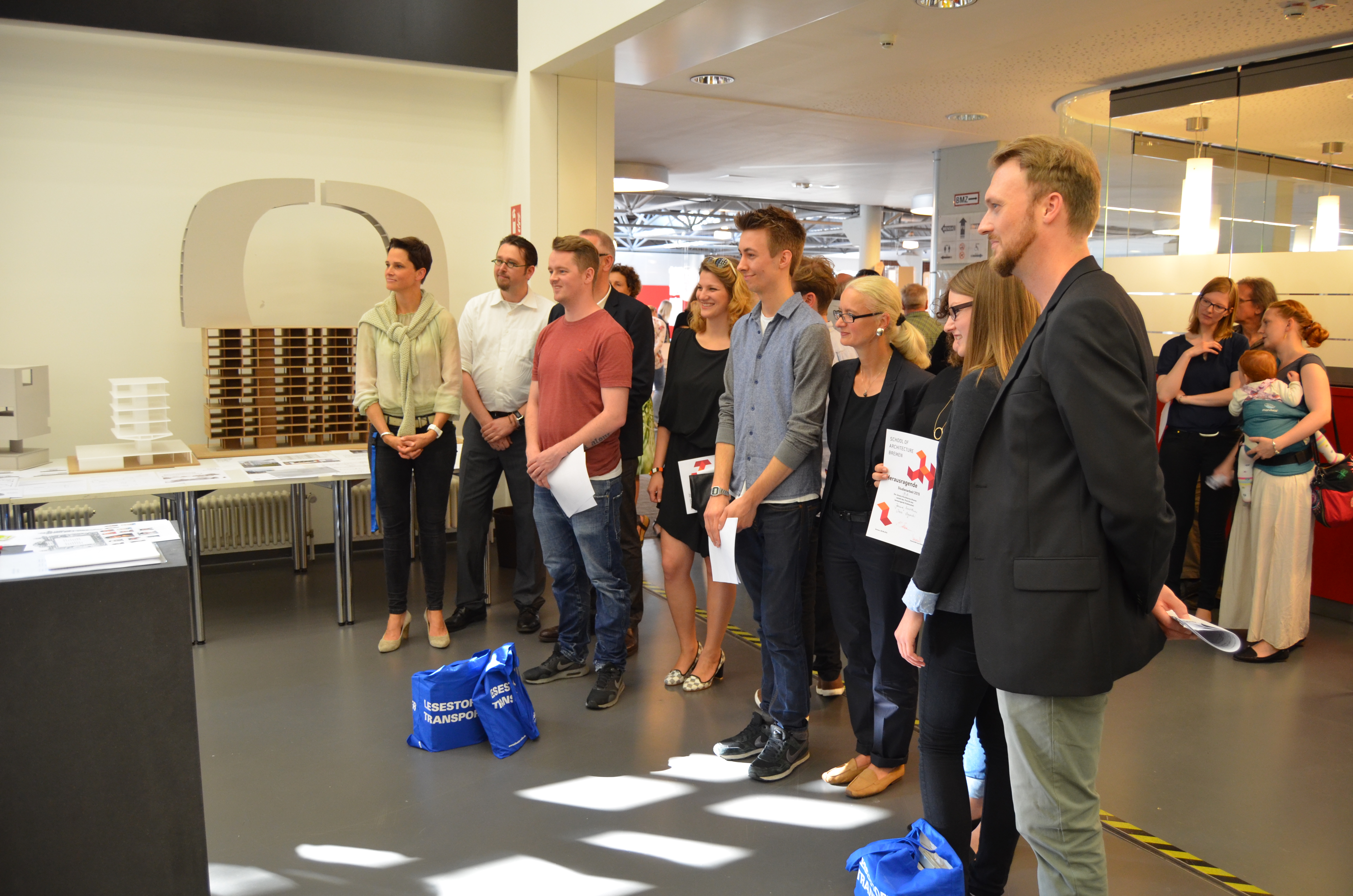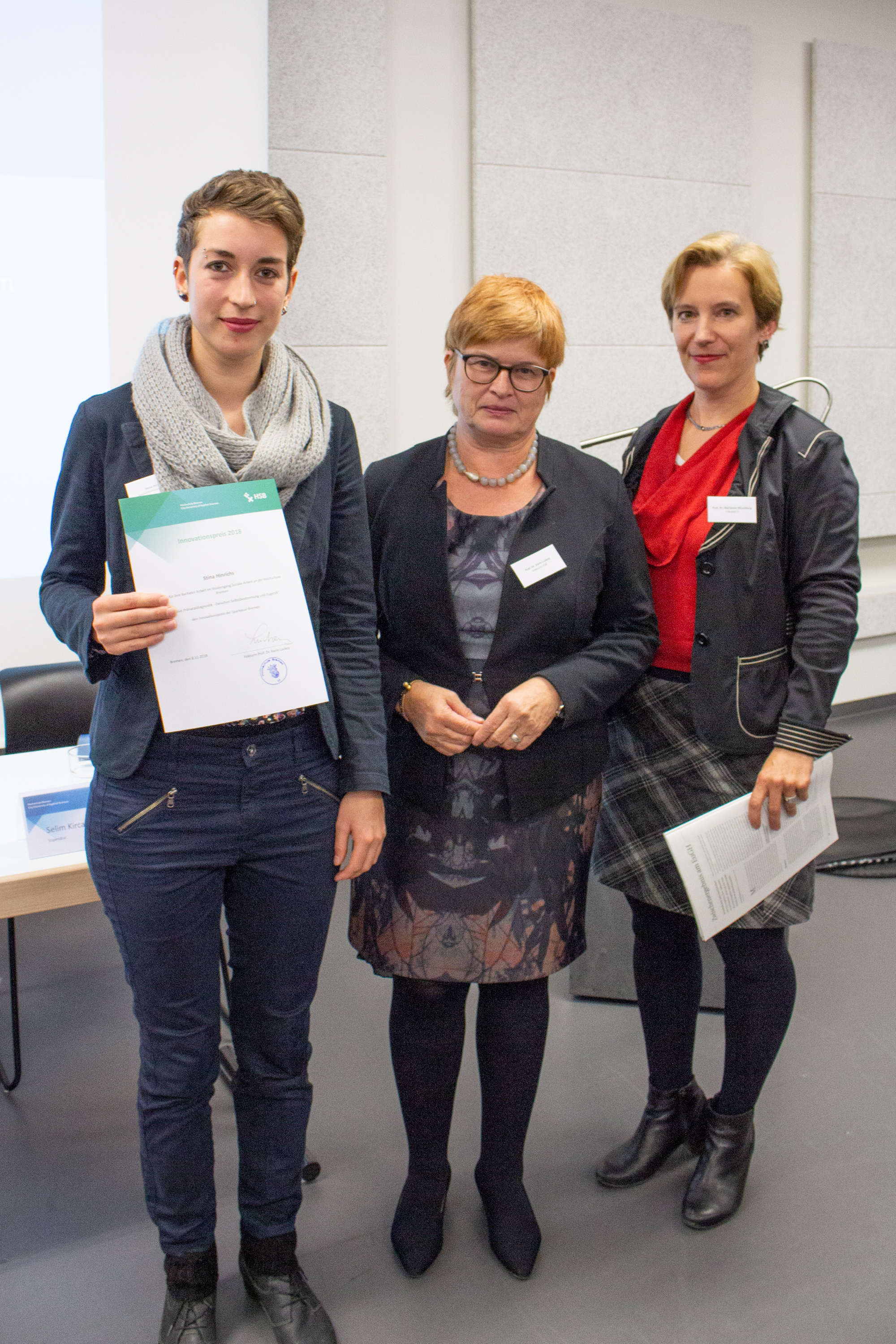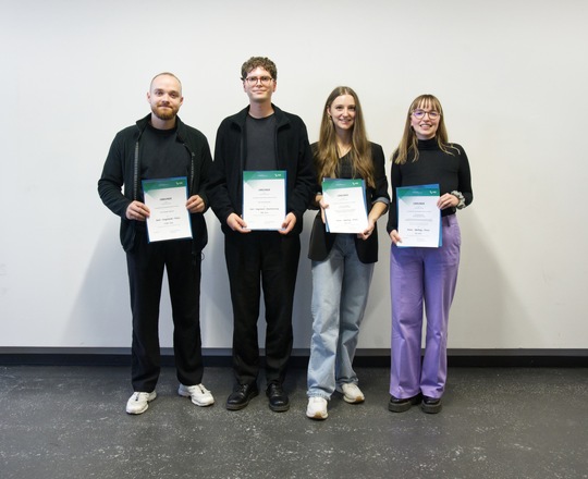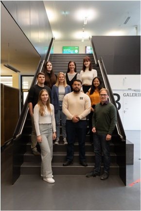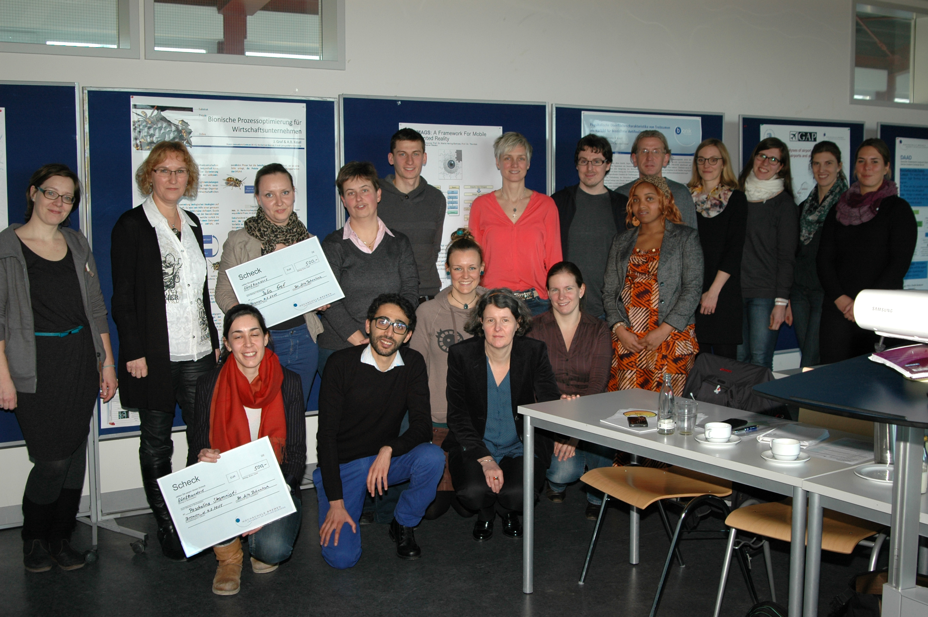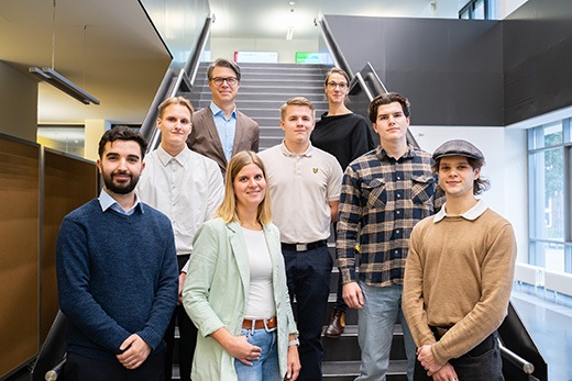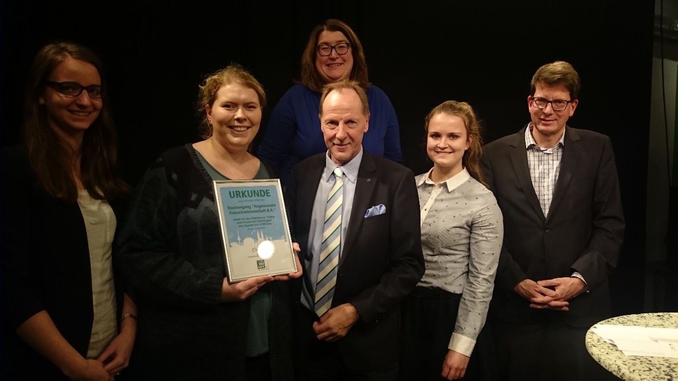 v.l.n.r.: Prof. Dr. Wiebke Scharff Rethfeldt (Betreuerin), Anna-Maria Kuttenreich (Preisträgerin), Uwe Nullmeyer (Initiativkreis), Tim Reiners (Initiativkreis; halb verdeckt), Rektorin Prof. Dr. Karin Luckey, Dr. Frank Thoss (Initiativkreis), Julia Maxwitat-Balzer (Sparkassen-Stiftung), David Hamburger (Preisträger), Prof. Dr. Ulrich Kuron (Betreuer), Julius Hetzel (Preisträger) und Prof. Dr. Martin Hering-Bertram (Betreuer) (Fotograf: Shuvo Sarkar, Hochschule Bremen)