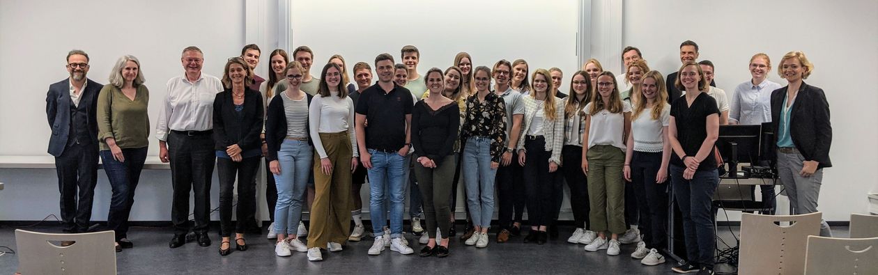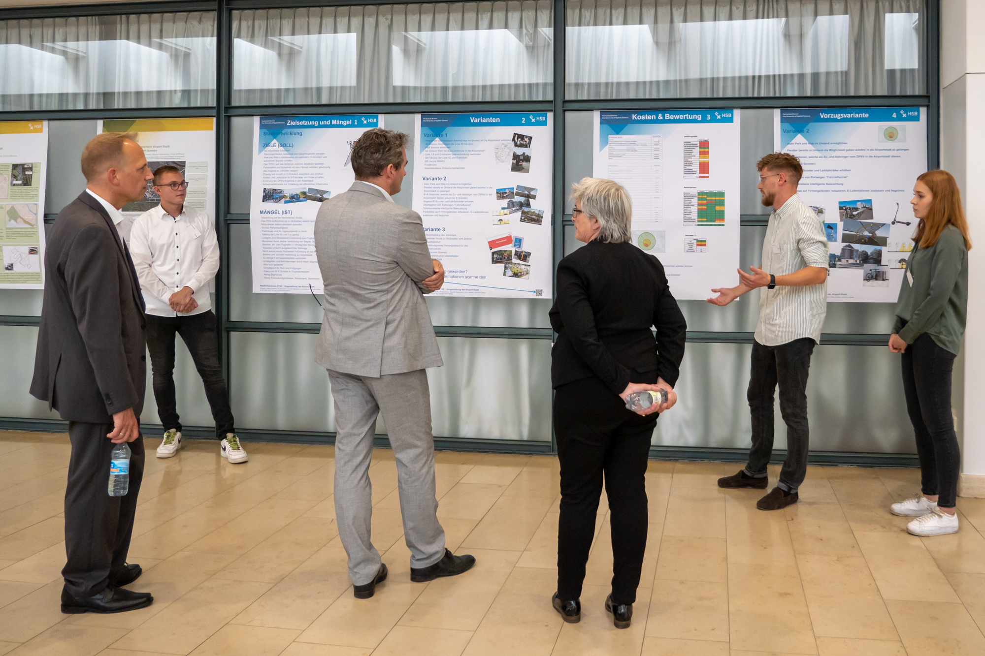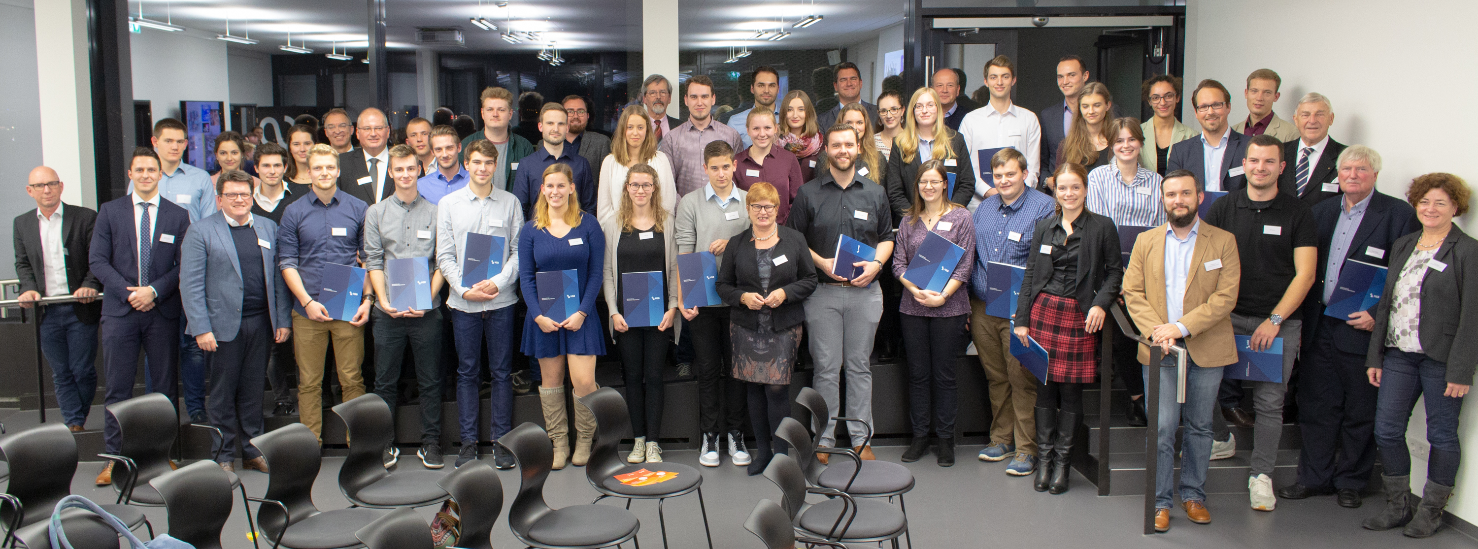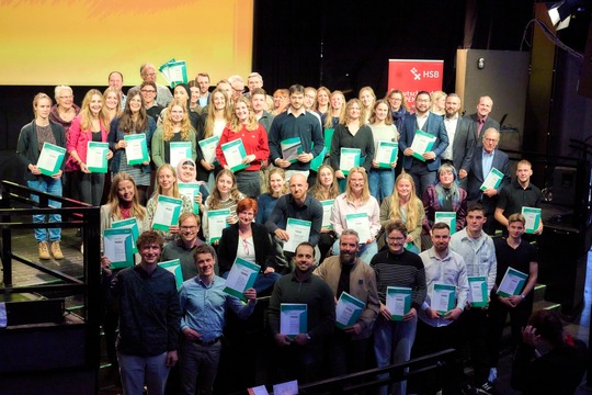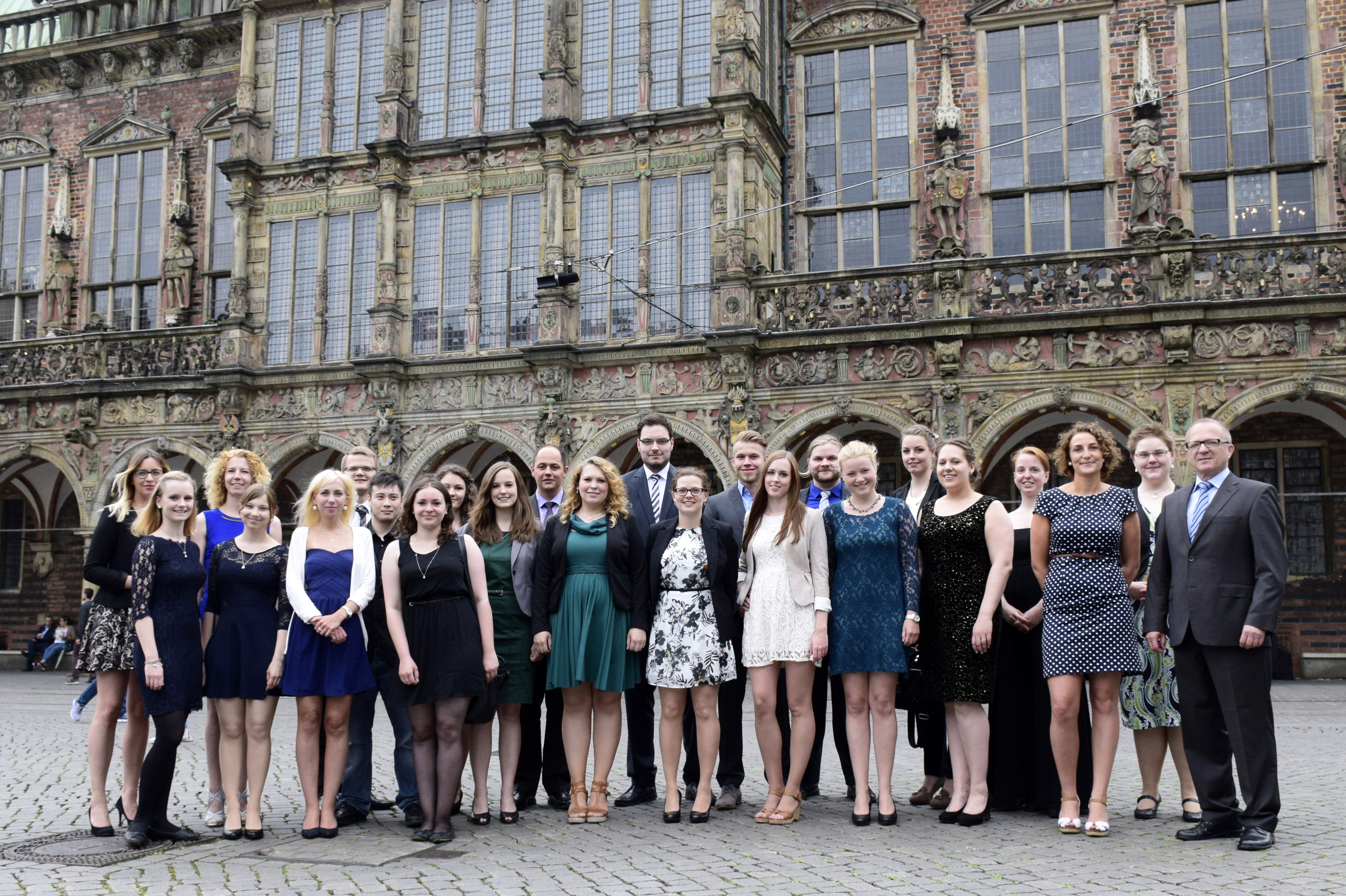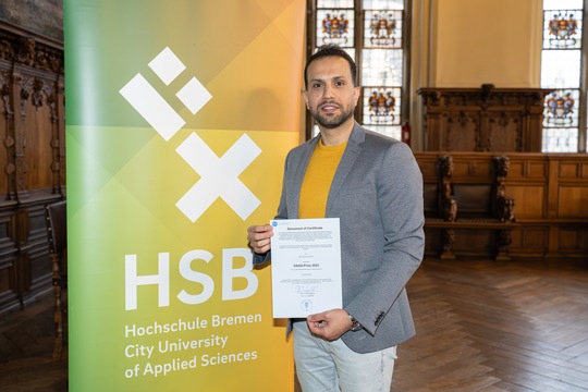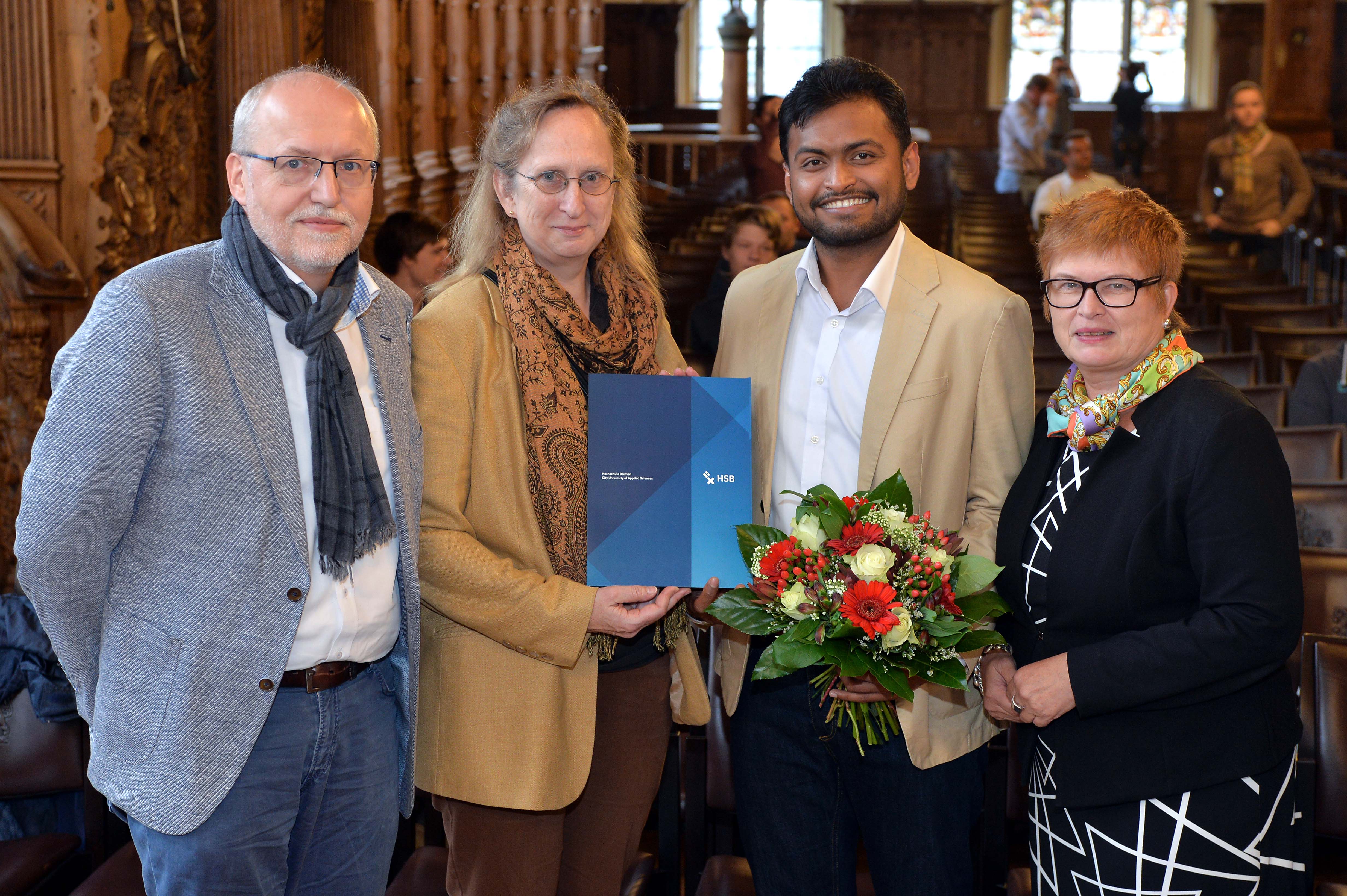 v.l.n.r.: Prof. Dr. Wiebke Scharff Rethfeldt (Betreuerin), Anna-Maria Kuttenreich (Preisträgerin), Uwe Nullmeyer (Initiativkreis), Tim Reiners (Initiativkreis; halb verdeckt), Rektorin Prof. Dr. Karin Luckey, Dr. Frank Thoss (Initiativkreis), Julia Maxwitat-Balzer (Sparkassen-Stiftung), David Hamburger (Preisträger), Prof. Dr. Ulrich Kuron (Betreuer), Julius Hetzel (Preisträger) und Prof. Dr. Martin Hering-Bertram (Betreuer) (Fotograf: Shuvo Sarkar, Hochschule Bremen)