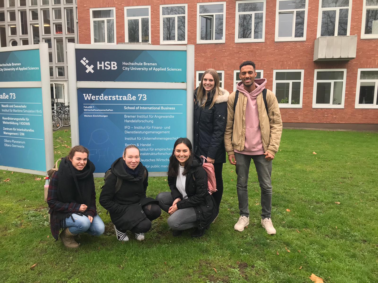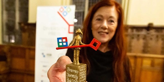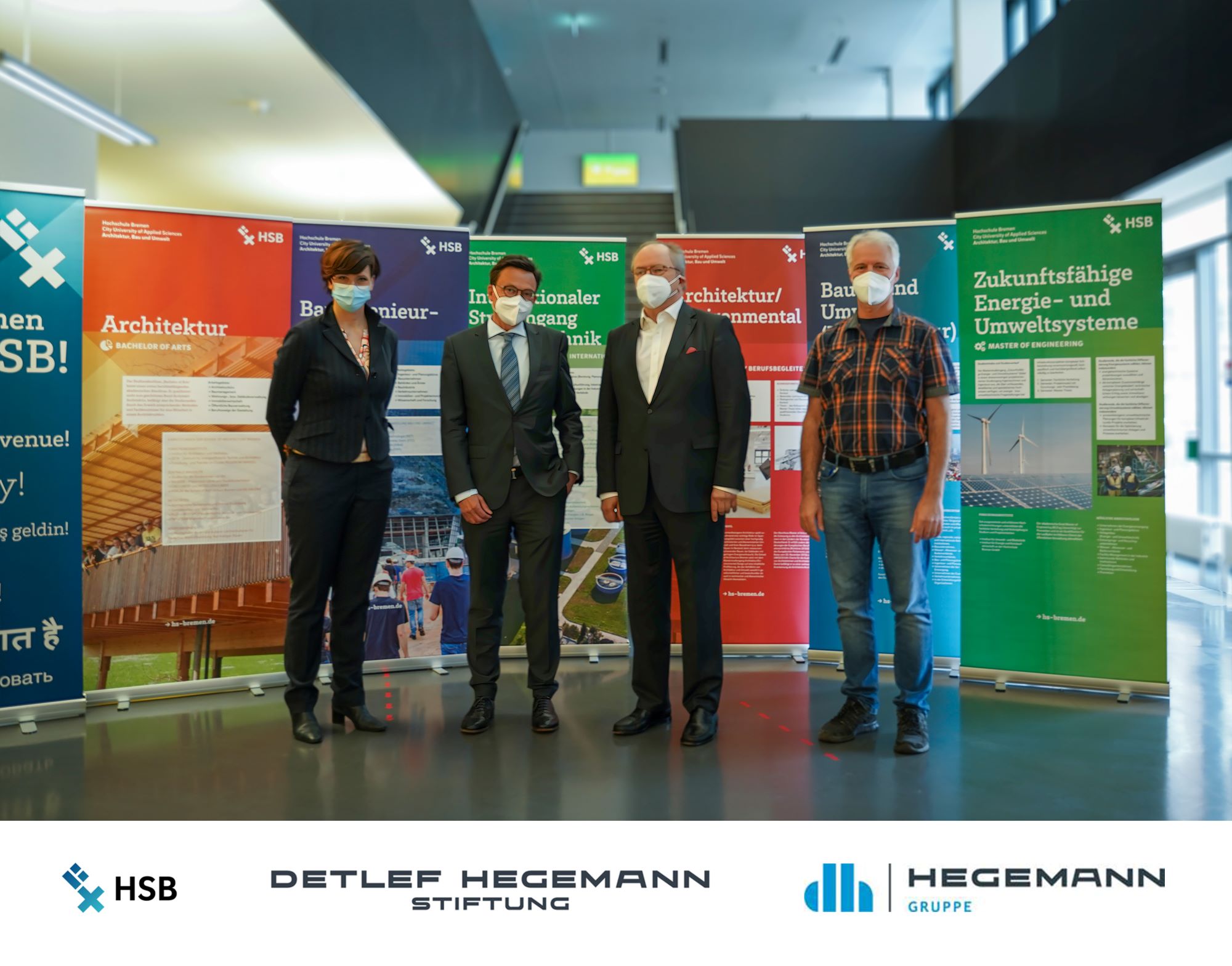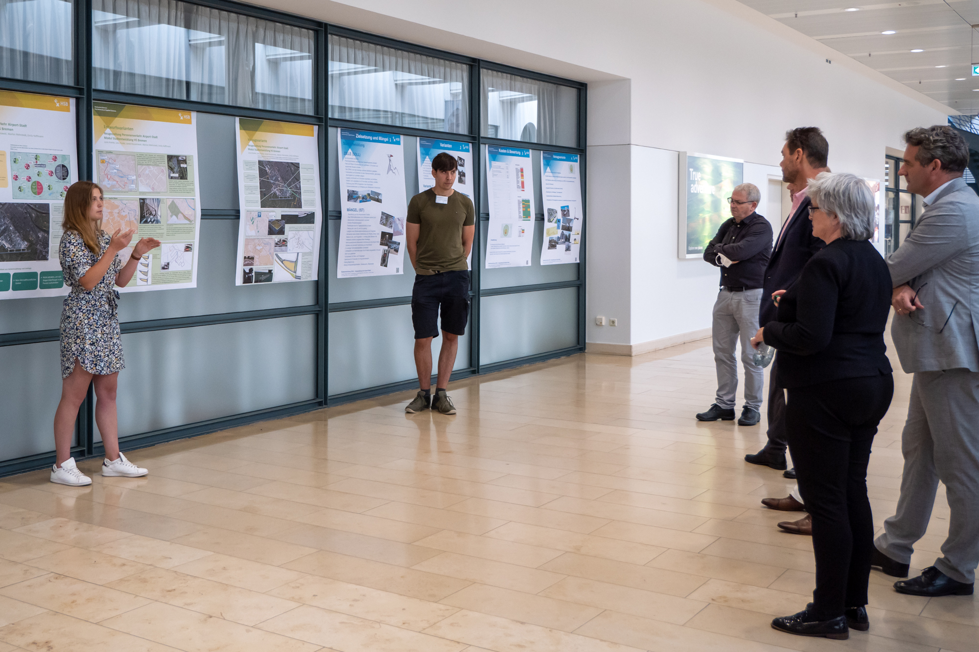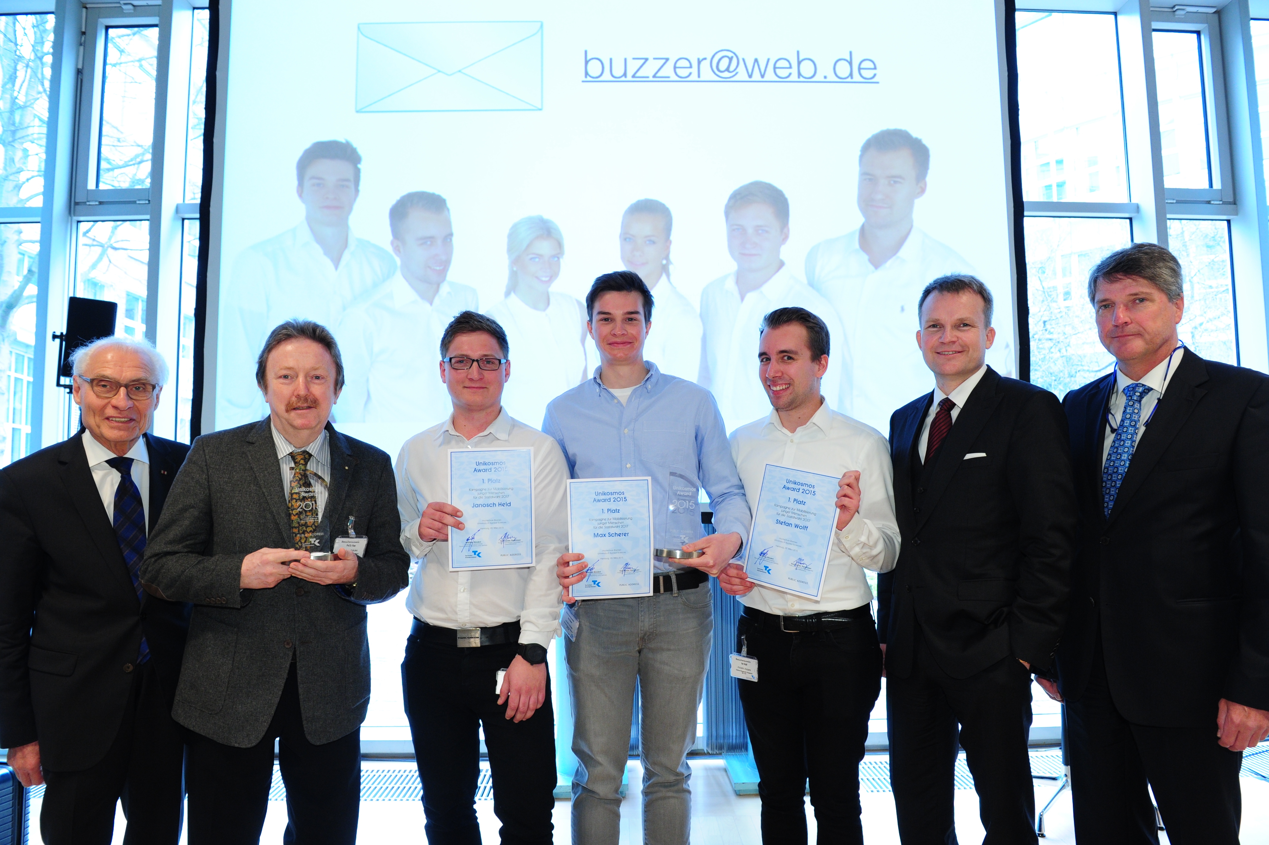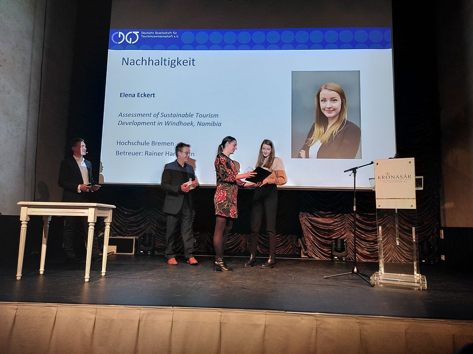 v.l.n.r.: Prof. Dr. Wiebke Scharff Rethfeldt (Betreuerin), Anna-Maria Kuttenreich (Preisträgerin), Uwe Nullmeyer (Initiativkreis), Tim Reiners (Initiativkreis; halb verdeckt), Rektorin Prof. Dr. Karin Luckey, Dr. Frank Thoss (Initiativkreis), Julia Maxwitat-Balzer (Sparkassen-Stiftung), David Hamburger (Preisträger), Prof. Dr. Ulrich Kuron (Betreuer), Julius Hetzel (Preisträger) und Prof. Dr. Martin Hering-Bertram (Betreuer) (Fotograf: Shuvo Sarkar, Hochschule Bremen)