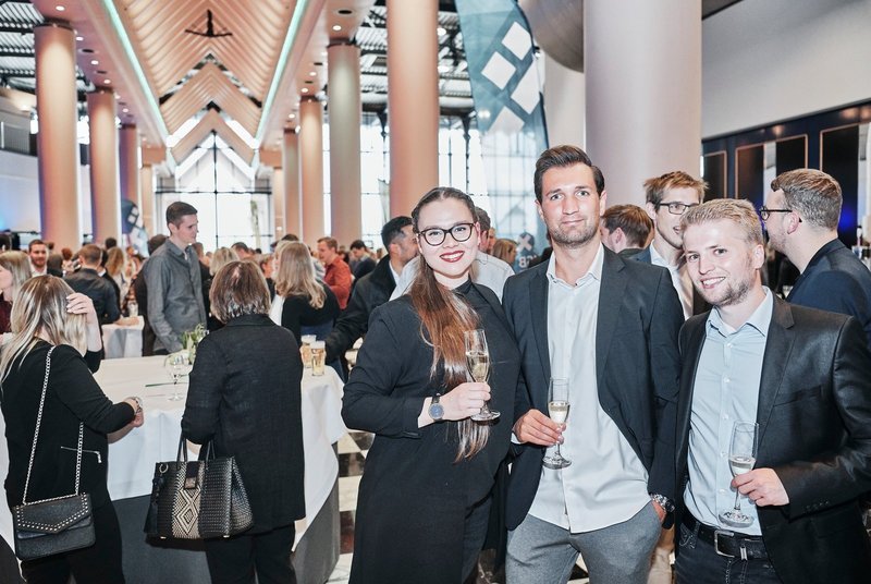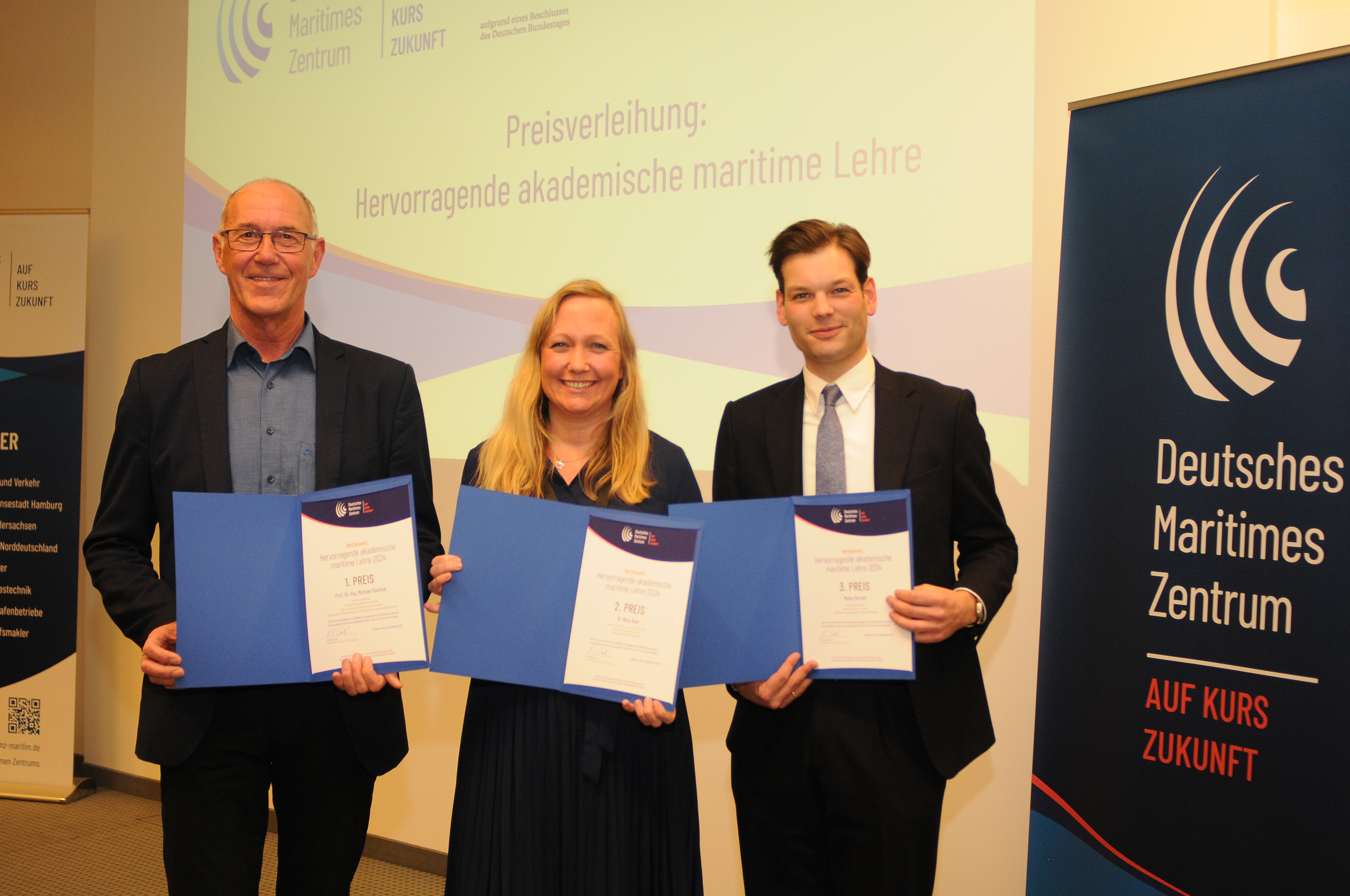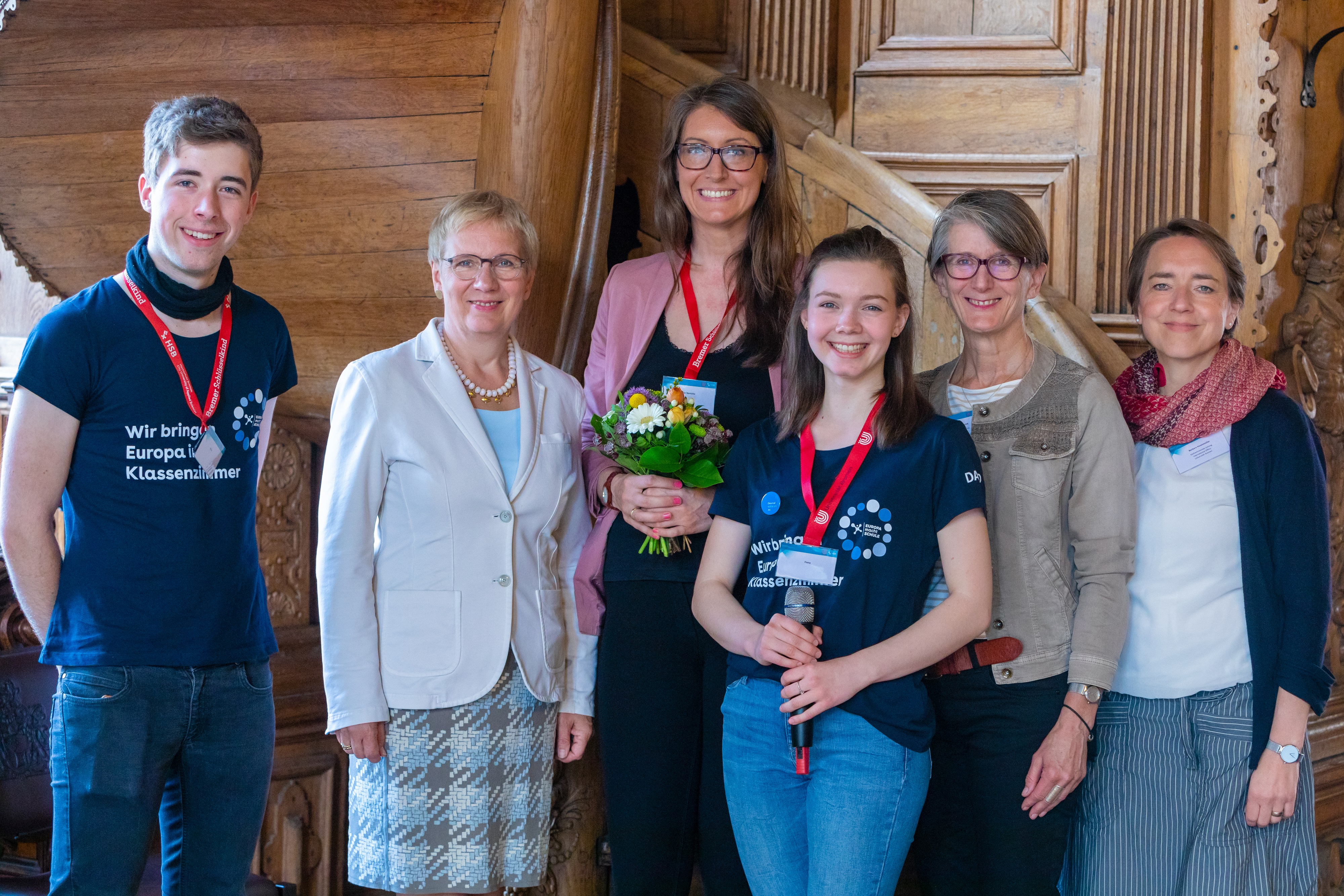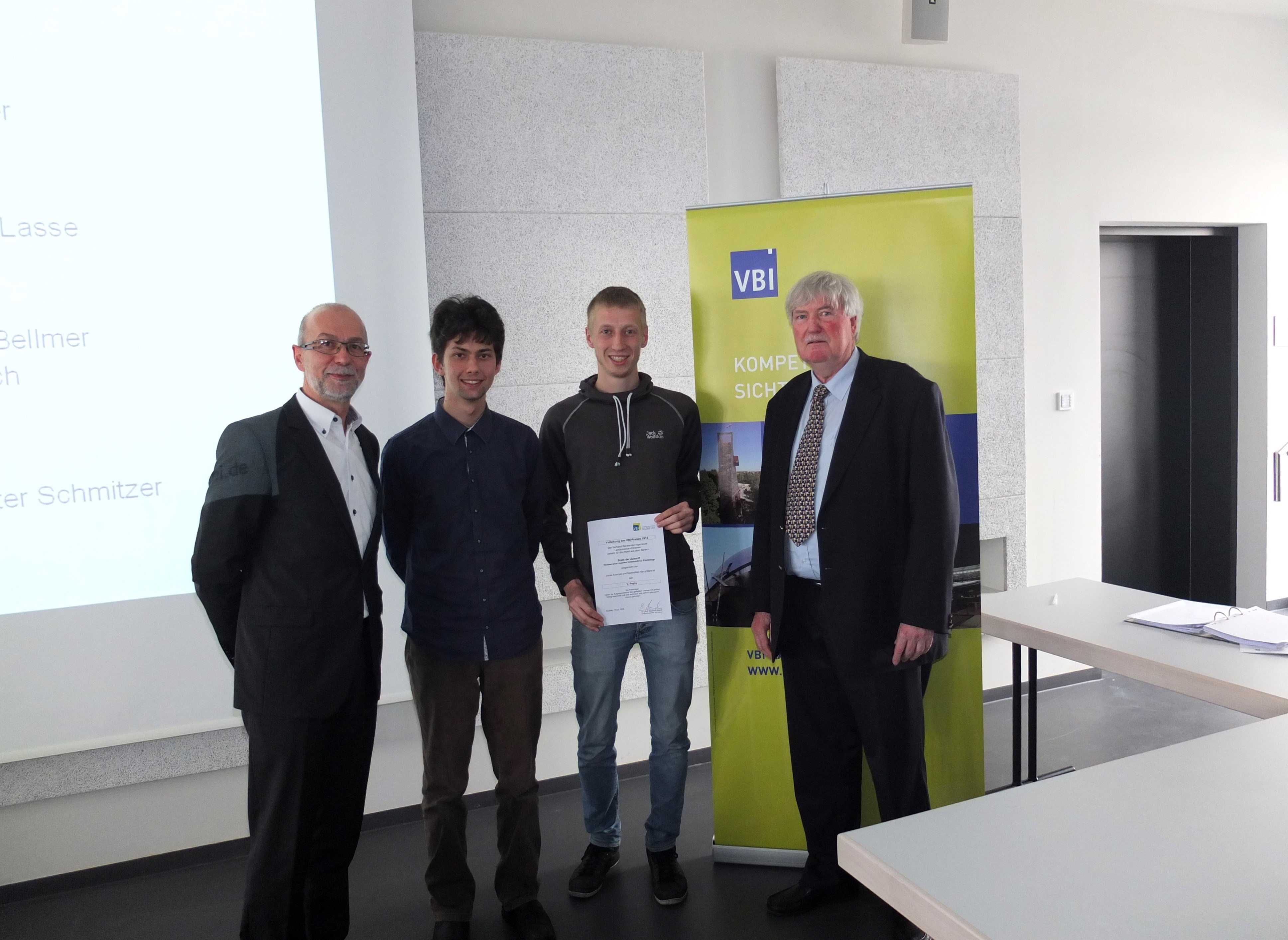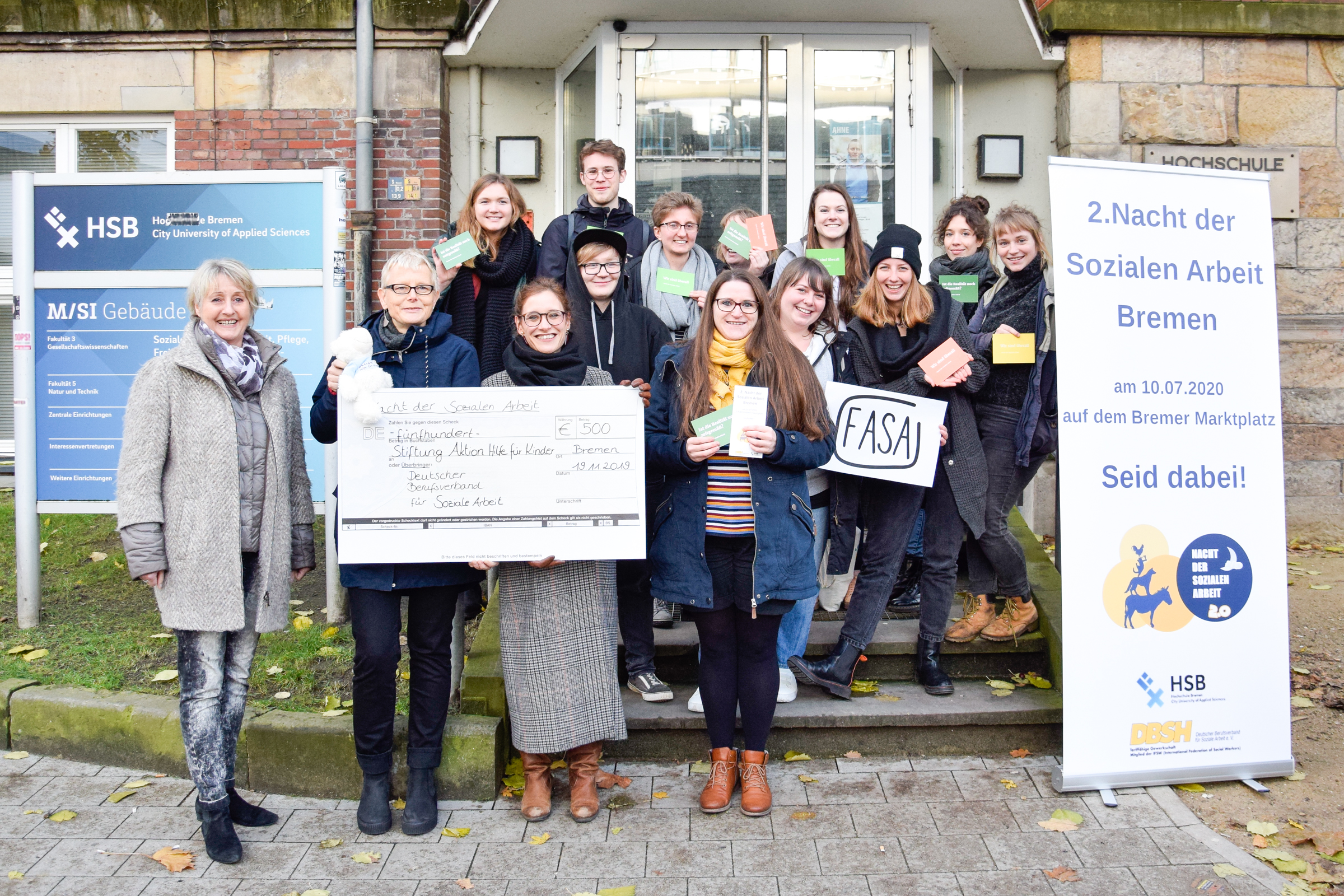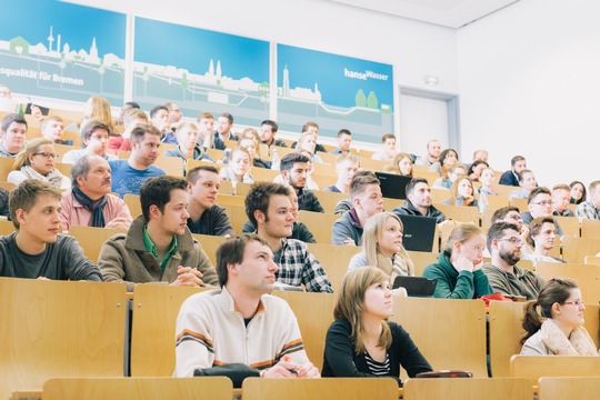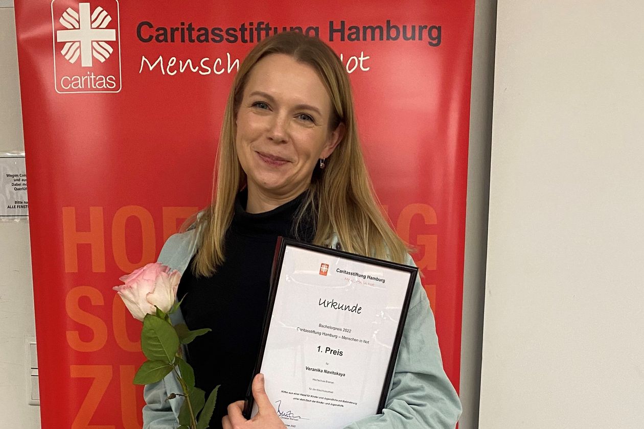 v.l.n.r.: Prof. Dr. Wiebke Scharff Rethfeldt (Betreuerin), Anna-Maria Kuttenreich (Preisträgerin), Uwe Nullmeyer (Initiativkreis), Tim Reiners (Initiativkreis; halb verdeckt), Rektorin Prof. Dr. Karin Luckey, Dr. Frank Thoss (Initiativkreis), Julia Maxwitat-Balzer (Sparkassen-Stiftung), David Hamburger (Preisträger), Prof. Dr. Ulrich Kuron (Betreuer), Julius Hetzel (Preisträger) und Prof. Dr. Martin Hering-Bertram (Betreuer) (Fotograf: Shuvo Sarkar, Hochschule Bremen)