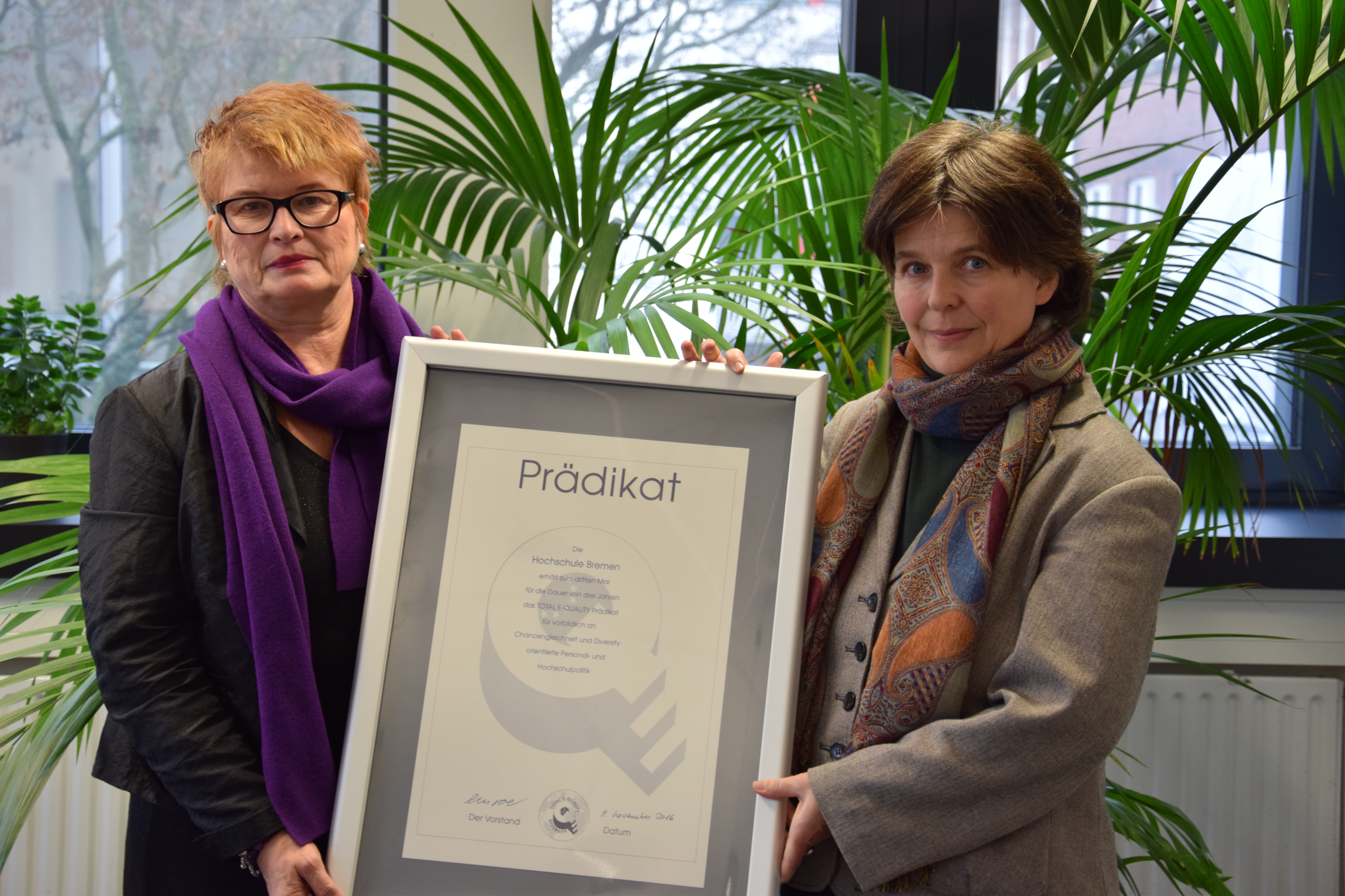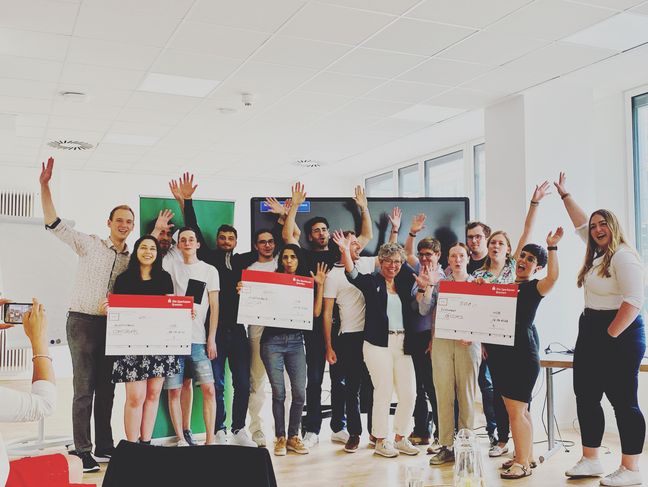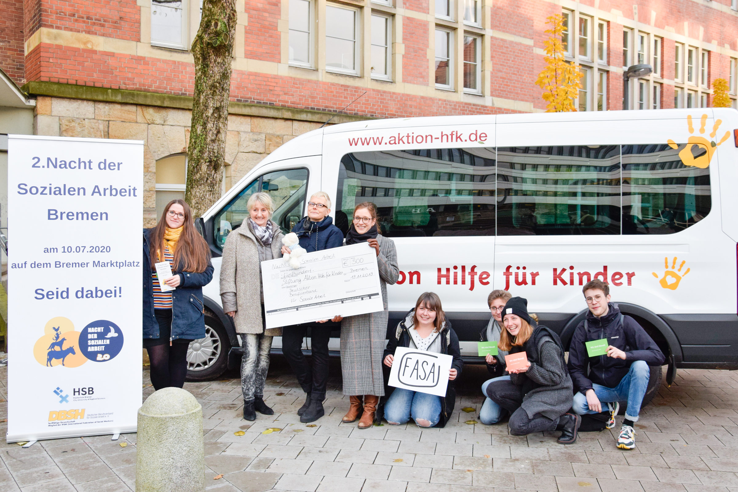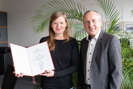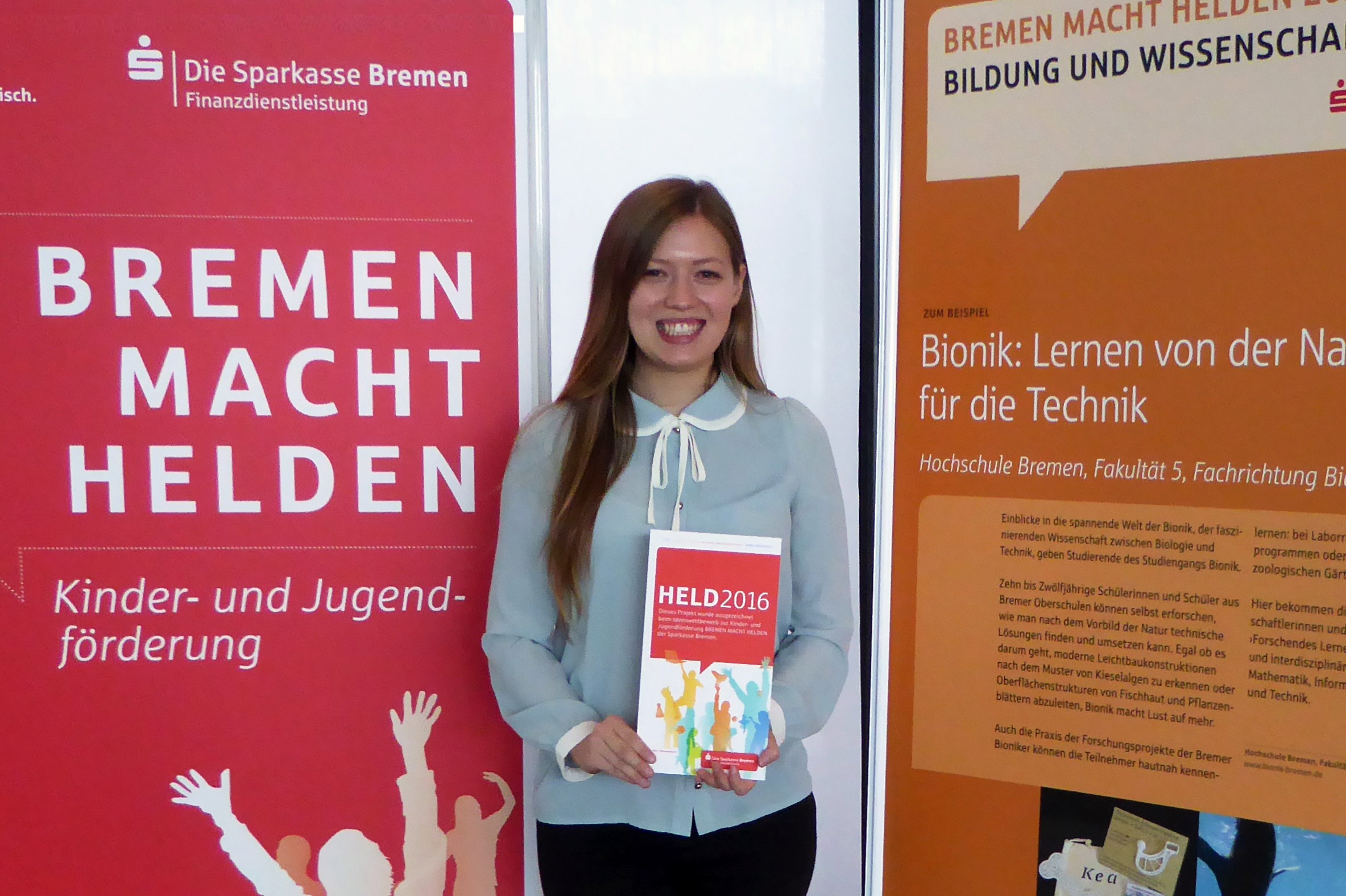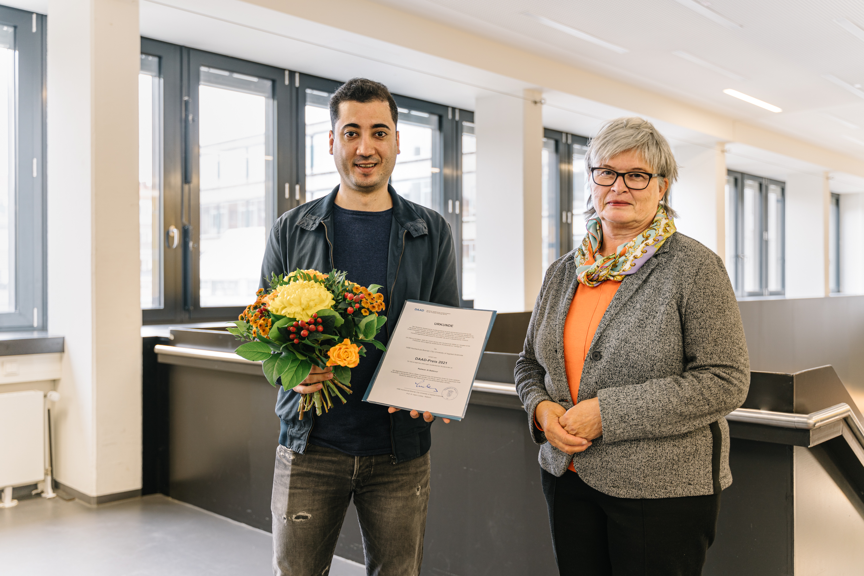 v.l.n.r.: Prof. Dr. Wiebke Scharff Rethfeldt (Betreuerin), Anna-Maria Kuttenreich (Preisträgerin), Uwe Nullmeyer (Initiativkreis), Tim Reiners (Initiativkreis; halb verdeckt), Rektorin Prof. Dr. Karin Luckey, Dr. Frank Thoss (Initiativkreis), Julia Maxwitat-Balzer (Sparkassen-Stiftung), David Hamburger (Preisträger), Prof. Dr. Ulrich Kuron (Betreuer), Julius Hetzel (Preisträger) und Prof. Dr. Martin Hering-Bertram (Betreuer) (Fotograf: Shuvo Sarkar, Hochschule Bremen)