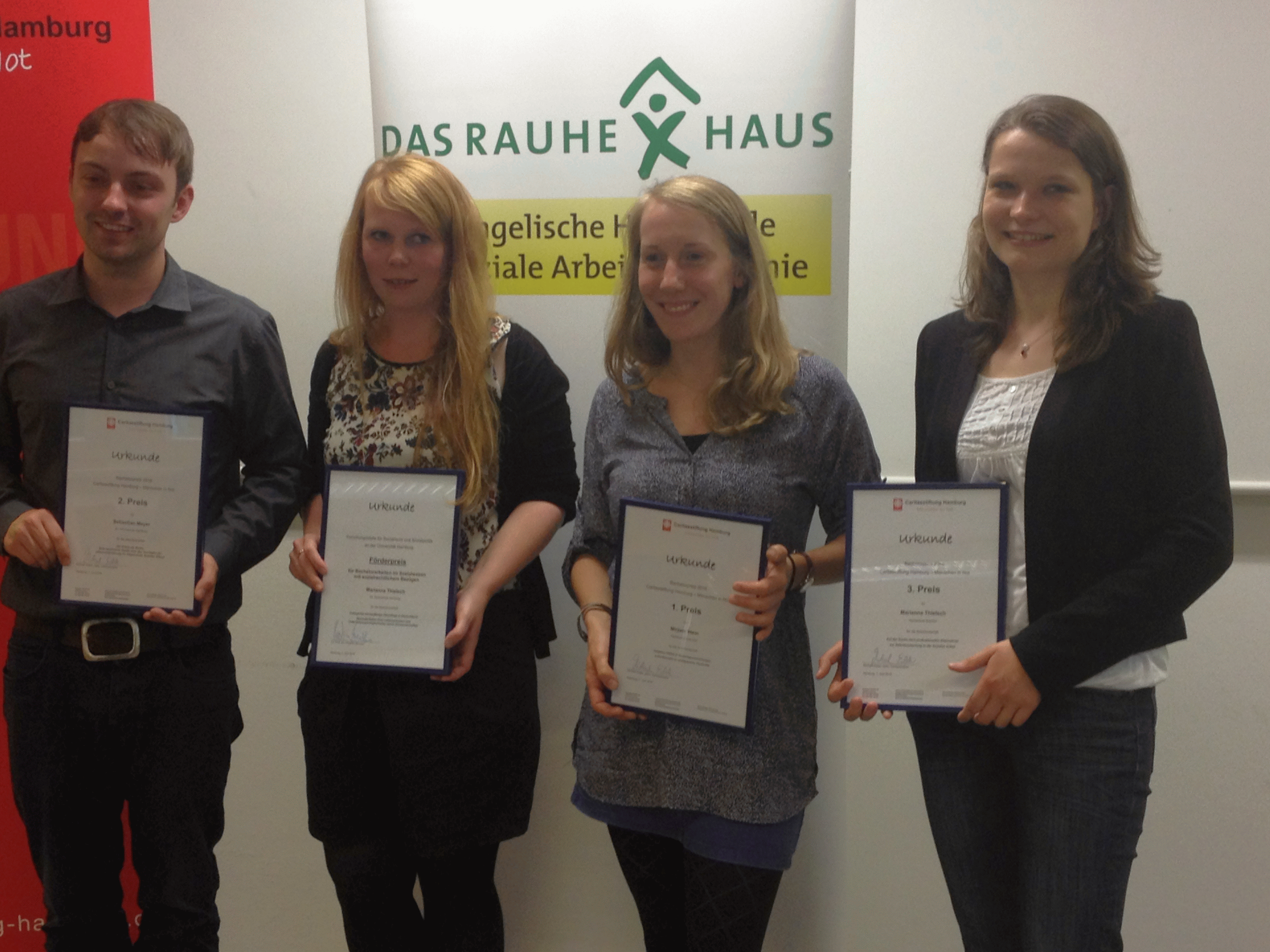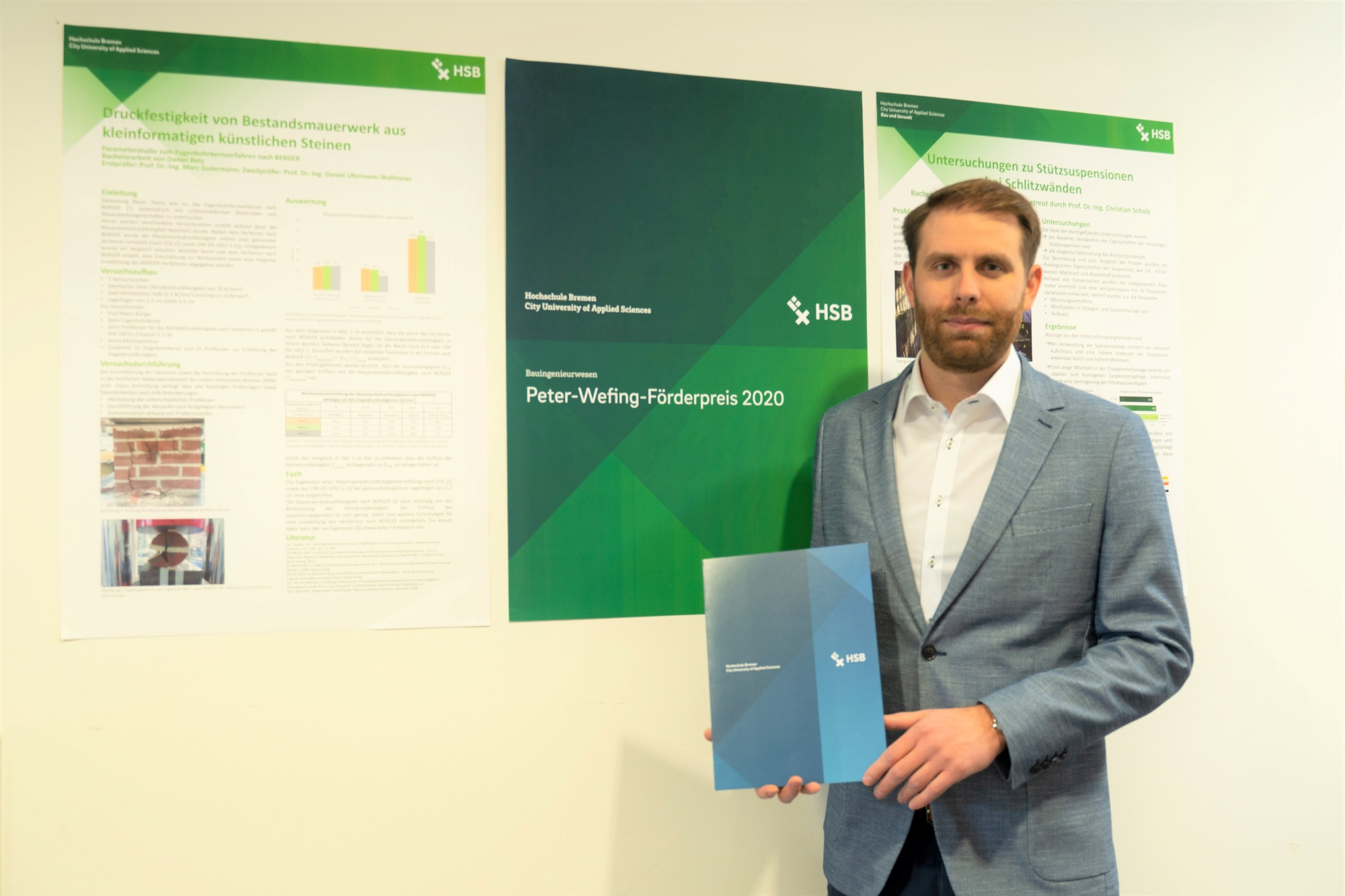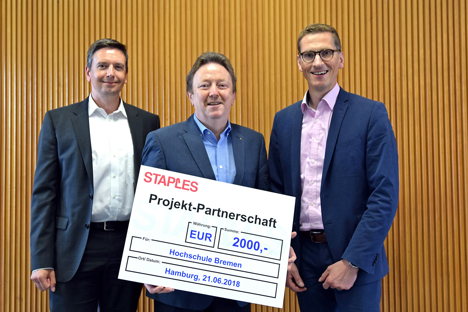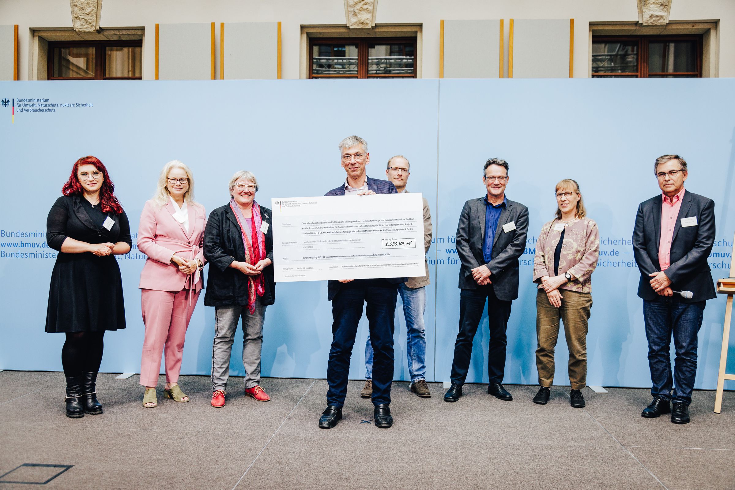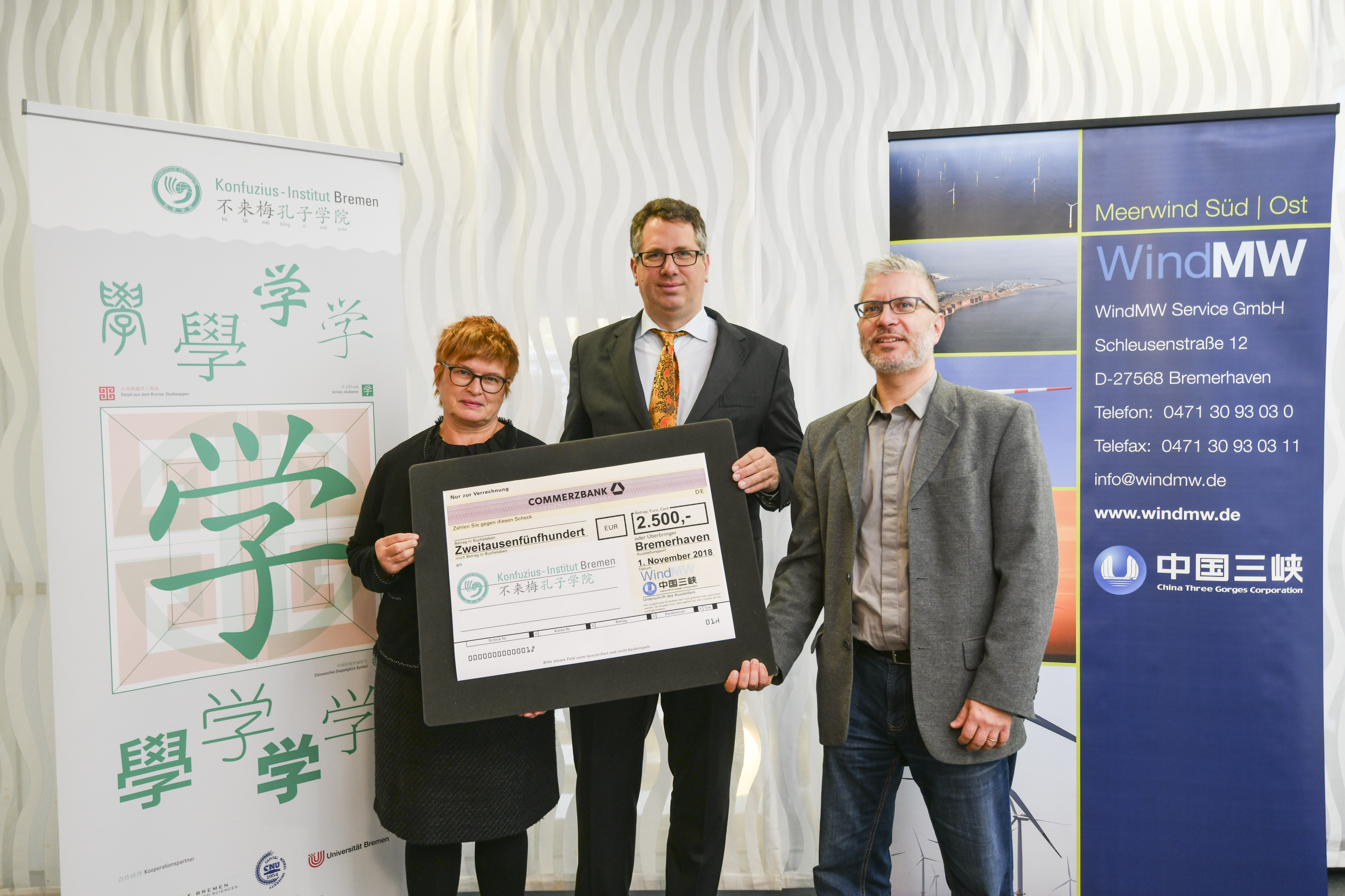 v.l.n.r.: Prof. Dr. Wiebke Scharff Rethfeldt (Betreuerin), Anna-Maria Kuttenreich (Preisträgerin), Uwe Nullmeyer (Initiativkreis), Tim Reiners (Initiativkreis; halb verdeckt), Rektorin Prof. Dr. Karin Luckey, Dr. Frank Thoss (Initiativkreis), Julia Maxwitat-Balzer (Sparkassen-Stiftung), David Hamburger (Preisträger), Prof. Dr. Ulrich Kuron (Betreuer), Julius Hetzel (Preisträger) und Prof. Dr. Martin Hering-Bertram (Betreuer) (Fotograf: Shuvo Sarkar, Hochschule Bremen)
