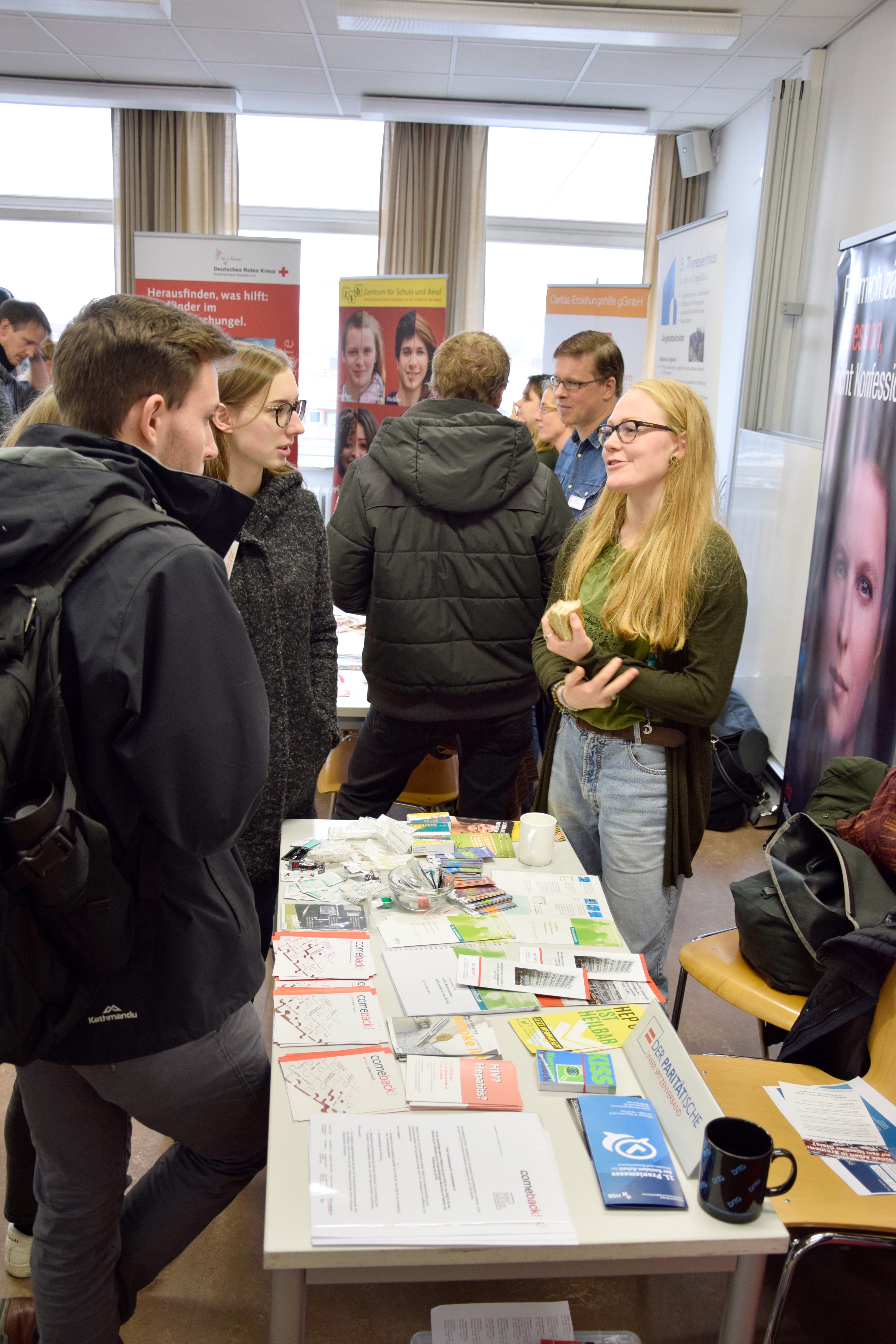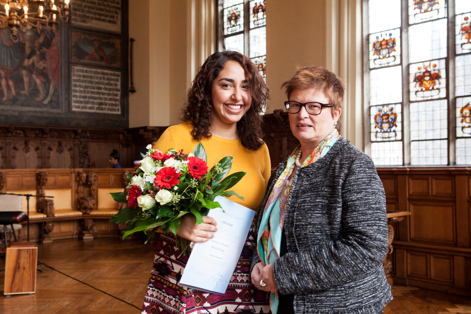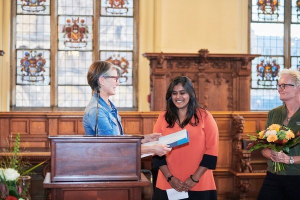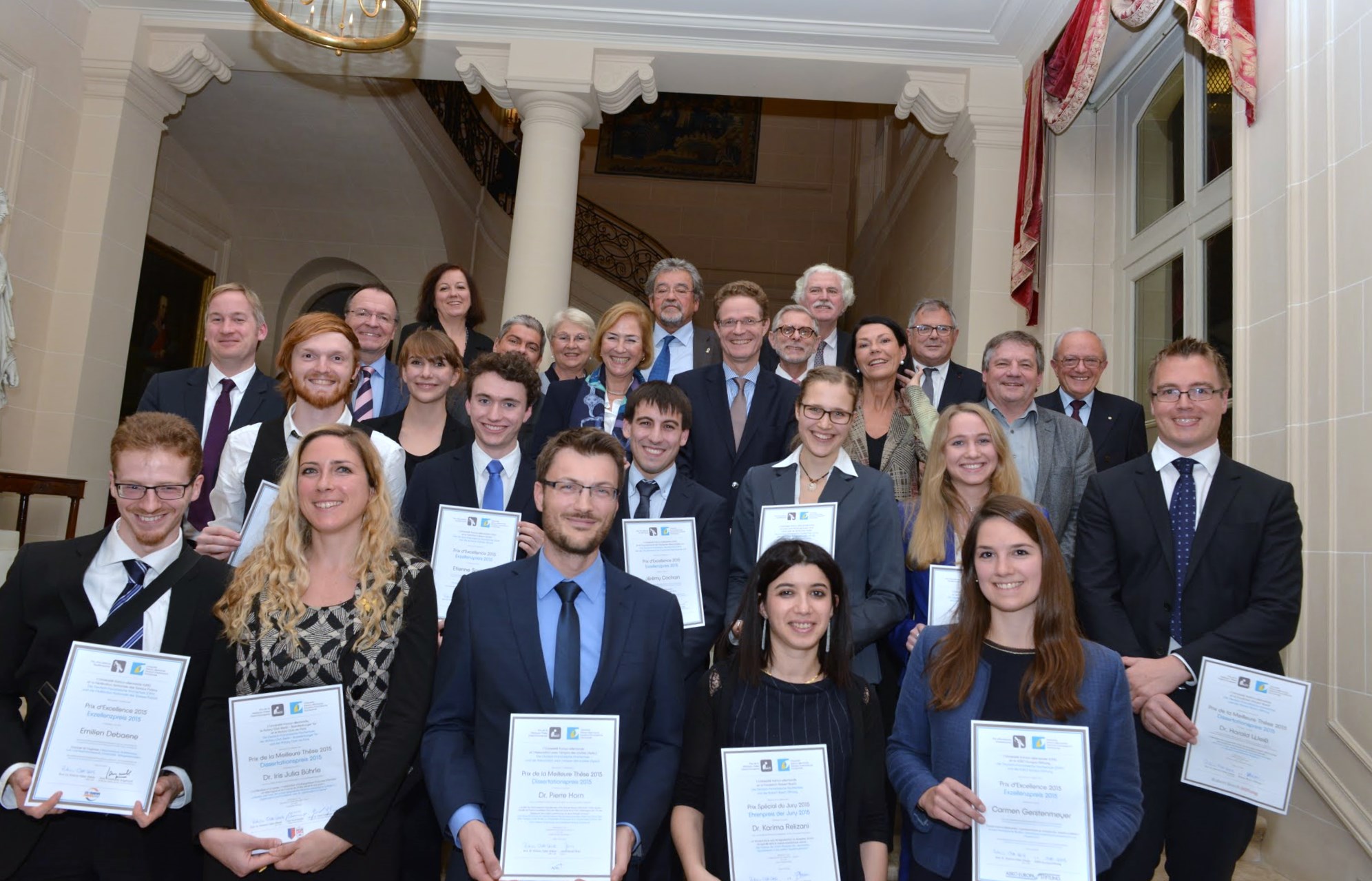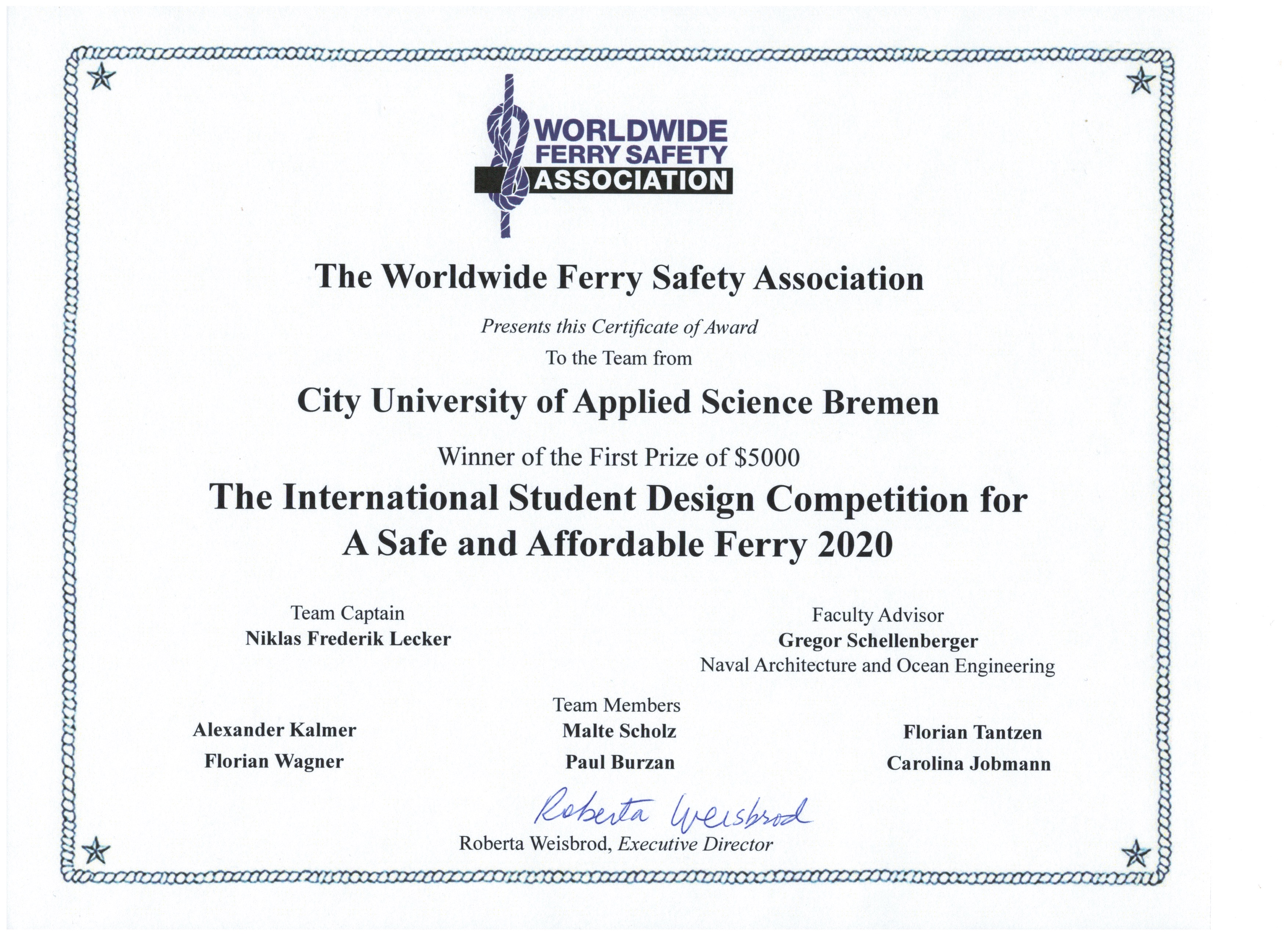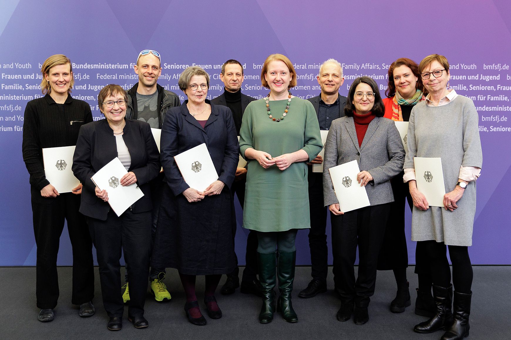 v.l.n.r.: Prof. Dr. Wiebke Scharff Rethfeldt (Betreuerin), Anna-Maria Kuttenreich (Preisträgerin), Uwe Nullmeyer (Initiativkreis), Tim Reiners (Initiativkreis; halb verdeckt), Rektorin Prof. Dr. Karin Luckey, Dr. Frank Thoss (Initiativkreis), Julia Maxwitat-Balzer (Sparkassen-Stiftung), David Hamburger (Preisträger), Prof. Dr. Ulrich Kuron (Betreuer), Julius Hetzel (Preisträger) und Prof. Dr. Martin Hering-Bertram (Betreuer) (Fotograf: Shuvo Sarkar, Hochschule Bremen)