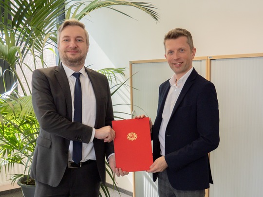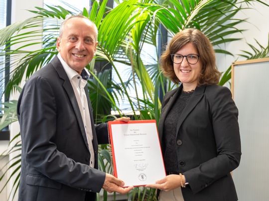 von links: Simon Jäckel (VDI Verein Deutscher Ingenieure), Emmanuel Siefert (Bionic Award 2023 Gewinner, Université libre de Bruxelles), Prof. Dr. Karin Luckey (Rektorin der HSB), Jean Cappello (Bionic Award 2023 Gewinner, Université libre de Bruxelles), Prof. Dr. Antonia B. Kesel (Studiengangsleitung Bionik & B-I-C, HSB, Präsidiumsmitglied des VDI, Vorsitzende VDI-Fachbeirat Bionik), Marc Georg Schauenburg (Schauenburg Stiftung) Copyright: HSB