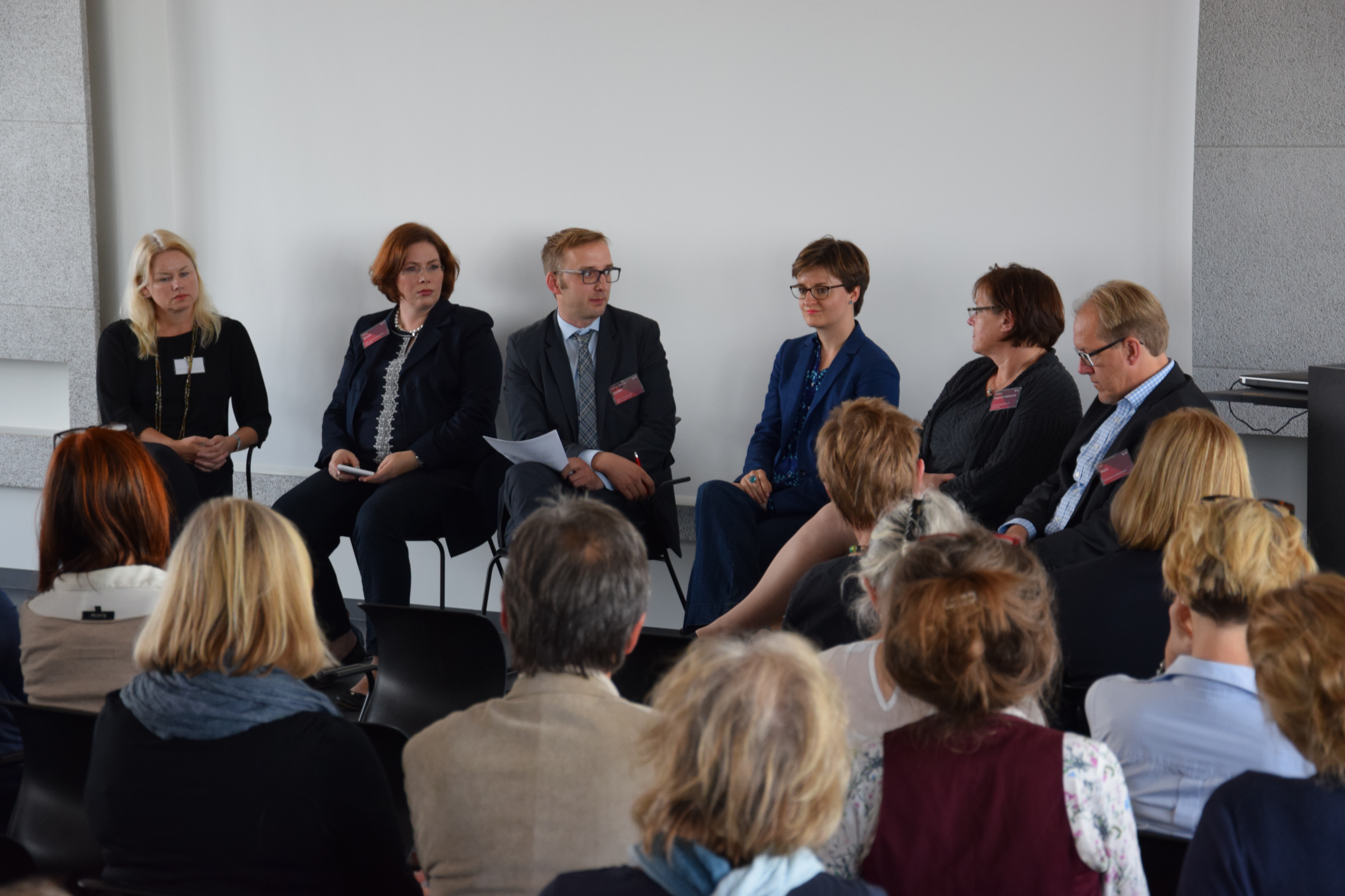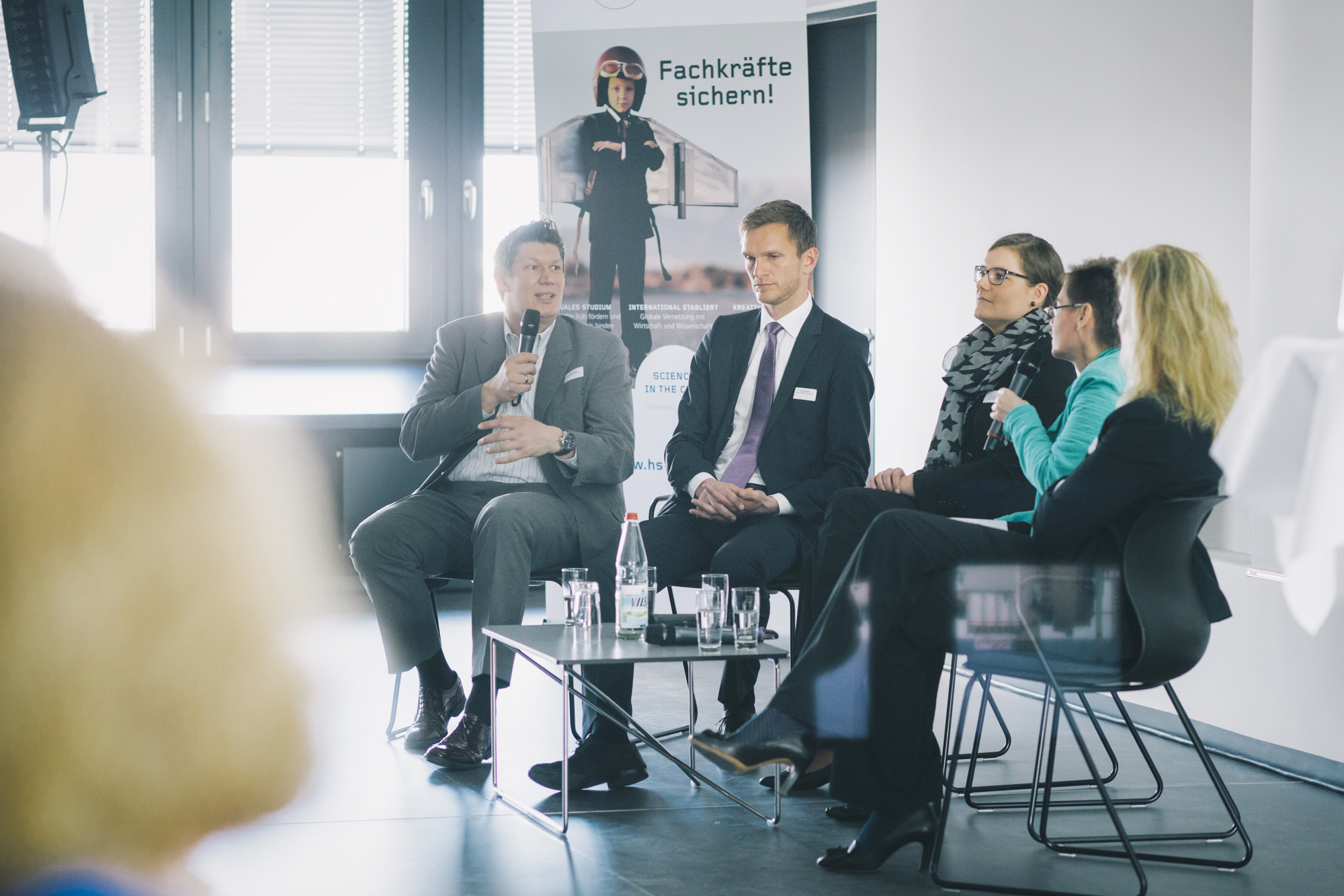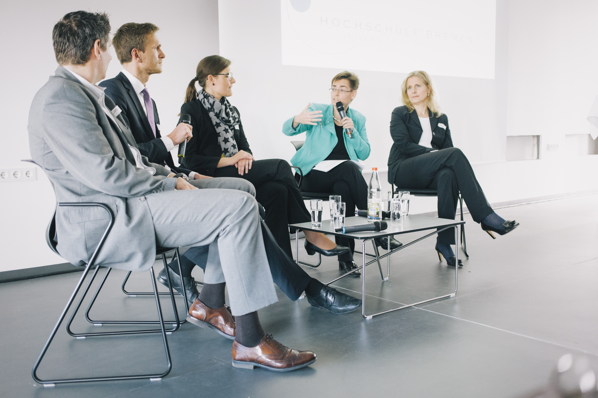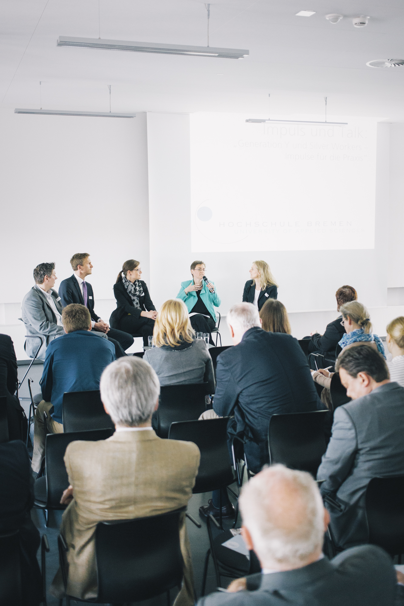 Zu sehen ist die Diskussionsrunde „Generation Y und Silver Workers“ (von links nach rechts): Jörg Pehl, Projektmanager „Demographischer Wandel“ bei ArcelorMittal, Guido Schwarz, Absolvent der Hochschule Bremen, Airbus Defence and Space, Dr. Leena Pundt, Professorin an der Hochschule Bremen für Personalmanagement, Margaret Heckel, Journalistin, Autorin und Moderatorin, und Imke Goller-Wilberg, Unternehmerin und Geschäftsführende Gesellschafterin von „human lead“ und Mitglied im Plenum der Handelskammer Bremen. Fotograf: Sven Stolzenwald