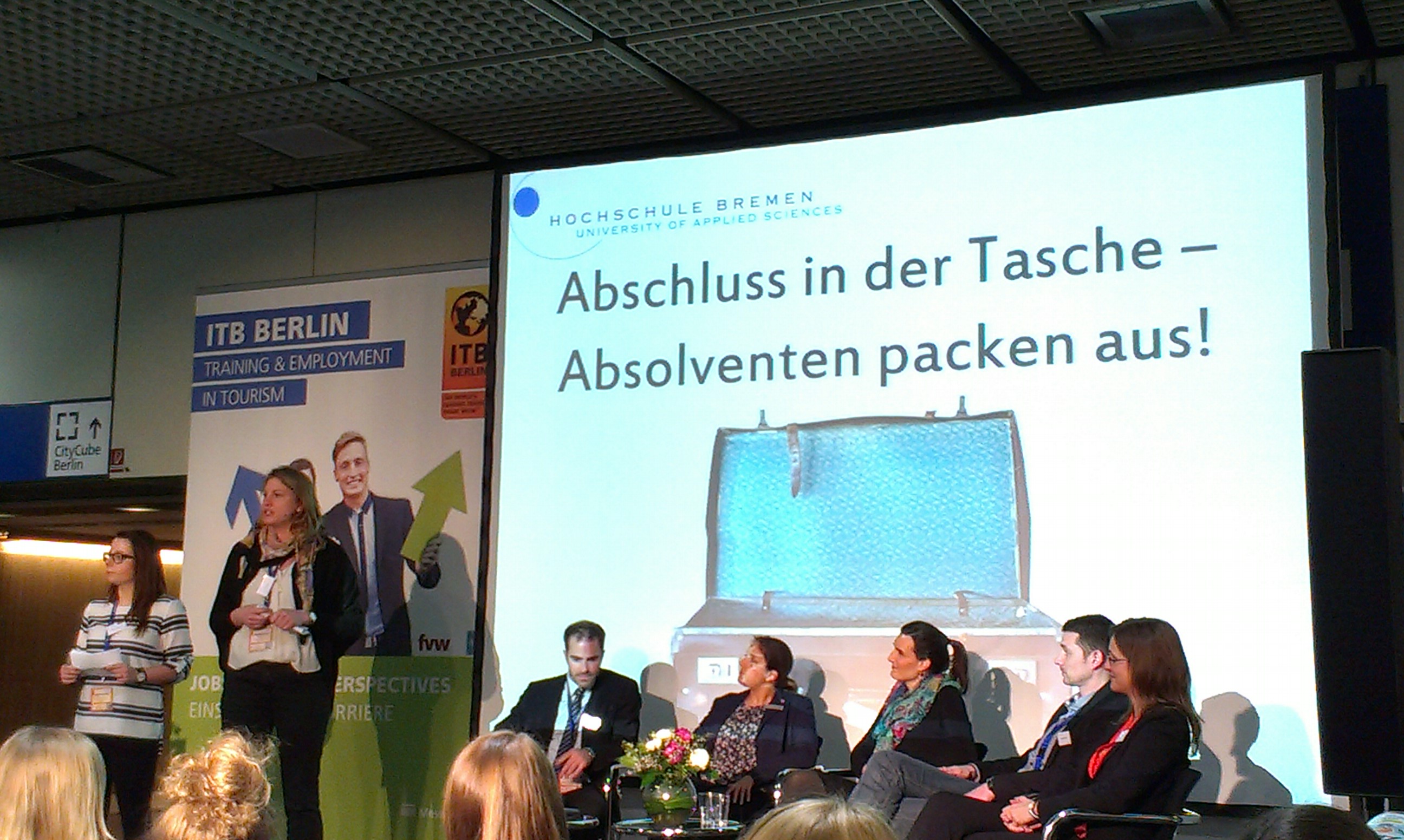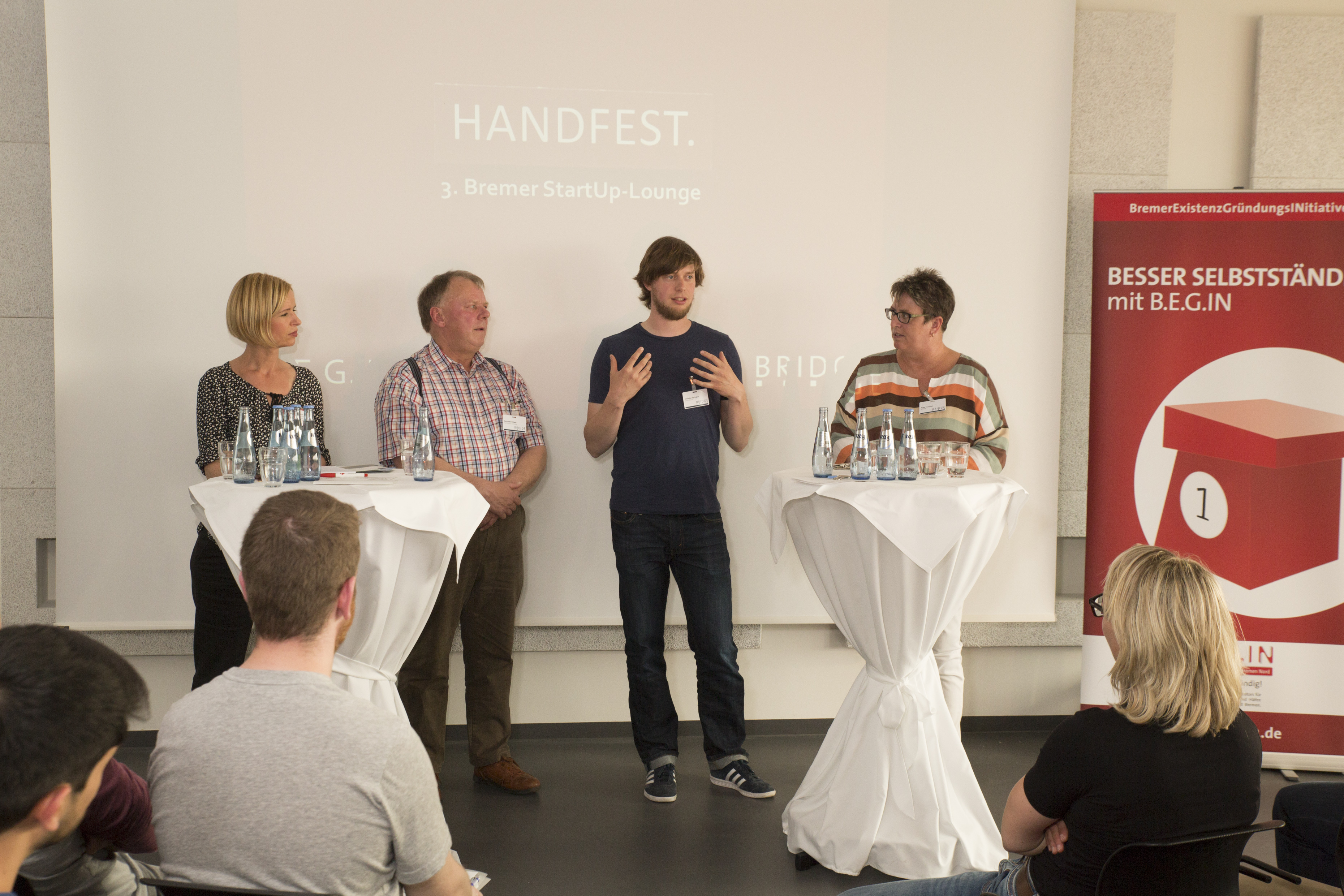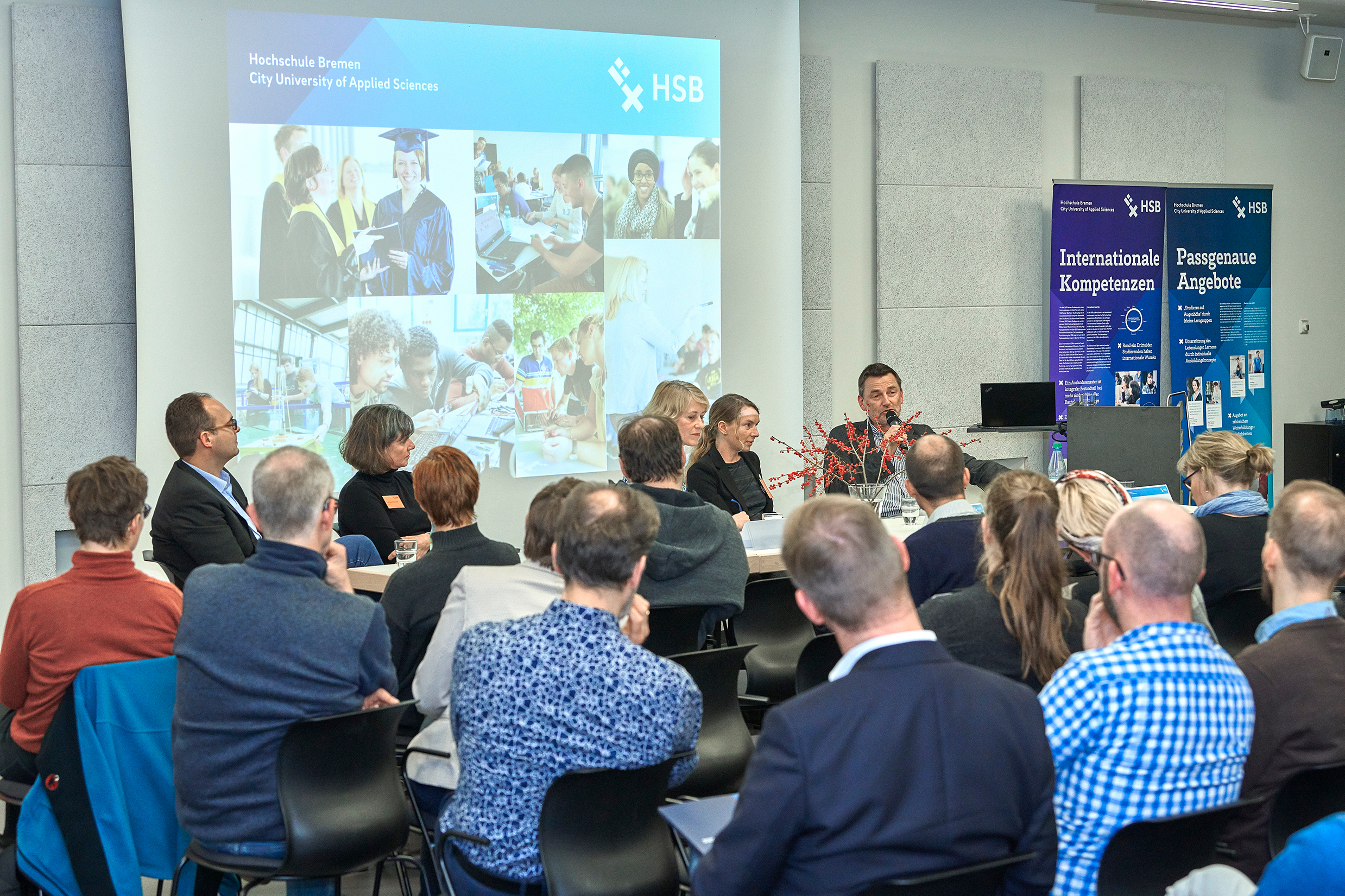 Zu sehen ist die Diskussionsrunde „Generation Y und Silver Workers“ (von links nach rechts): Jörg Pehl, Projektmanager „Demographischer Wandel“ bei ArcelorMittal, Guido Schwarz, Absolvent der Hochschule Bremen, Airbus Defence and Space, Dr. Leena Pundt, Professorin an der Hochschule Bremen für Personalmanagement, Margaret Heckel, Journalistin, Autorin und Moderatorin, und Imke Goller-Wilberg, Unternehmerin und Geschäftsführende Gesellschafterin von „human lead“ und Mitglied im Plenum der Handelskammer Bremen. Fotograf: Sven Stolzenwald