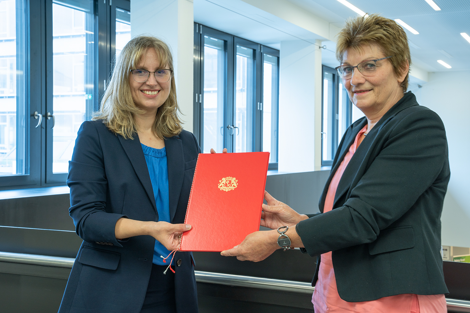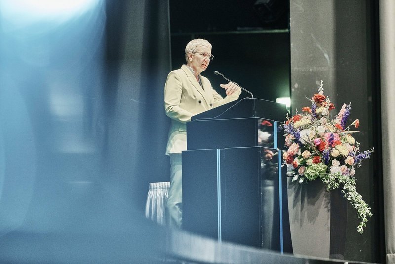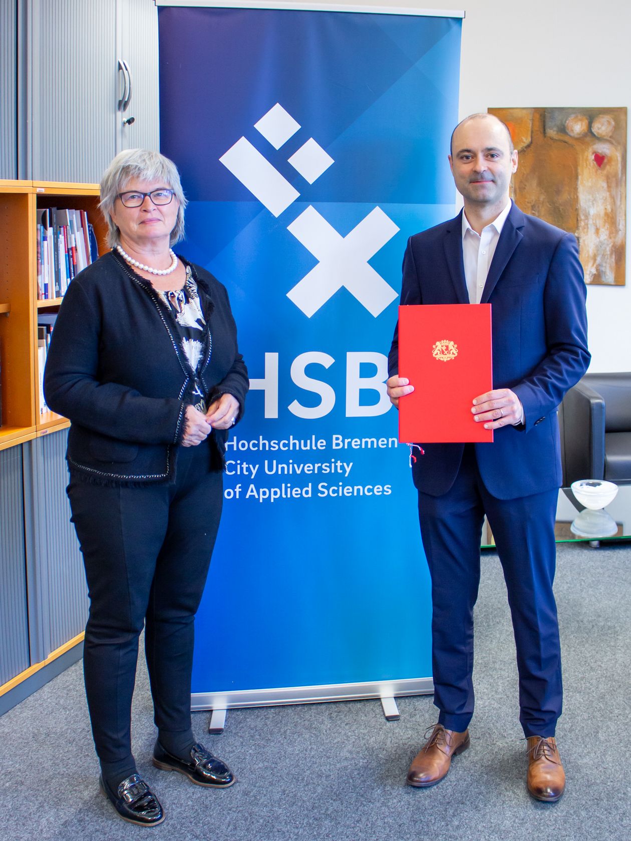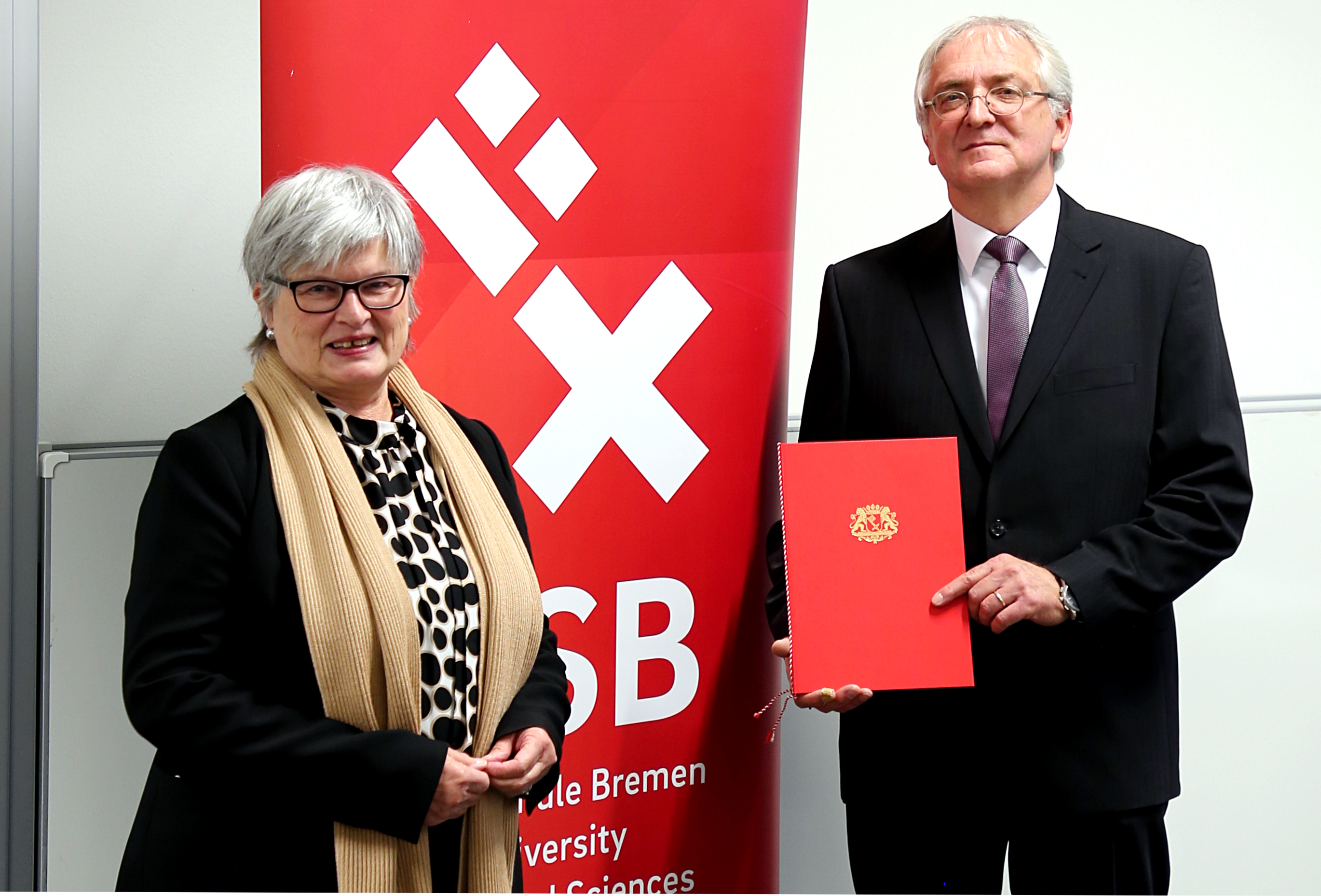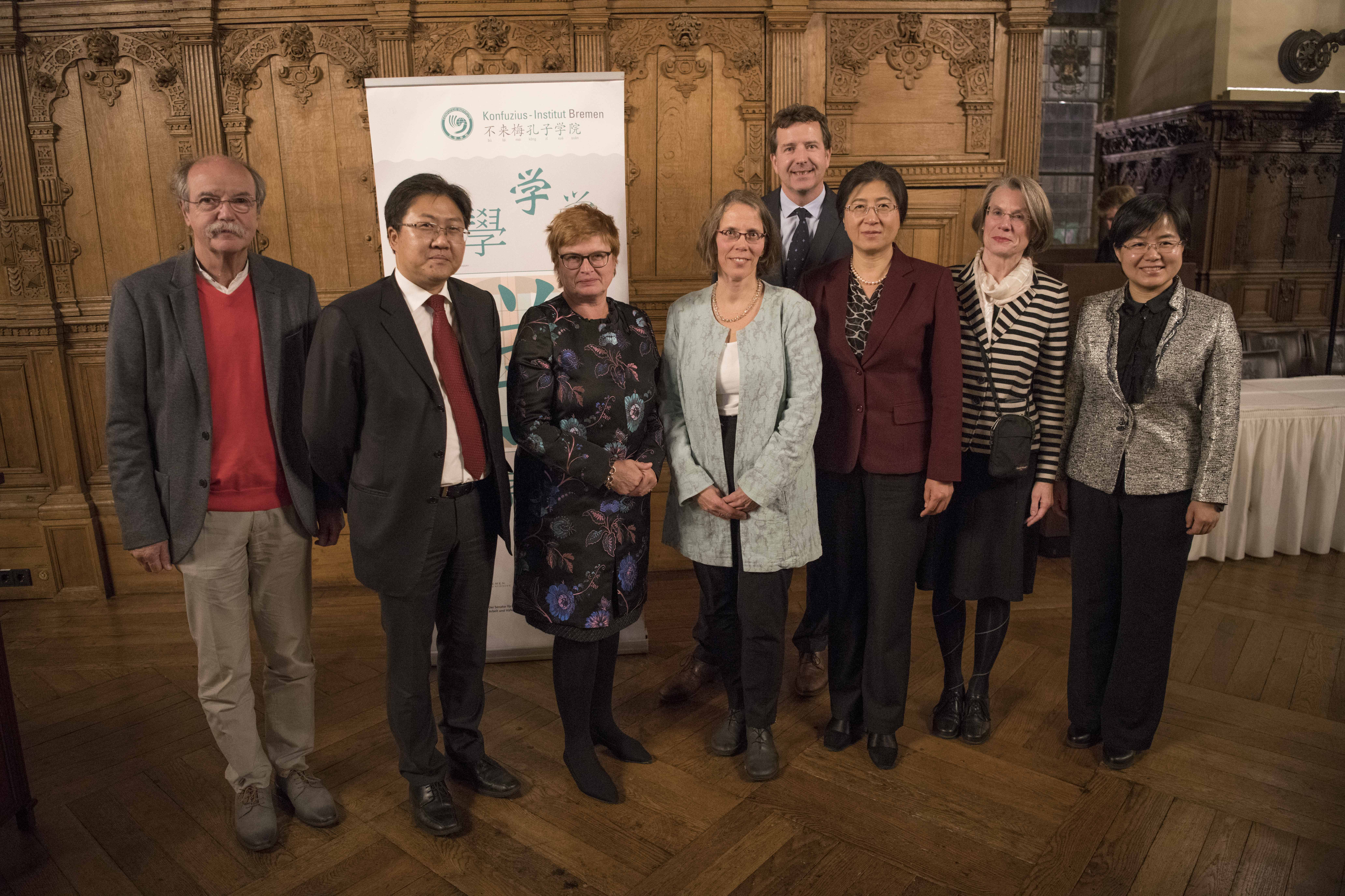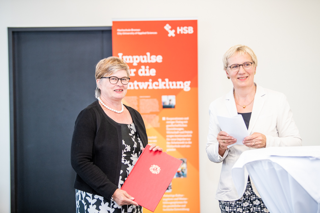 (v.l.n.r.:) Jutta Dernedde, Gesundheit Nord, Olaf Woggan, AOK Bremen / Bremerhaven, Wissenschafts- und Gesundheitssenatorin Prof. Dr. Eva Quante Brandt, Rektorin Prof. Dr. Karin Luckey, Dekan Prof. Dr. Christopher Klug, Prof. Dr. Wiebke Scharff Rethfeldt, ATW Logopädie, Dr. Christine Wendt, ATW-Programmkoordinatorin, und Prof. Dr. Axel Schäfer, AT