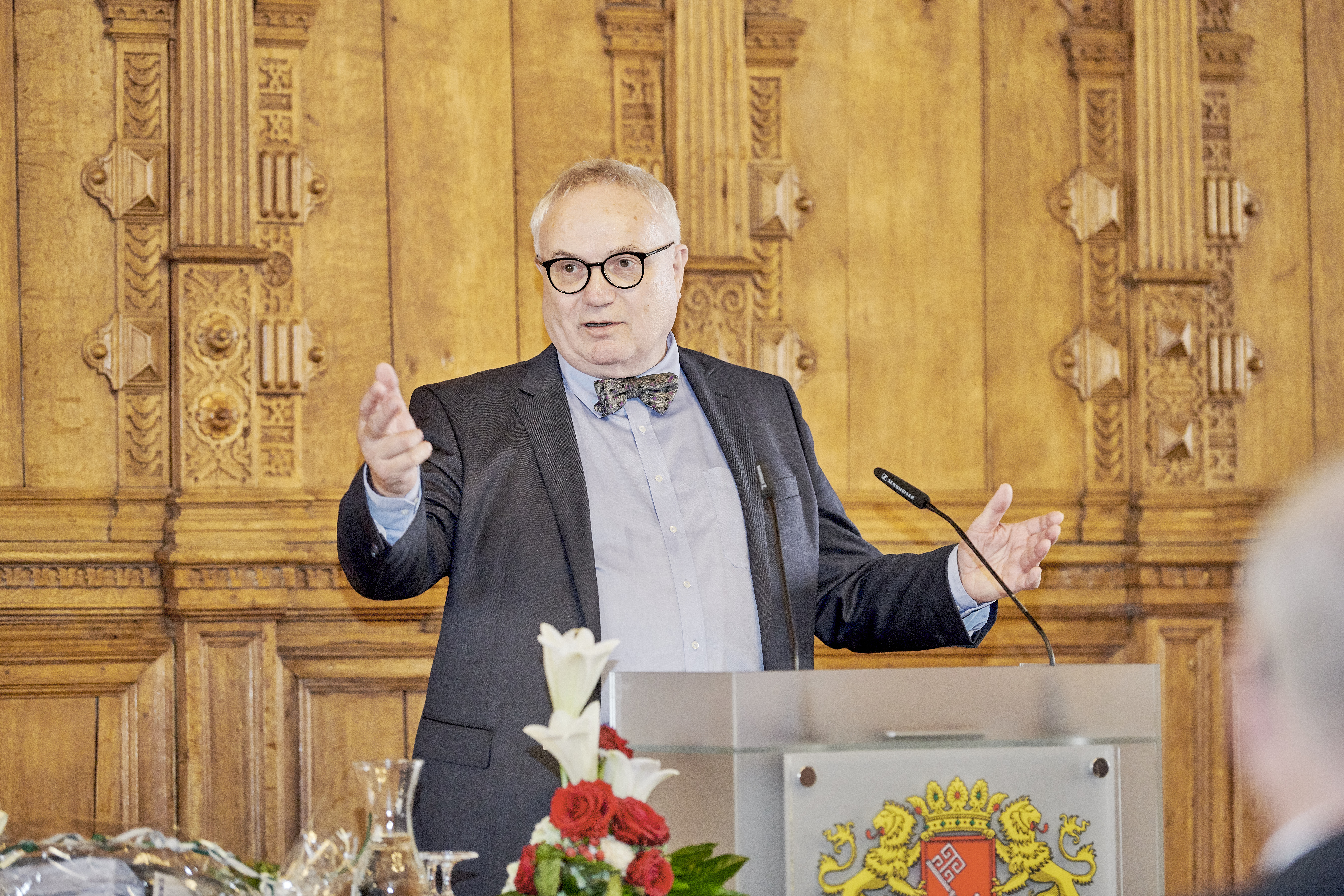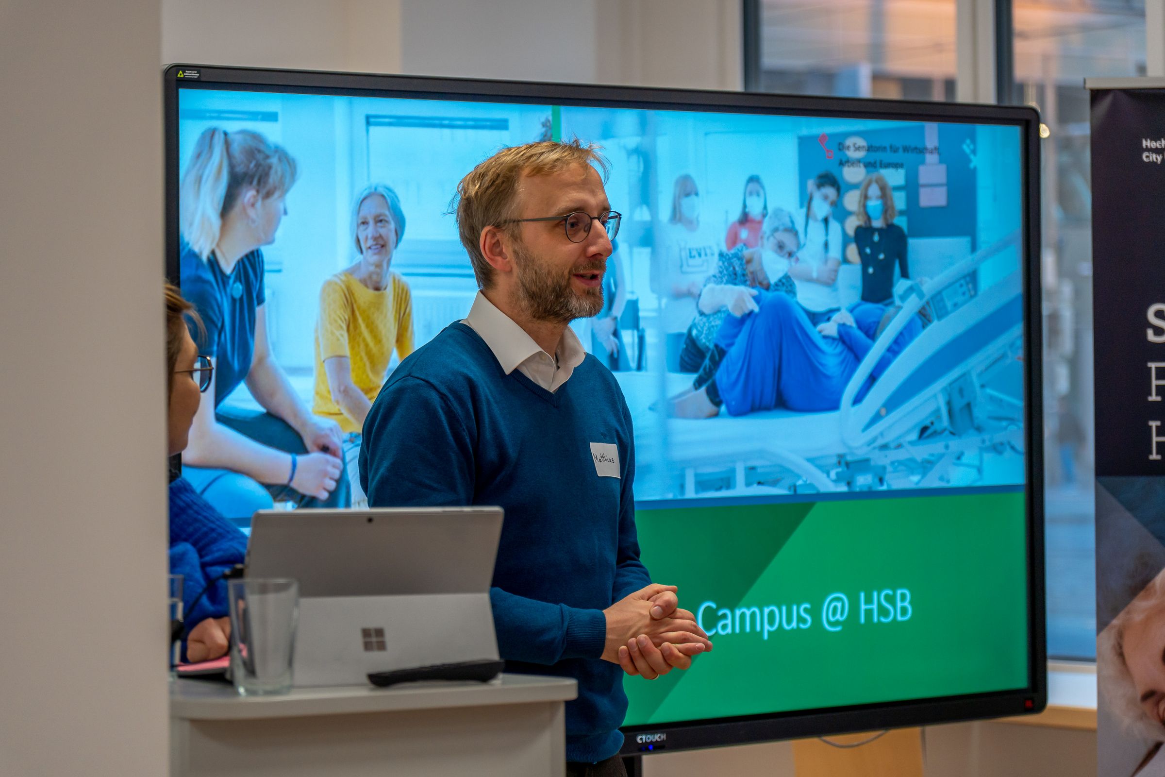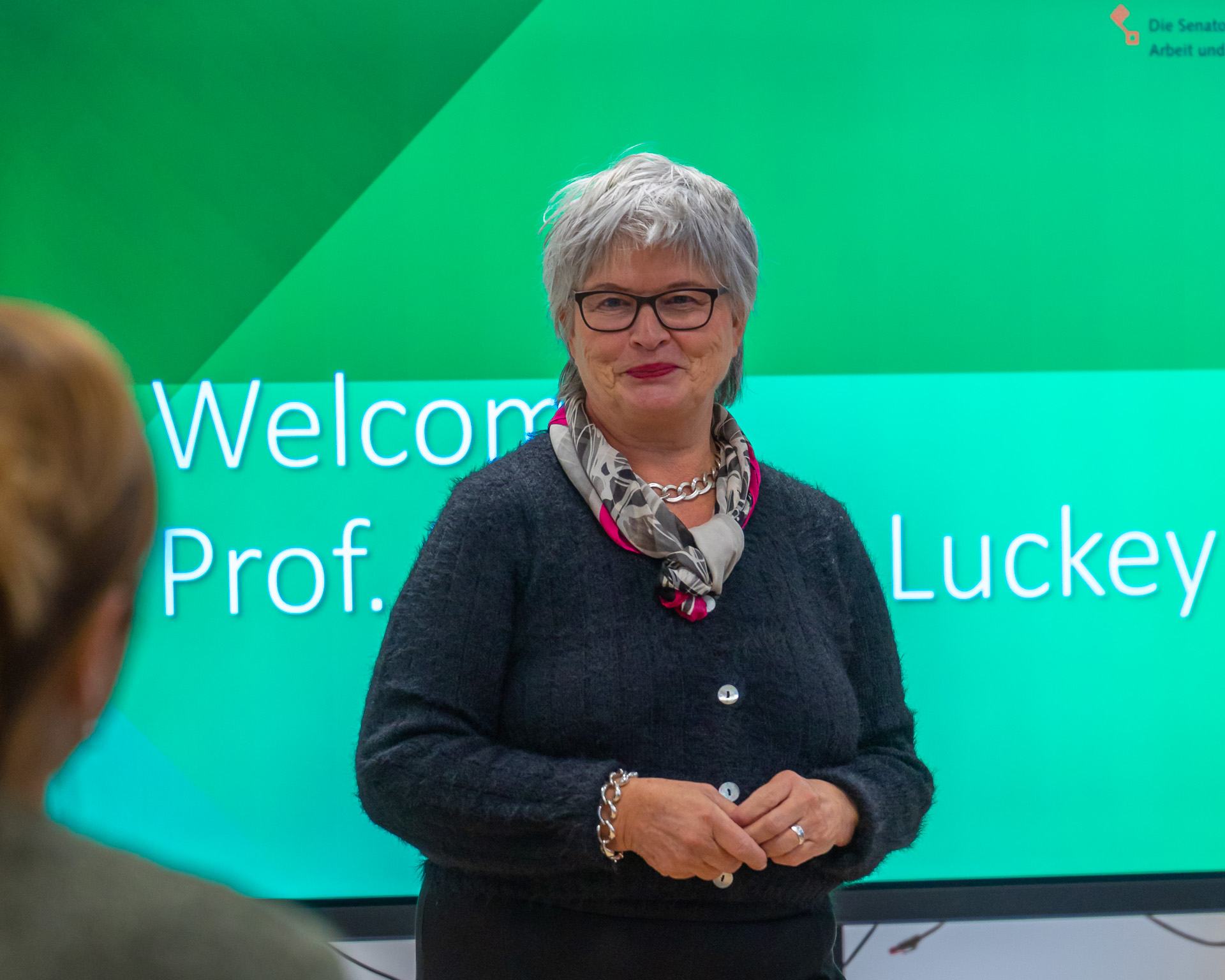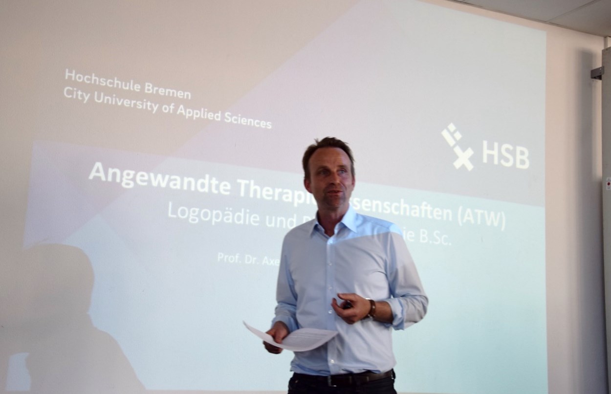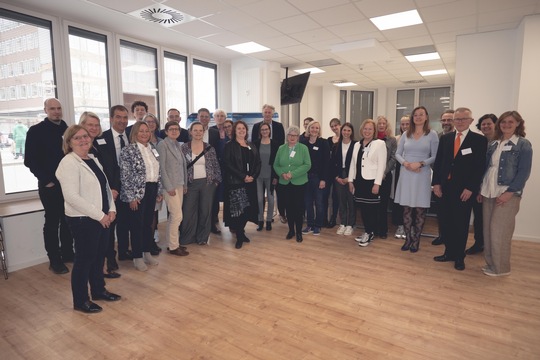 (v.l.n.r.:) Barbara Gätjen, Praxisinhaberin, Jutta Dernedde, Gesundheit Nord, Olaf Woggan, AOK Bremen / Bremerhaven, Wissenschafts- und Gesundheitssenatorin Prof. Dr. Eva Quante Brandt, Rektorin Prof. Dr. Karin Luckey, Ingo Schierenbeck, Arbeitnehmerkammer, Prof. Dr. Wiebke Scharff Rethfeldt, ATW Logopädie, Dekan Prof. Dr. Christopher Klug, Dr. Chr