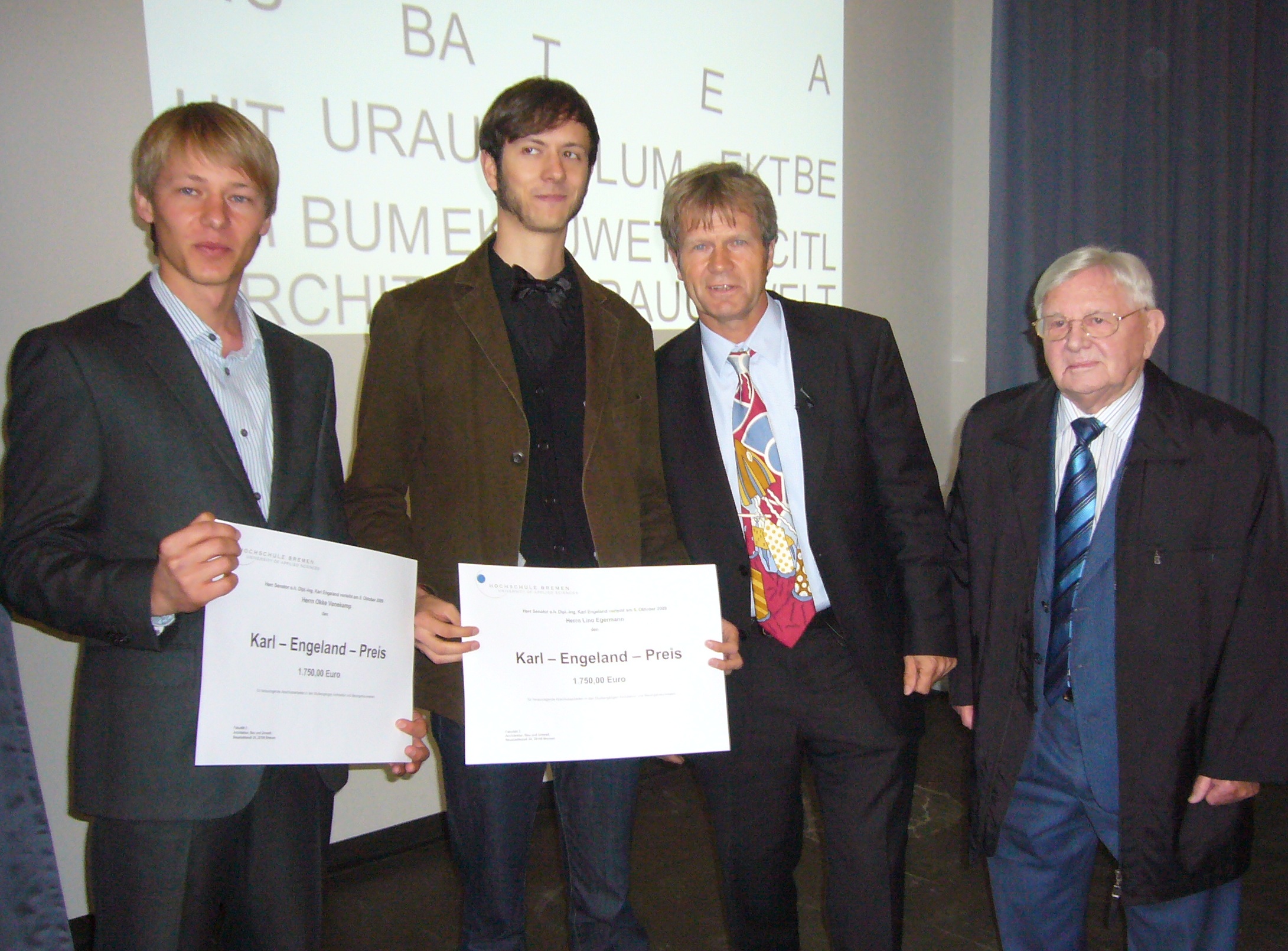 (pressebox) (Bremen, 29.10.2009) Die Fakultät Architektur, Bau und Umwelt an der Hochschule Bremen hat im Rahmen ihrer Erstsemesterbegrüßung im ehemaligen Kabawerk zum Beginn des Wintersemesters die Verleihung des diesjährigen "Karl-Engeland-Preises" gefeiert. Bereits im 15. Jahr wird der Preis in Höhe von 3.500 Euro von Herrn Karl Engeland für herausragende Abschlussarbeiten in den Studiengängen der Architektur und des Bauingenieurwesens gestiftet. Die Jurymitglieder Karl Engeland, Ehren-Senator der Hochschule Bremen, Dipl. Ing. Uwe Sabotke, Dipl. Ing. Harm Haslob, Prof. Katja-Annika Pahl und Prof. Dr. Carsten-Wilm Müller einigten sich in diesem Jahr auf zwei Preisträger, wobei Im Zuge der Jurysitzung die ausgesprochen hohe Qualität aller eingereichten Arbeiten von den externen Jurymitgliedern hervorgehoben worden.