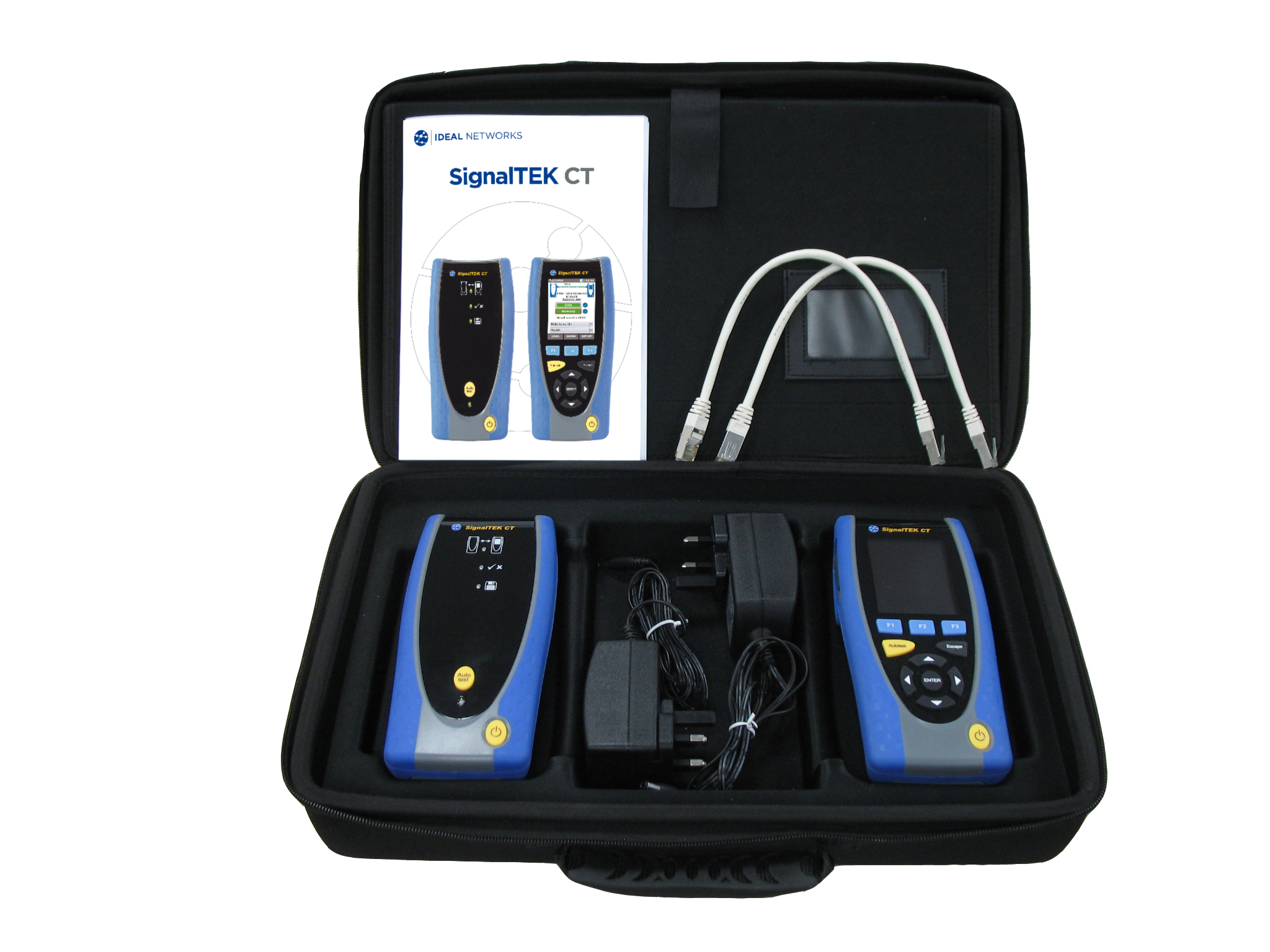 SignalTEK CT mit großem Farb-Display kommt mit Remote-Gerät, Akkus, Patchkabel, Netzteil mit Adaptern für EU, UK und USA im Tragekoffer.