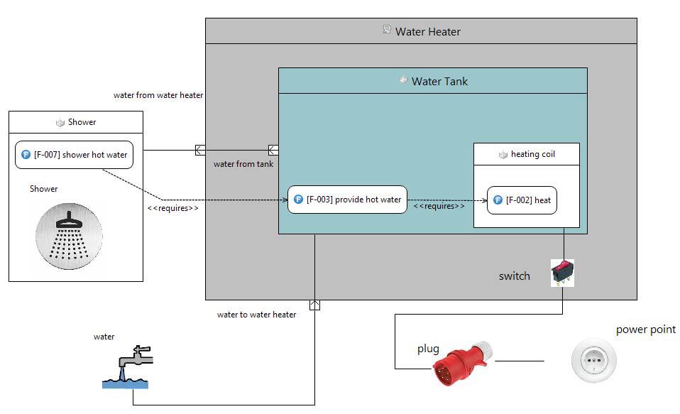 In dem im Bild dargestellten Beispiel eines Wassererhitzers sind im Systemmodell die Systemkomponenten, ihre hierarchische Struktur sowie die Verbindungen zwischen den Systemkomponenten enthalten