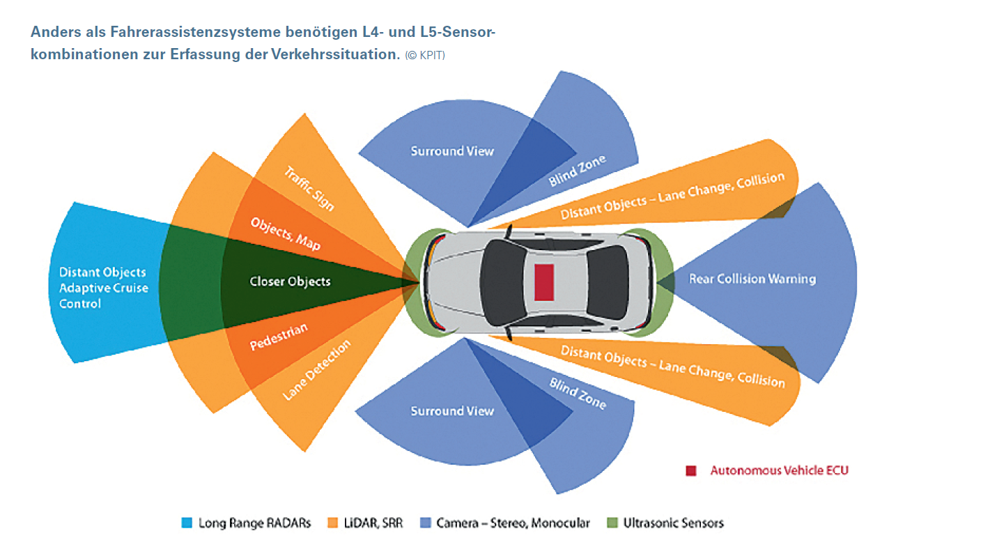 Anders als Fahrerassistenzsysteme benötigen L4- und L5-Sensorkombinationen zur Erfassung der Verkehrssituation. (© KPIT)