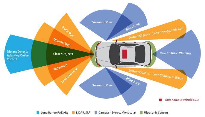 Figure 2: While Advanced Driver Assistance Systems only require a subset of those sensors, Level 4 and L5 make intensive usage of combining sensors to capture the traffic situation