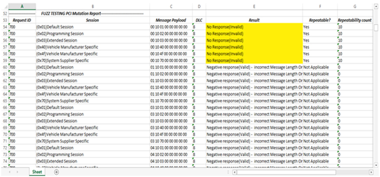 At the end of the Fuzz Testing process, a list of vulnerabilities is generated, which are responses that are neither negative nor positive according to [1] ISO 14229-1. This is achieved by developing data analysis-based algorithms for the report module. The algorithm applies data analysis techniques on positive test suite and ECU response for identifying anomalies that are then reported in an excel sheet. All the valid responses are also logged, and the anomalies are highlighted. Figure 4 shows the anomalies highlighted in yellow. The report consists of arbitration id, sessions, mutated payload and DLC, and the result.