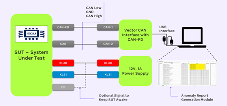 The process started by identifying the UDS over CAN port/ OBD-II port and proceed with a hardware setup. For the hardware set up, we supplied the correct voltage, connected the SUT with our laptop using a USB 2 CAN protocol converter. For the purpose of setting criteria, monitoring, altering, and analyzing the packets, we have developed CAPL scripts.