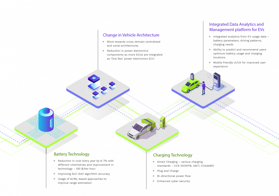 Such statistics are driven as much by exogenous factors – climate change, stringent global CO2 regulations, fast-depleting fossil fuels, and shifting demand for more sustainable products – as by innovations in Battery and Charging Technologies, integration of Power Electronics, along with the emergence of Data Analytics. Here’s how.