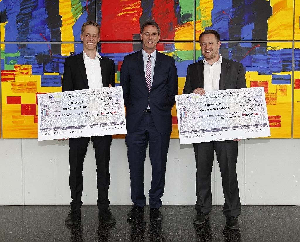 (pressebox) (Bad Nauheim, 22.07.2015) Am 19. Juni 2015 fand die Preisverleihung zur Auszeichnung der besten Abschlussarbeiten des Studiengangs Wirtschaftsinformatik an der TH Mittelhessen in Friedberg statt. Bereits seit einigen Jahren stiftet die in Bad Nauheim ansässige inconso AG den Preis für die Kategorie "IT-Systeme in der Logistik". Die Auszeichnung ging in diesem Jahr an gleich zwei Gewinner. Marek Siudmak überzeugte mit einer Arbeit zur Verbesserung der Kommissionierung in einem Lagerverwaltungssystem; Tobias Böhm beeindruckte mit einem neuen Einsatzkonzept zur optimierten Rangieranweisung von Güterwaggons.