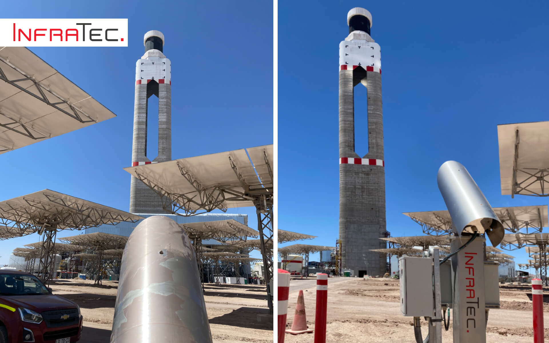 (pressebox) (Dresden, 06.05.2021) Solar power plants usually suffer from the disadvantage that they only supply energy when the sun is shining during the day. CSP (Concentrated Solar Power) solar tower power plants are different: they charge a large thermal buffer storage during the day, which allows the continuous generation of electrical energy also at night-time. One of these solar tower power plants recently went into operation in the middle of the Atacama coastal desert in Chile. It is the sunniest and driest desert on earth. The extreme climatic conditions prevailing in this region place high demands on the technology used there, including the eight thermographic cameras from InfraTec.