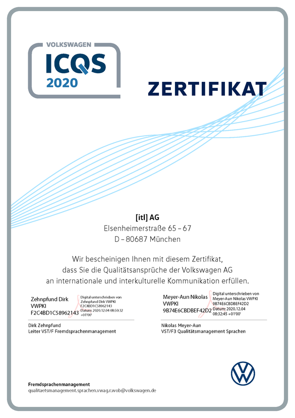 Die Volkswagen AG und die itl AG arbeiten seit dem Jahr 2014 im Bereich Übersetzungsdienstleistungen zusammen. Diese Kooperation umfasst neben den naheliegenden Anforderungen an einen Sprachdienstleister, wie sie die ISO-Norm 17100 vorgibt, auch das gesamte Umfeld der Informationssicherheit. Hierfür hat sich die itl AG nach einem Zwischenschritt über eine Volkswagen-interne Lösung schließlich dem Prozedere einer TISAX-Zulassung unterzogen und diese auch auf Anhieb erhalten.
