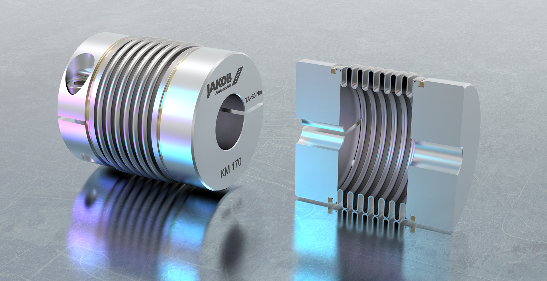 (pressebox) (Kleinwallstadt, 20.04.2020) It has proven itself on the market for decades and is a tried and tested standard series of metal bellows couplings: The metal bellows coupling KM from JAKOB Antriebstechnik. Like all metal bellows couplings, it is stiff in the direction of rotation, but flexible in the axial, angular and radial directions. Despite the similarities, however, metal bellows couplings sometimes differ greatly from each other. The technical differences are, for example, in the choice of the bellows or the connection of bellows and hub or bellows and shaft. JAKOB uses only thin-walled, multi-layered bellows made of certified stainless steel sheets. This causes a high torsional stiffness, which ensures high positioning accuracy and concentricity even under difficult conditions, which guarantees absolutely backlash-free torque transmission between the input and output shafts. The multi-layer bellows design also causes the absorption capacity of large shaft displacements with still small restoring forces. This means an increase in reliability, safety and service life.