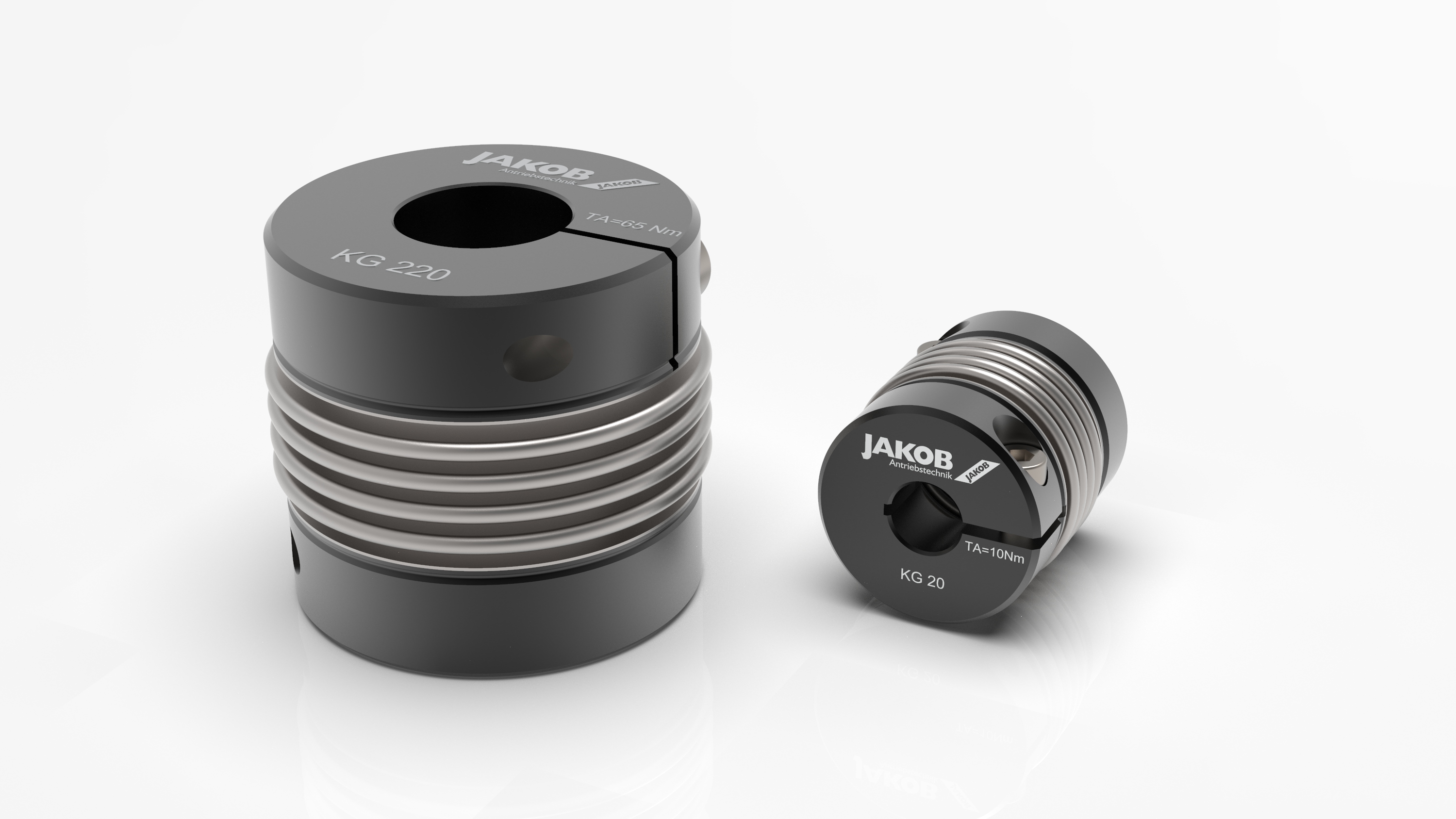 (pressebox) (Kleinwallstadt, 30.08.2021) The long-proven metal bellows couplings of the 'KG' and 'MKG' series from JAKOB Antriebstechnik have burnished hubs, which offer improved rust protection and greater resistance to environmental influences. This type of surface refinement is not an overlying layer such as nickel plating, chrome plating or painting, but a chemical reaction with the material. The substrate conversion does not change the dimensions and tolerances of the component. The couplings are available for torque ranges from 2 Nm (MKG) to 3000 Nm (KG). They can be used at temperatures from -40 ° C to + 350 ° C. Alternatively, the metal bellows coupling are also available in stainless steel as 'KG-VA' and 'MKG-VA'.