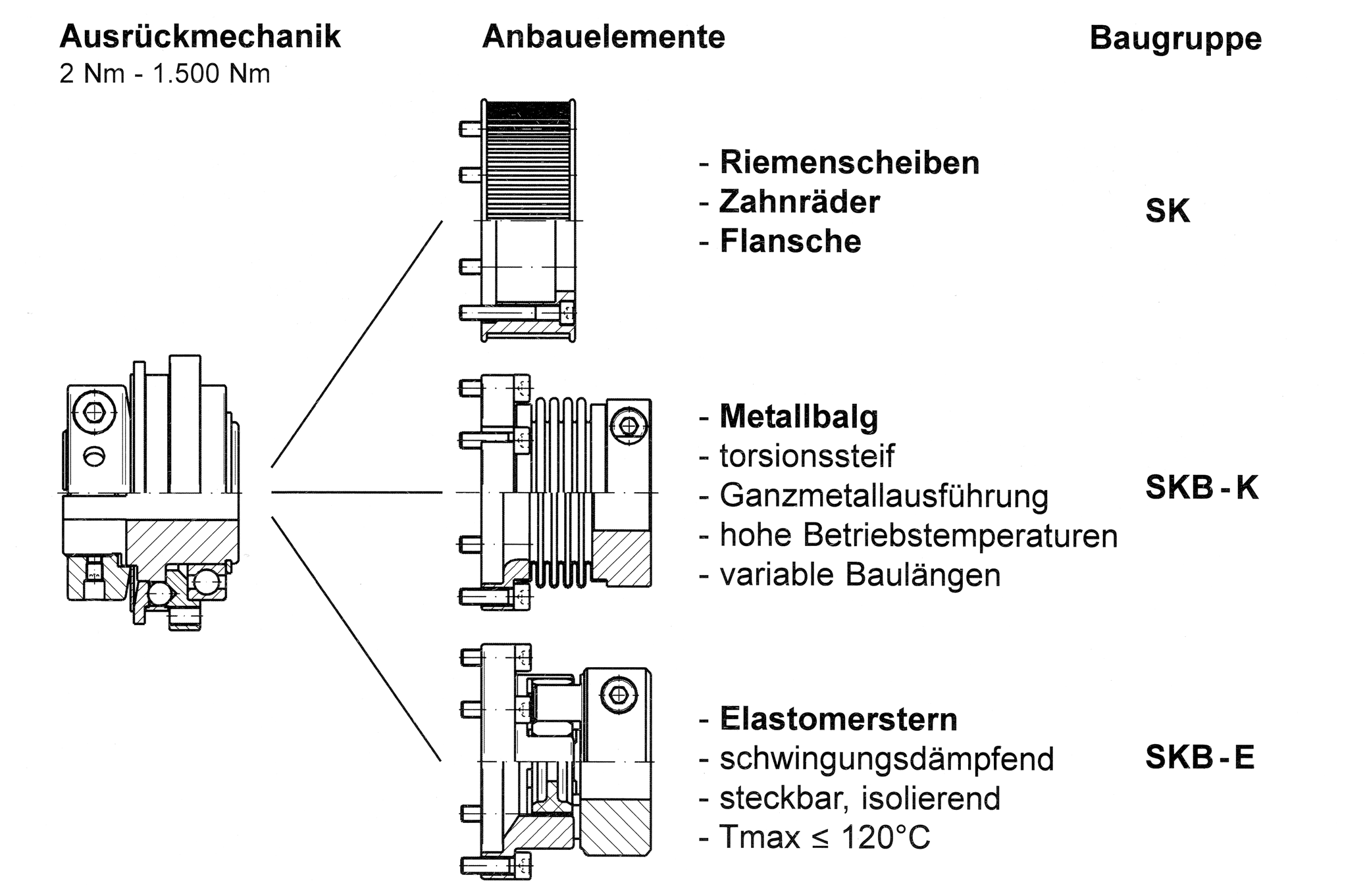 Neben den dauernd wirkenden Kräften können einmalige, zerstörerische Kräfte, ausgelöst durch fehlerhafte Bedienung oder besondere äußere Einwirkungen, ganze Fertigungsanlagen schlagartig für längere Zeit still stellen. Auch kleine, kompakte Motoren können aufgrund ihrer hohen Drehzahl bei einer Kollision Kräfte entwickeln, die große Schäden verursachen. Eine Ausrückmechanik, geeignet zur Integration an die verschiedenen Servokupplungen erweitern diese "Standardkupplungen" zu Sicherheitskupplungen.