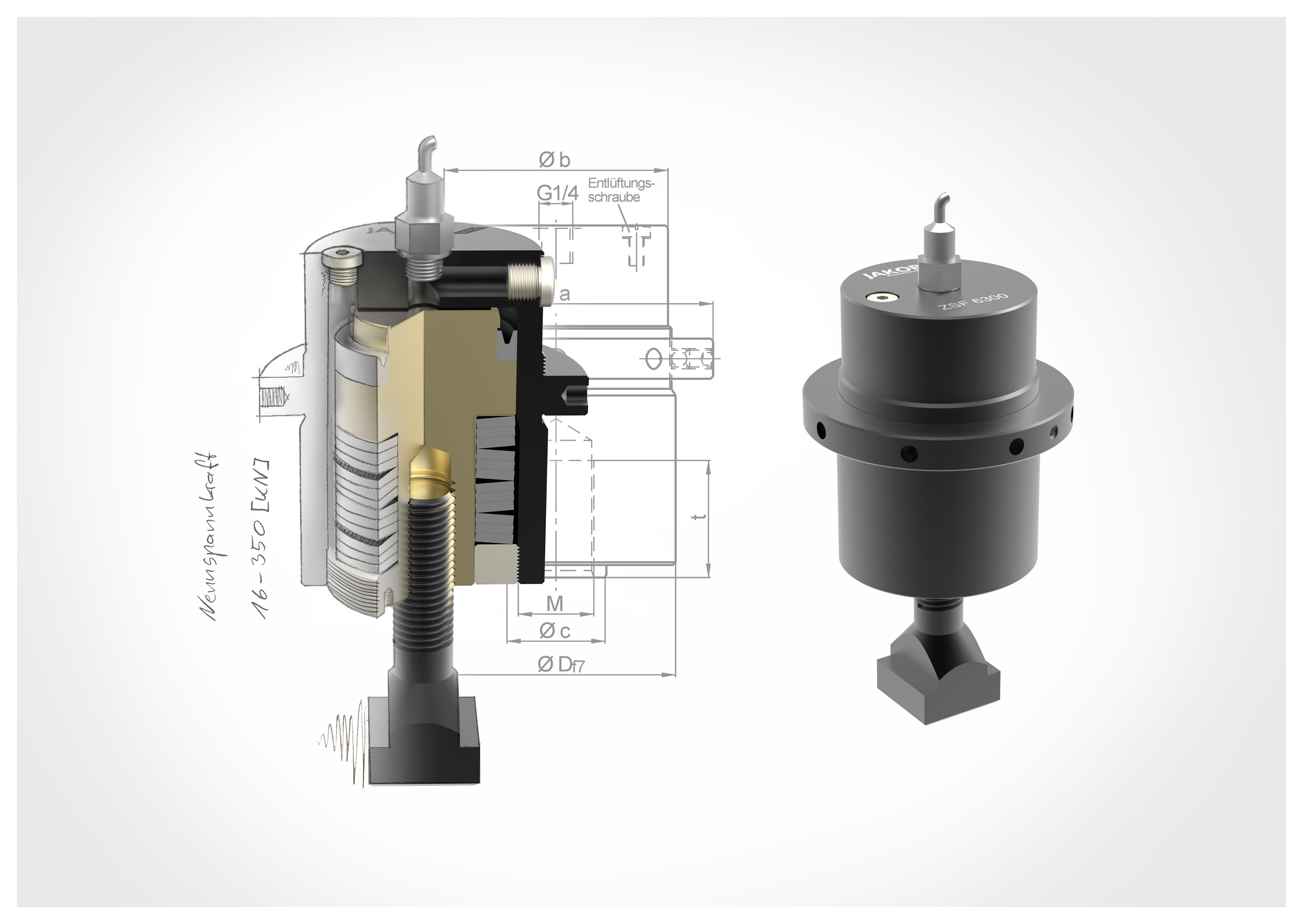 The spring-loaded systems interact mechanically-hydraulically. The clamping force is applied mechanically by a prestressed plate spring package. The hydraulics are only needed for the release stroke of the elements, whereby the tie rod or pressure pin is released. This system ensures a high level of operational safety, since the clamping force is always maintained at full height, regardless of oil pressure or leakage losses. In the operation the pressure or tension piston is alternately acted upon by the plate spring package or the hydraulic pressure. This means that the spring pack is compressed with increasing oil pressure, the spring force increases. At set pressure, the corresponding nominal clamping force is achieved as the reaction force of the plate spring package. To release the pressure or tension piston, a higher hydraulic pressure is required, which is proportional to the release stroke up to a maximum value. This means that the setting pressure is required only for the initial installation for exact force adjustment. In the actual operating cycle, the cylinders are driven either without pressure or with release pressure. For spring-loaded cylinders, a mandrel or tie rod is screwed into the threaded hole of the tensioning piston and secured (on request, in one piece or with special thread). Operation requires a hydraulic unit that should be equipped with a pressure gauge, a pressure relief valve, a switching solenoid valve and a pressure switching device.