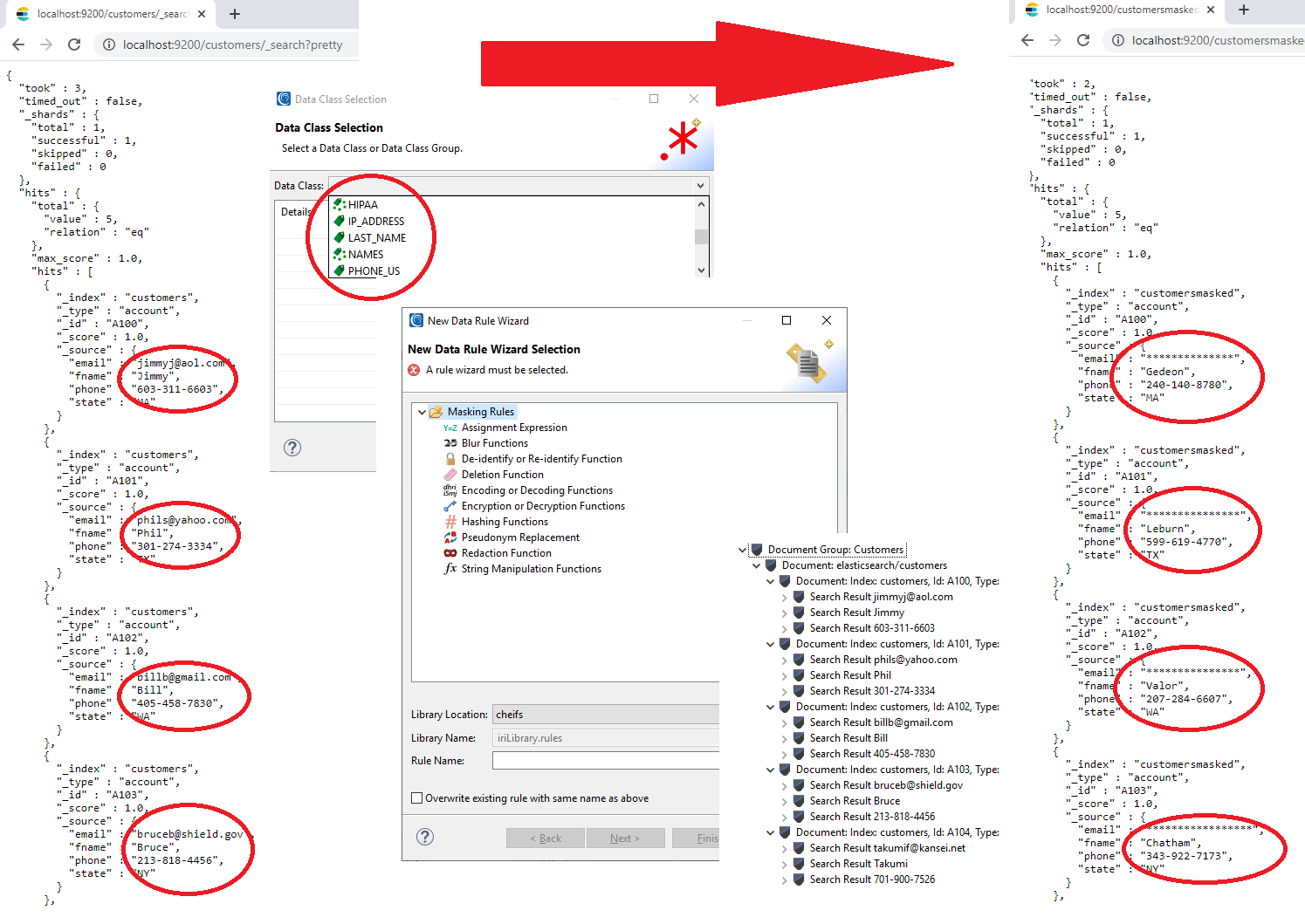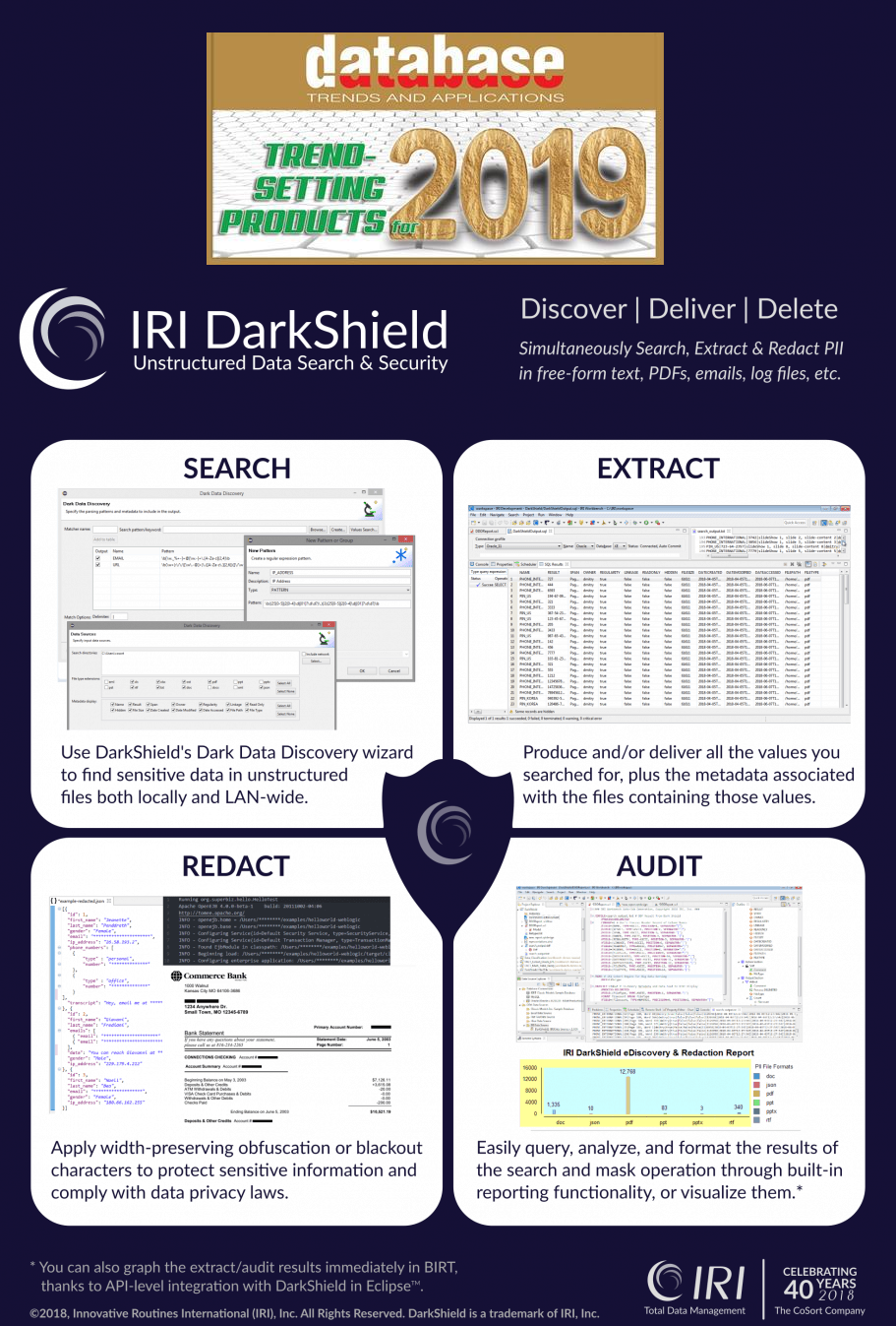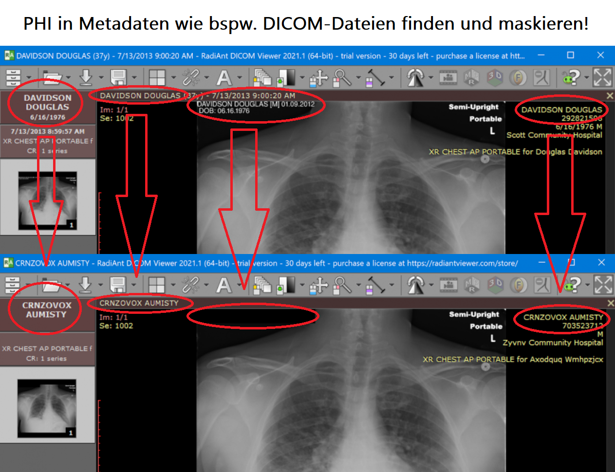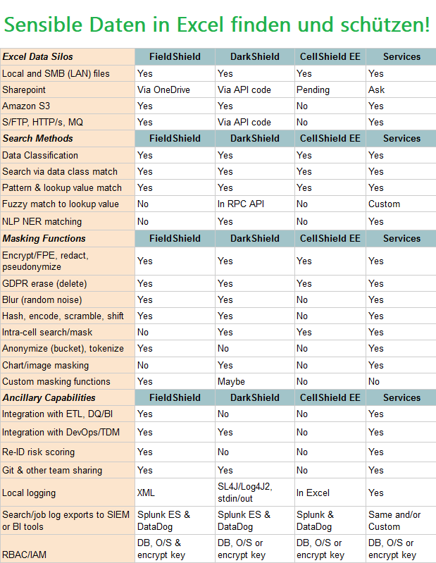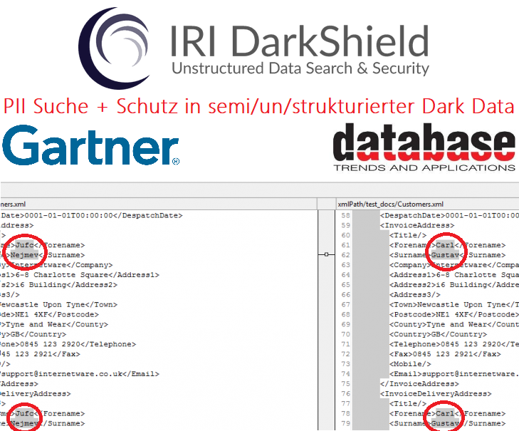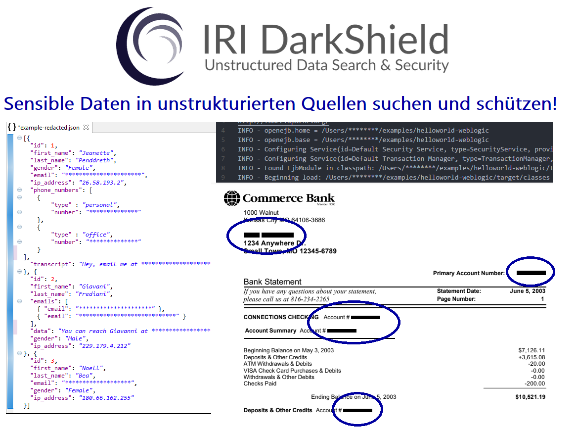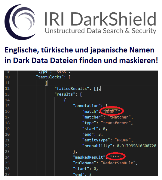 Mit Hilfe der DarkShield-Files-API können halbstrukturierte und unstrukturierte Daten wie einfache Textdateien, CSV/TSV, HL7/X12, Word, Excel, PDF, JSON, XML, Parquet, BMP, GIF, JPG, PNG, TIF und DICOM-Bilder durchsucht und maskiert werden.