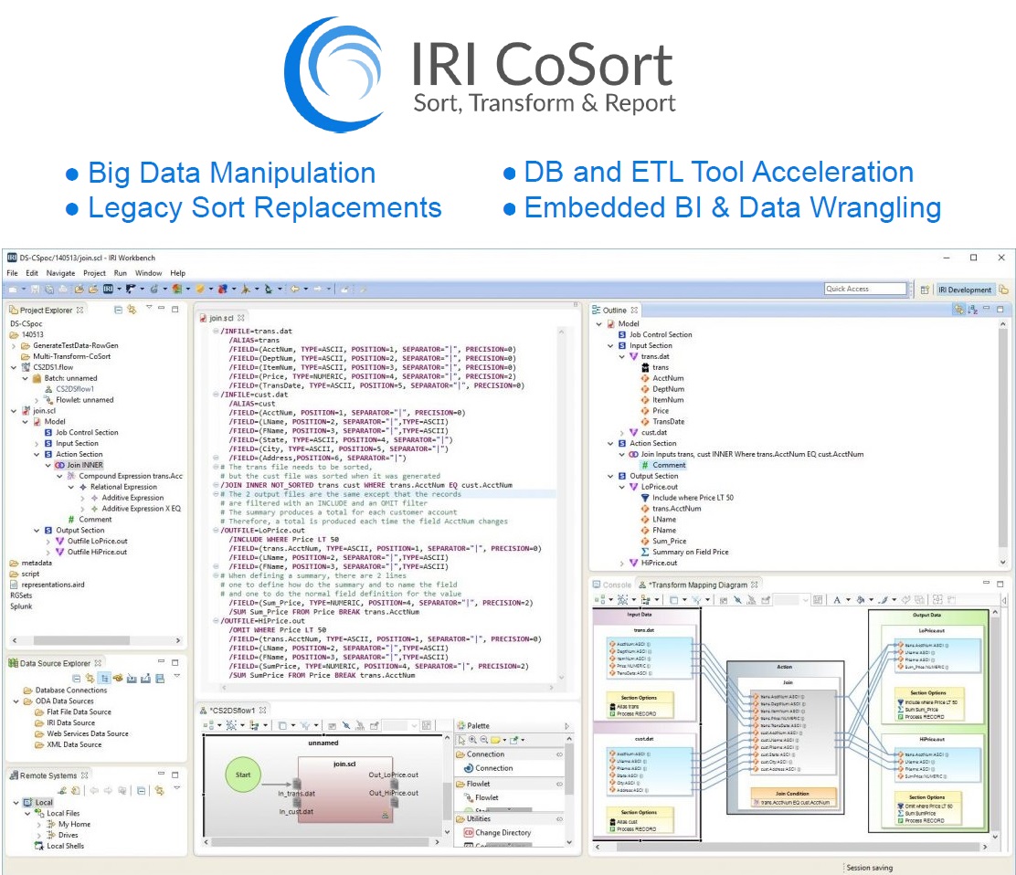 Genau hier kommt IRI CoSort ins Spiel: Mit seiner hochperformanten In-Memory-Architektur und parallelisierten Verarbeitung beschleunigt IRI CoSort komplexe Aufgaben wie Sortieren, Zusammenführen, Aggregieren und Maskieren erheblich. Die direkte Verarbeitung im Speicher sorgt dafür, dass Ihre Integrations- und Bereinigungsprozesse deutlich weniger Zeit in Anspruch nehmen.