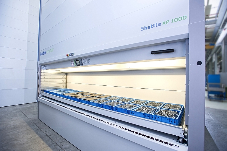 Im Lagerlift Shuttle XP 750 werden bei Engel Elektroantriebe Komponenten für die Motorenfertigung sicher eingelagert