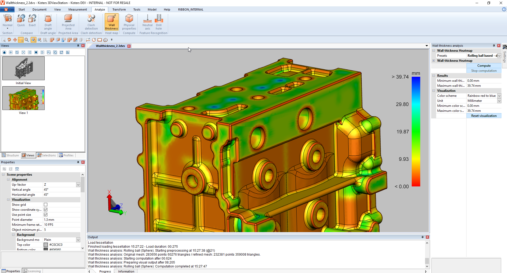Meist wird erwartet, dass fortgeschrittene Analysemethoden nur bei CAD-Systemen zu finden sind. Aber die KISTERS 3DViewStation beweist, dass das nicht so sein muss und bietet diese zu einem niedrigen Preis an. Es gibt zum einen eine Wandstärkenanalyse, die das analysierte Bauteil entsprechend der Wandstärke an der jeweiligen Stelle farblich abgestuft darstellt. Zum anderen ist diese Funktion so schnell, dass sie auch als Echtzeit-Messfunktion implementiert wurde.